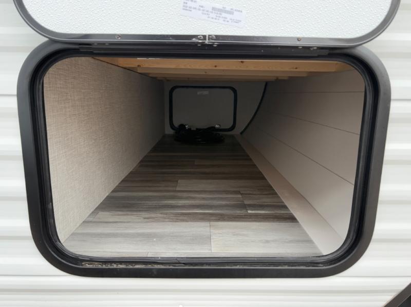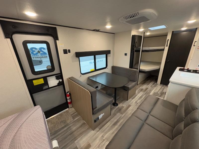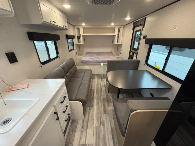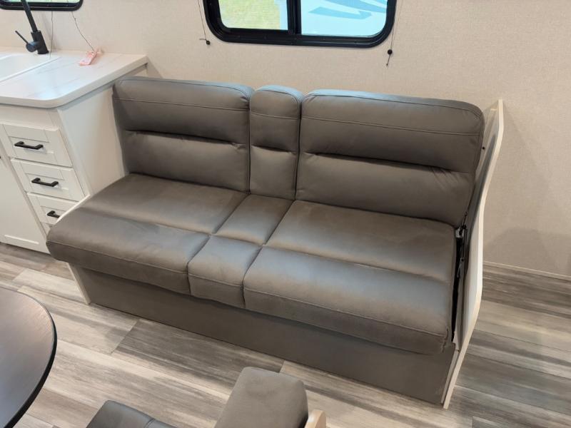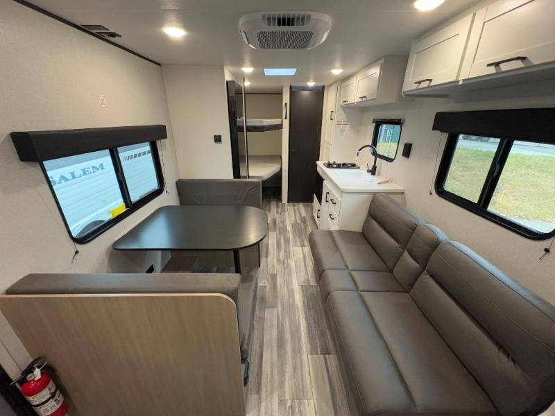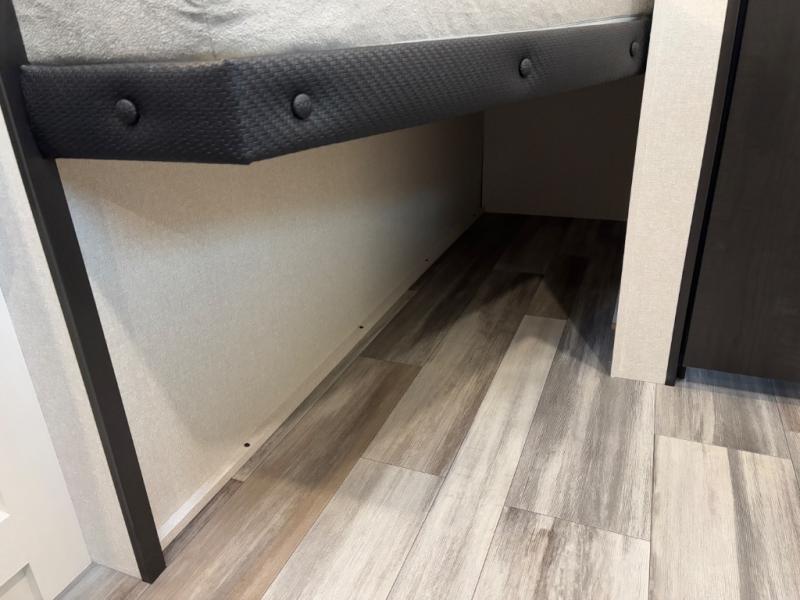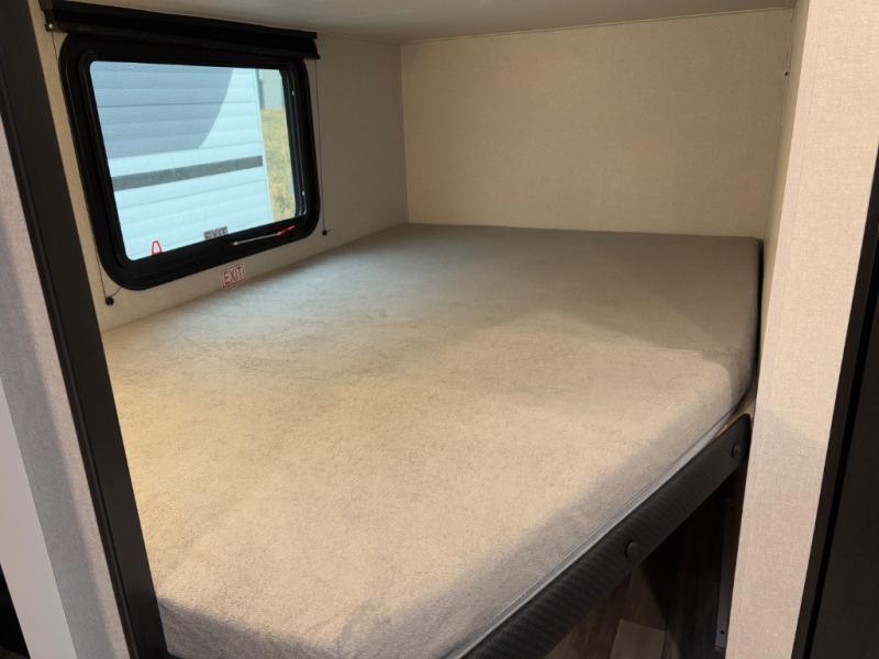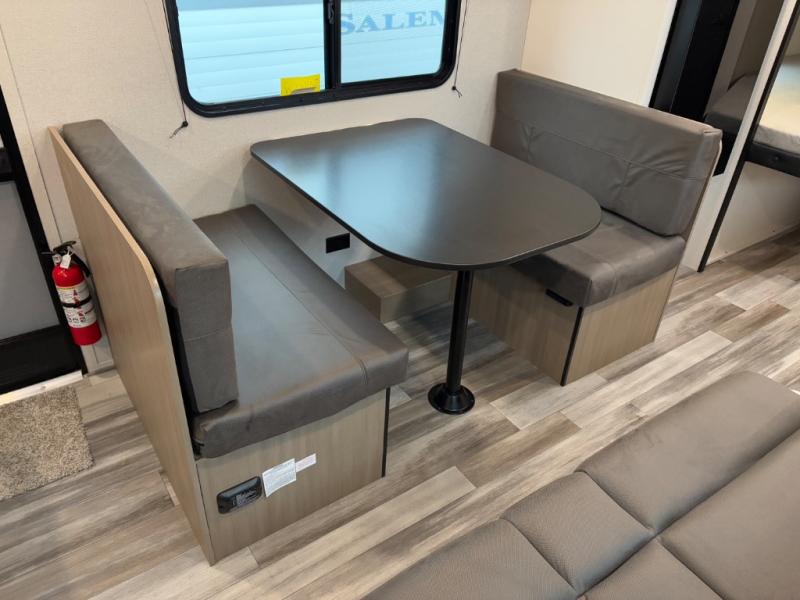You can comfortably sleep eight to ten people in this trailer thanks to the double-size bunks, the 60" x 80" queen bed in the front bedroom, plus the booth dinette and jack-knife sofa in the main living area! The chef of your crew will have a two burner cooktop and microwave oven to prepare meals, and everyone can store their favorite drinks in the 12V refrigerator. The bathroom includes a 40" shower and a toilet, with the sink just outside of this room so others can brush their teeth if one is taking a shower before bed. The outside storage will let you bring along fishing poles and the 12' power awning will create a nice place to gather in the evenings!