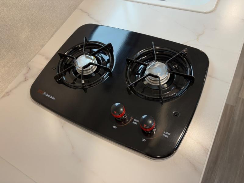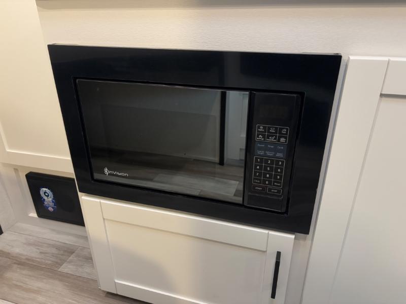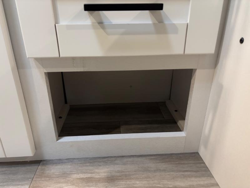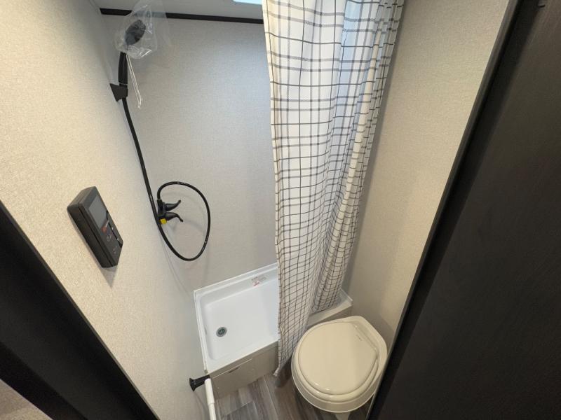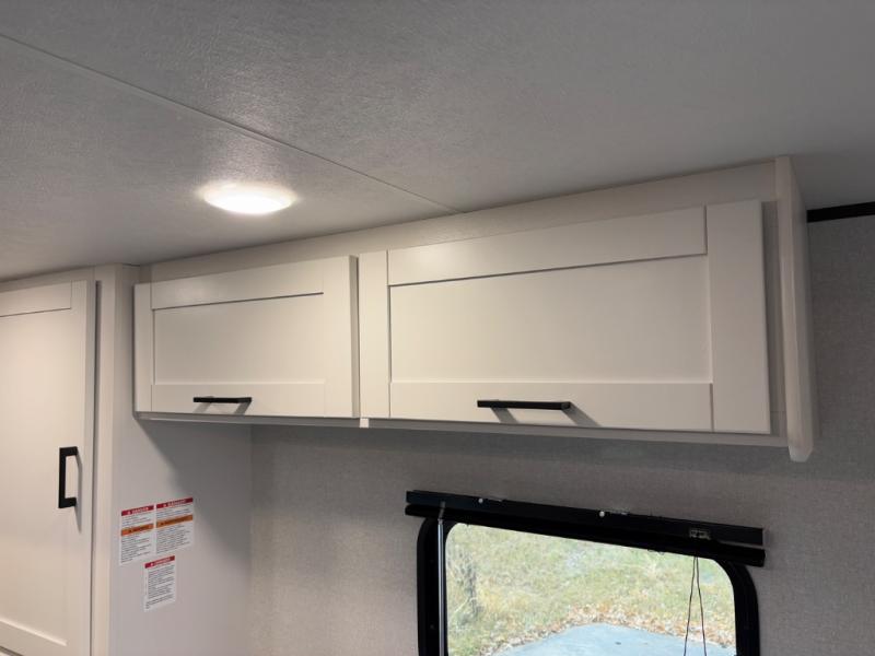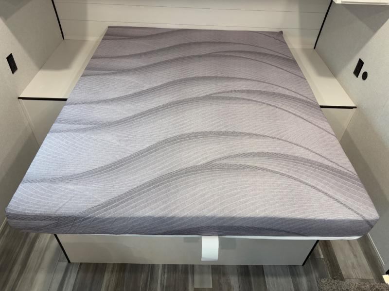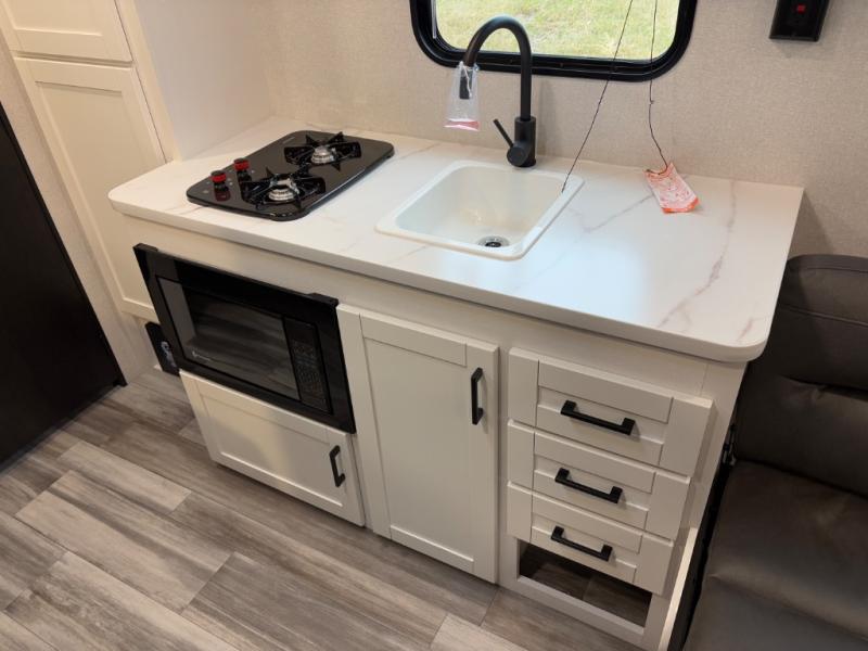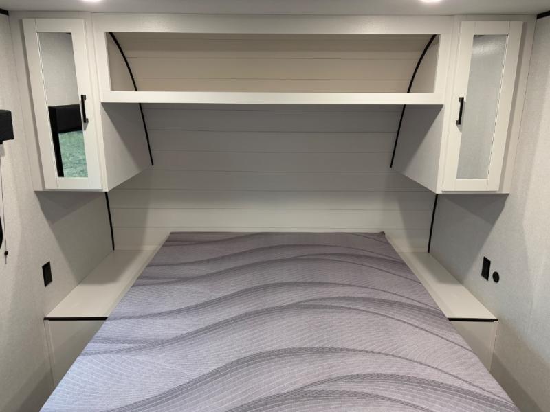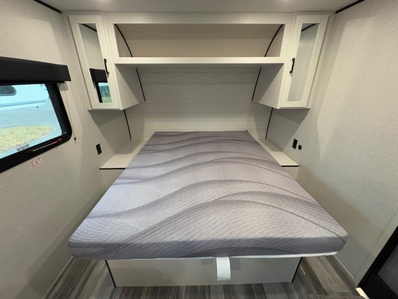 You can comfortably sleep eight to ten people in this trailer thanks to the double-size bunks, the 60" x 80" queen bed in the front bedroom, plus the booth dinette and jack-knife sofa in the main living area! The chef of your crew will have a two burner cooktop and microwave oven to prepare meals, and everyone can store their favorite drinks in the 12V refrigerator. The bathroom includes a 40" shower and a toilet, with the sink just outside of this room so others can brush their teeth if one is taking a shower before bed. The outside storage will let you bring along fishing poles and the 12' power awning will create a nice place to gather in the evenings!