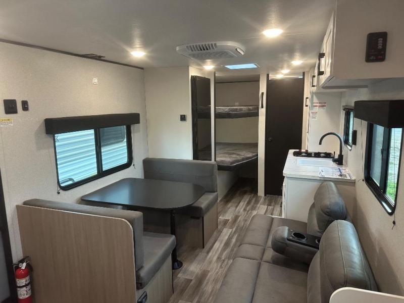 You can comfortably sleep eight to ten people in this trailer thanks to the double-size bunks, the 60" x 80" queen bed in the front bedroom, plus the booth dinette and jack-knife sofa in the main living area! The chef of your crew will have a two burner cooktop and microwave oven to prepare meals, and everyone can store their favorite drinks in the 12V refrigerator. The bathroom includes a 40" shower and a toilet, with the sink just outside of this room so others can brush their teeth if one is taking a shower before bed. The outside storage will let you bring along fishing poles and the 12' power awning will create a nice place to gather in the evenings!