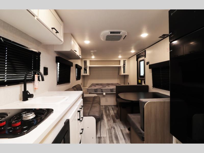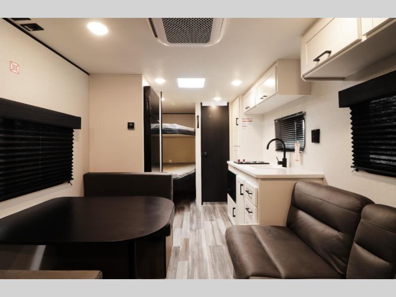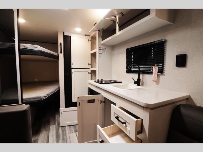 The 2026 Jay Flight SLX 250BH Sport features a spacious, family-oriented bunkhouse floorplan that comfortably sleeps up to 8 people, making it ideal for families, guests, and group adventures. Double over double rear bunk beds provide roomy sleeping space for kids and adults alike, while the private front queen bedroom offers a quiet retreat after a long day of exploring. The booth dinette and jackknife sofa easily convert into additional sleeping areas, maximizing space and flexibility for travel, camping, and extended stays. The fully equipped kitchen includes a residential-style microwave, two-burner cooktop, refrigerator, deep sink, and ample cabinetry so you can prepare meals on the road just like at home. A private bathroom with shower and foot-flush toilet adds convenience and comfort, especially for families and first-time RV owners who want self-contained travel freedom without relying on campground facilities.