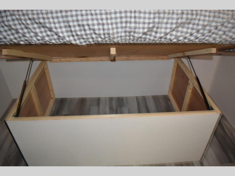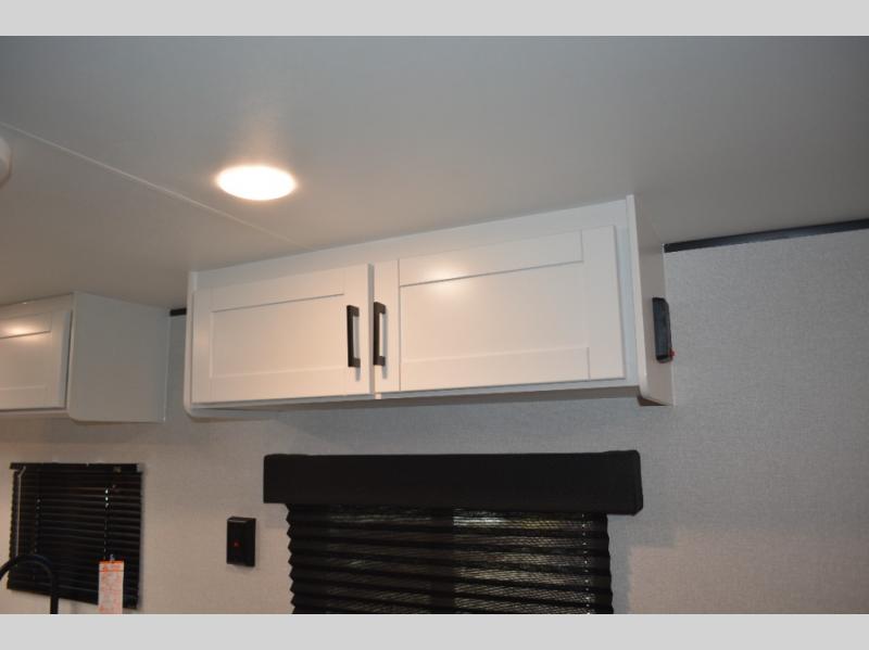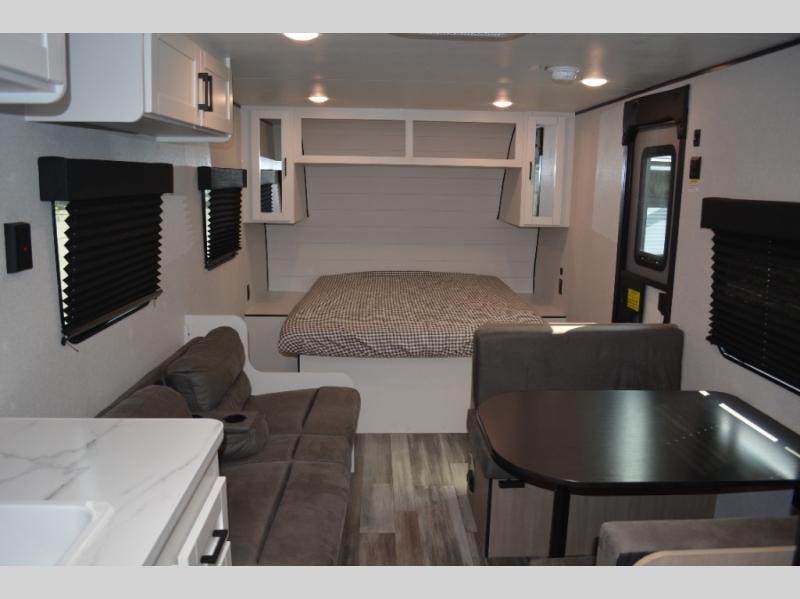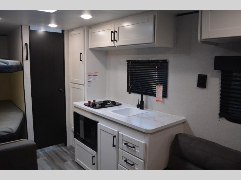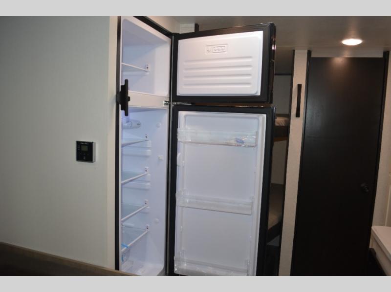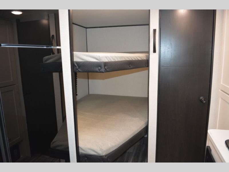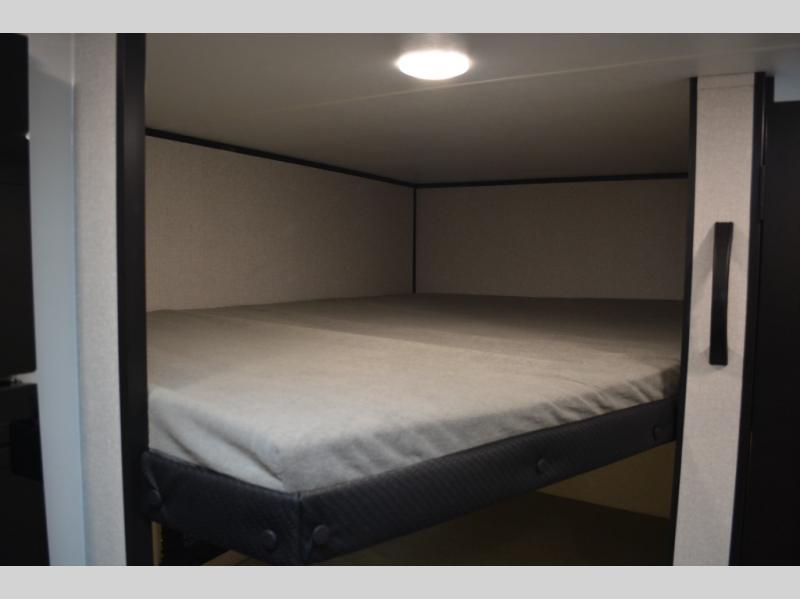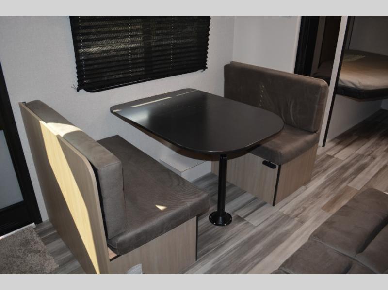You can comfortably sleep eight to ten people in this trailer thanks to the double-size bunks, the 60" x 80" queen bed in the front bedroom, plus the booth dinette and jack-knife sofa in the main living area! The chef of your crew will have a two burner cooktop and microwave oven to prepare meals, and everyone can store their favorite drinks in the 12V refrigerator. The bathroom includes a 40" shower and a toilet, with the sink just outside of this room so others can brush their teeth if one is taking a shower before bed. The outside storage will let you bring along fishing poles and the 12' power awning will create a nice place to gather in the evenings!