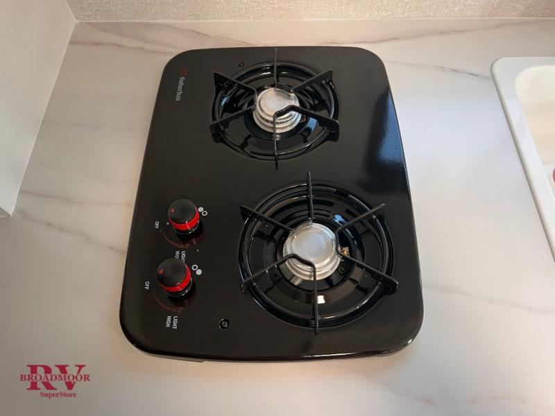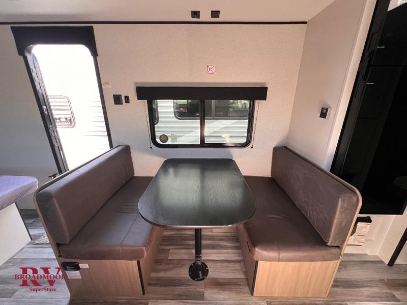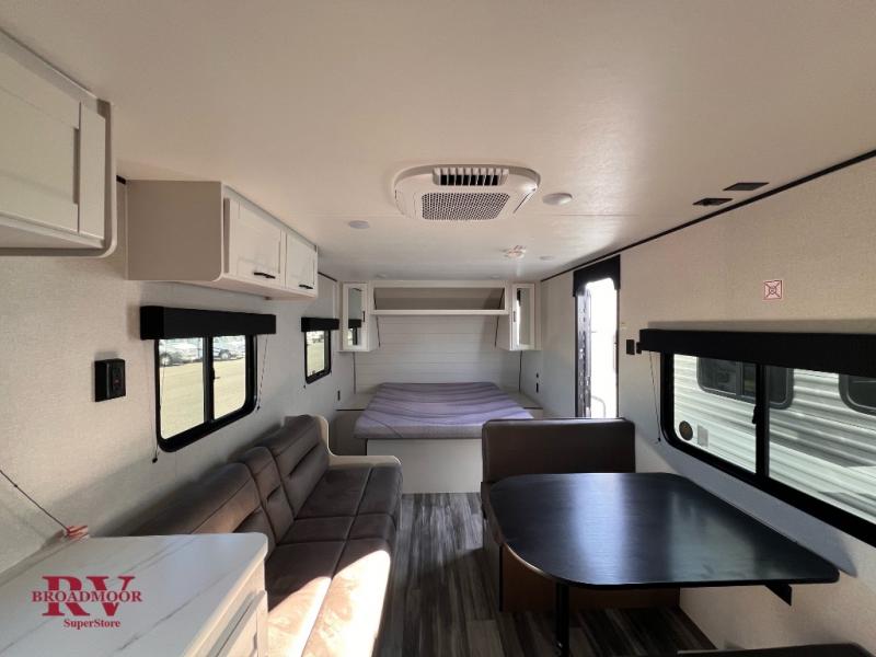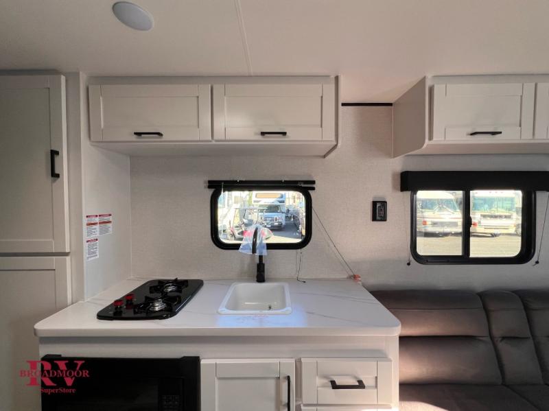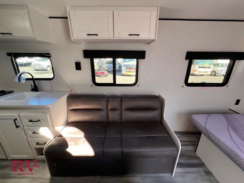 You can comfortably sleep eight to ten people in this trailer thanks to the double-size bunks, the 60" x 80" queen bed in the front bedroom, plus the booth dinette and jack-knife sofa in the main living area! The chef of your crew will have a two burner cooktop and microwave oven to prepare meals, and everyone can store their favorite drinks in the 12V refrigerator. The bathroom includes a 40" shower and a toilet, with the sink just outside of this room so others can brush their teeth if one is taking a shower before bed. The outside storage will let you bring along fishing poles and the 12' power awning will create a nice place to gather in the evenings!