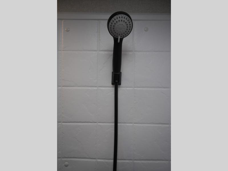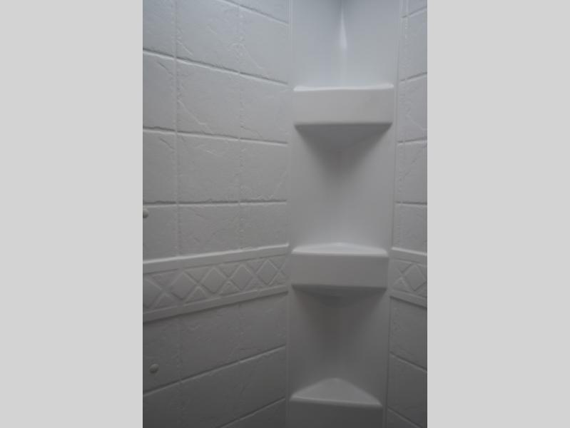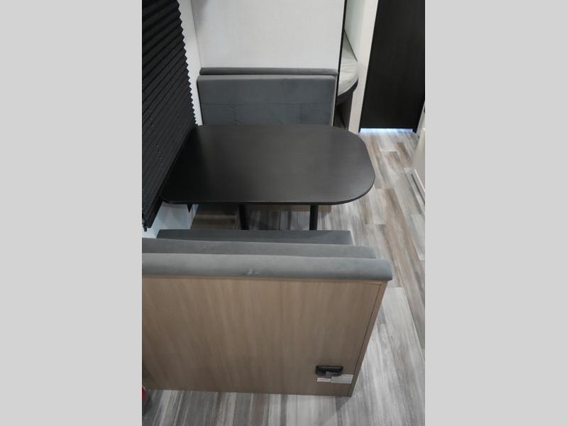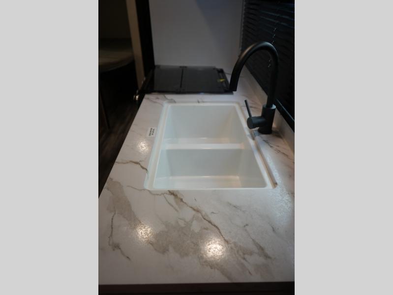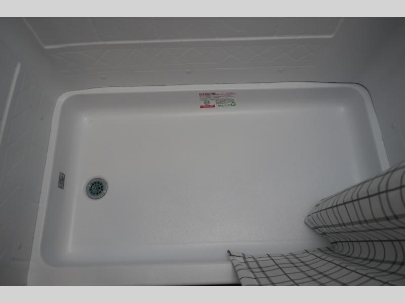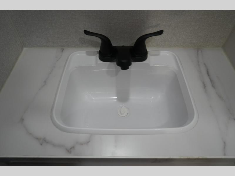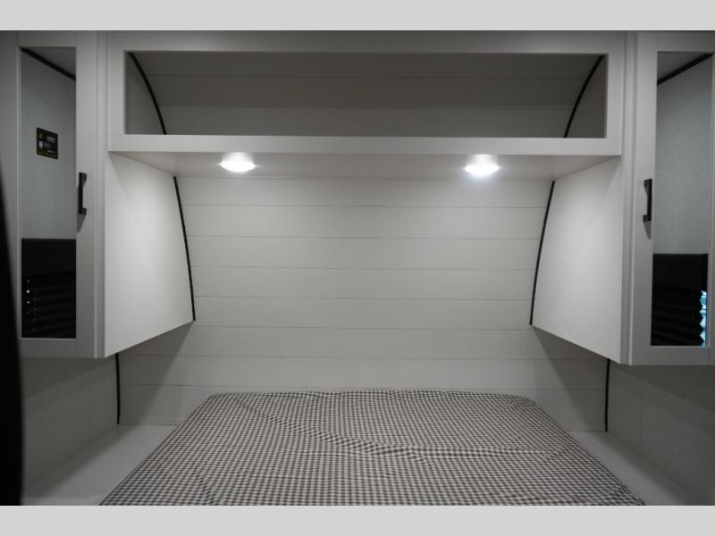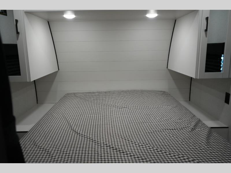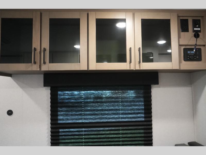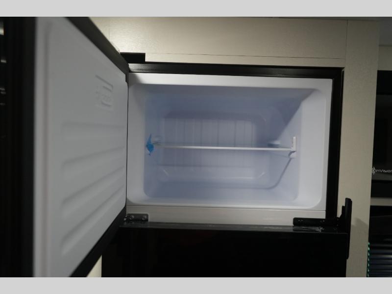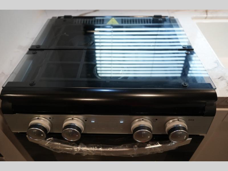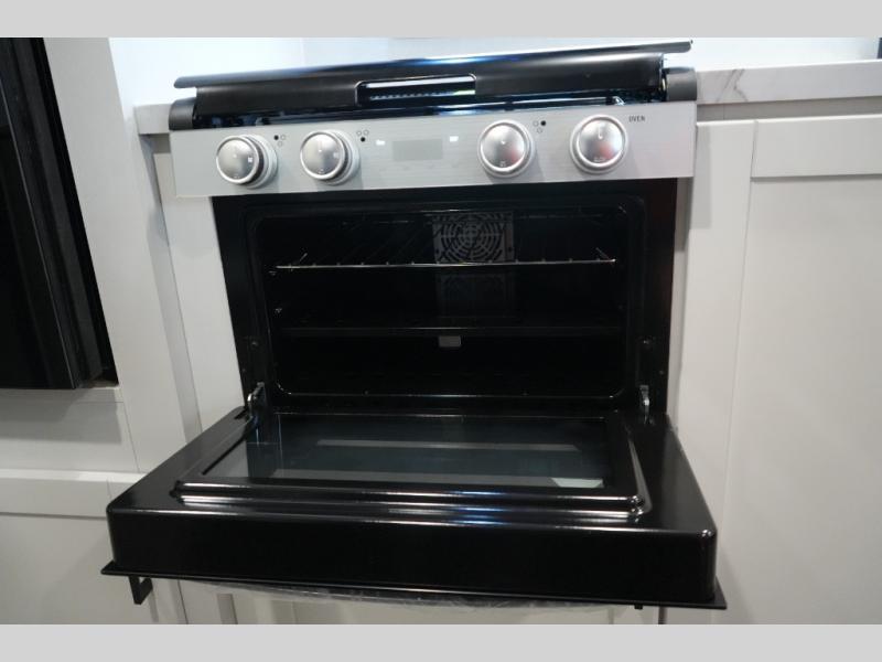Modern Kitchen Setup: Includes a 3-burner cooktop, microwave, and 8 Cu. Ft. 12V refrigerator for fresh meals and cold drinks wherever you go.