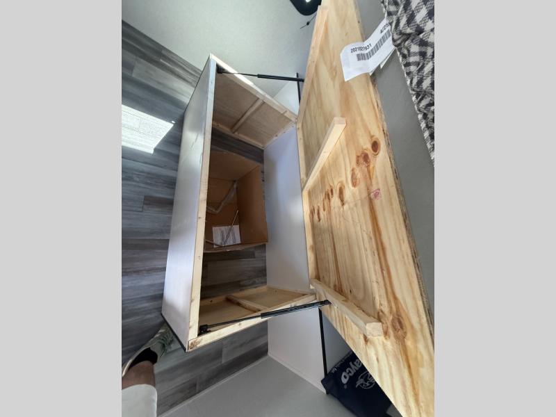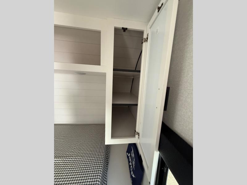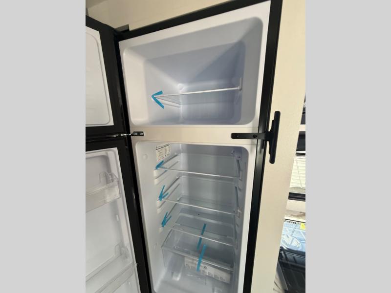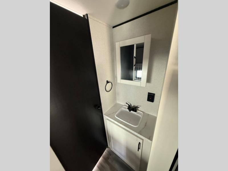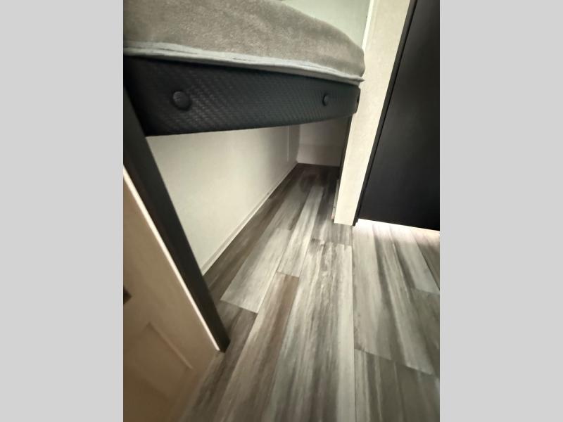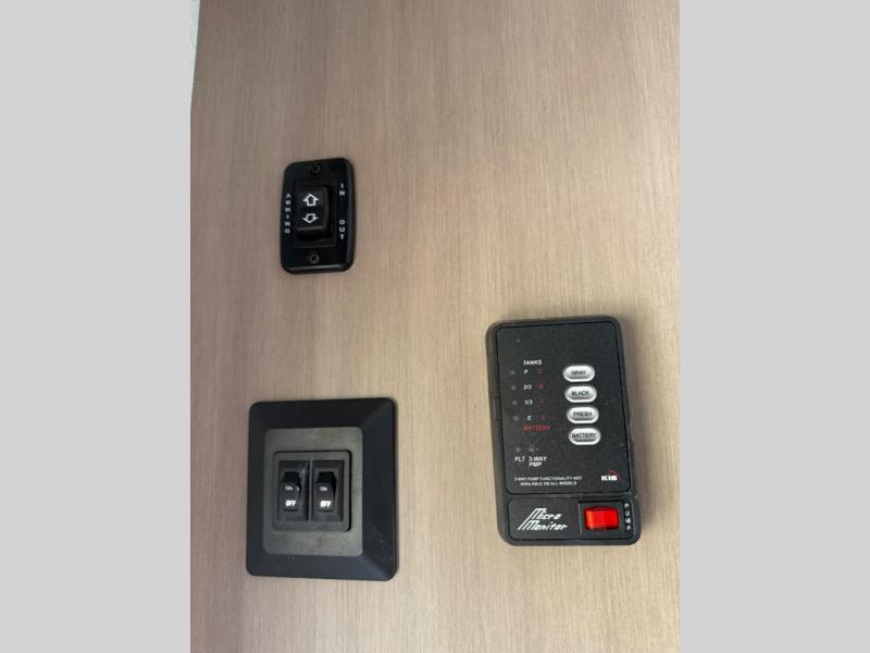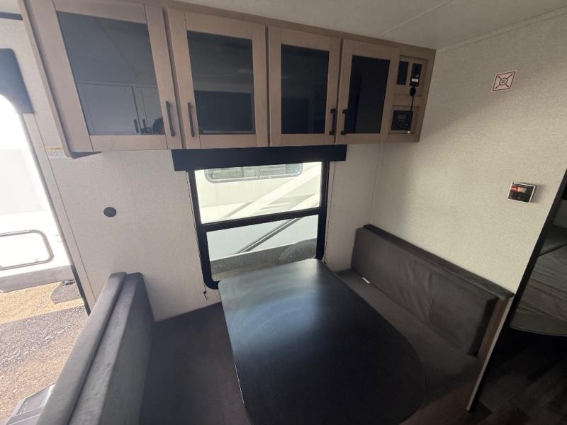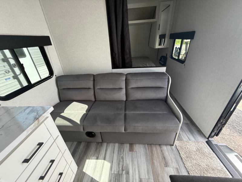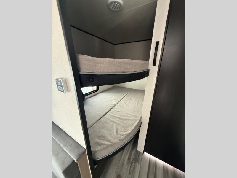 You can comfortably sleep eight to ten people in this trailer thanks to the double-size bunks, the RV queen bed in the front bedroom, plus the booth dinette and jack-knife sofa in the main living area! The chef of your crew will have a three burner cooktop and microwave oven to prepare meals, and everyone can store their favorite drinks in the 8 cu. ft. 12V refrigerator. The bathroom includes a tub/shower and a toilet, with the sink just outside of this room so others can brush their teeth if one is taking a shower before bed. The outside storage will let you bring along fishing poles and the 16' power awning with LED lights will create a nice place to gather in the evenings!