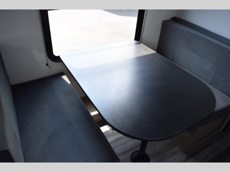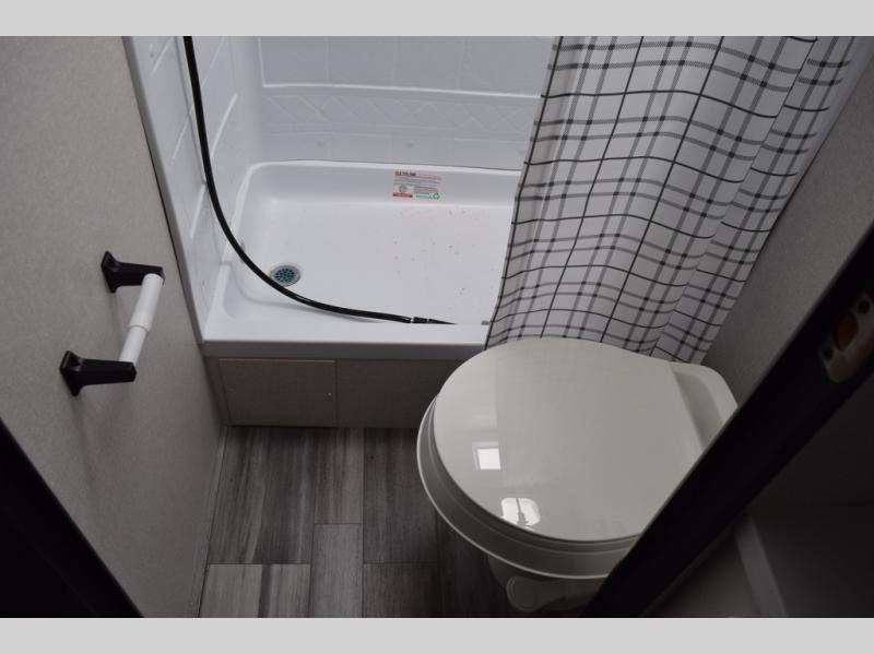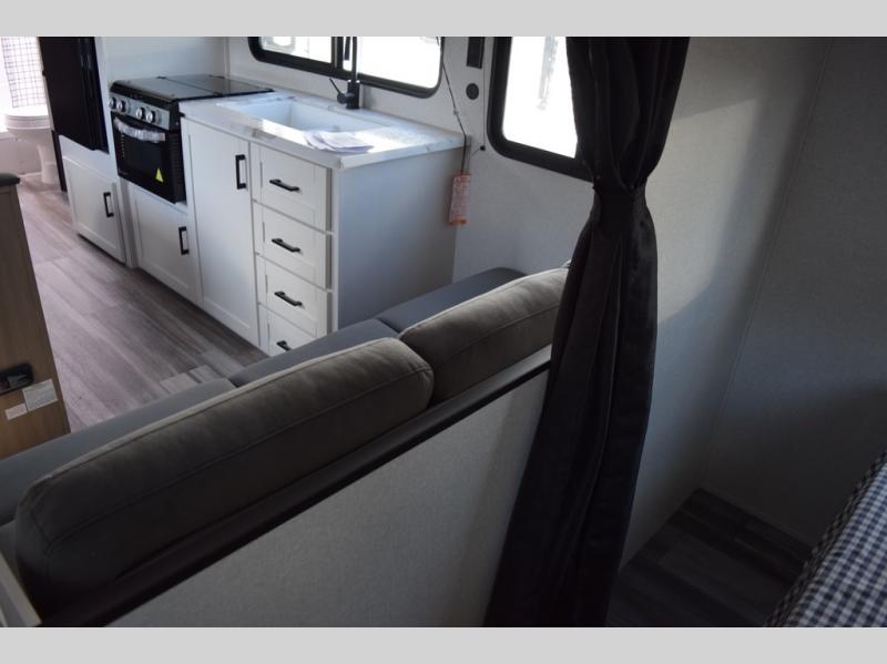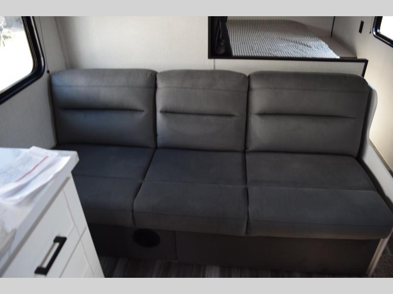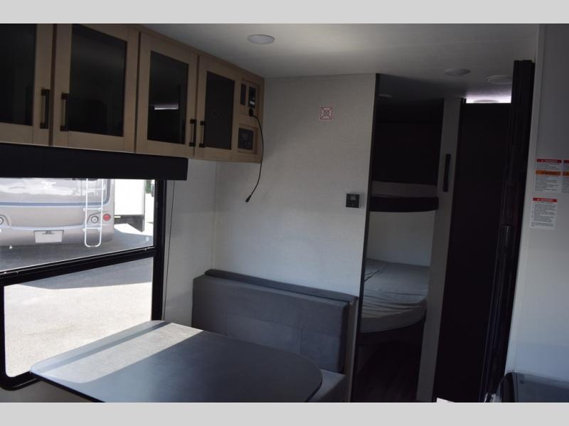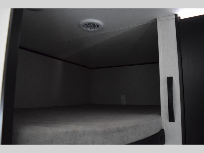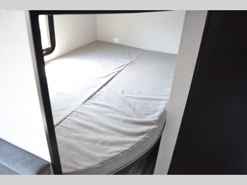 You can comfortably sleep eight to ten people in this trailer thanks to the double-size bunks, the RV queen bed in the front bedroom, plus the booth dinette and jack-knife sofa in the main living area! The chef of your crew will have a three burner cooktop and microwave oven to prepare meals, and everyone can store their favorite drinks in the 8 cu. ft. 12V refrigerator. The bathroom includes a tub/shower and a toilet, with the sink just outside of this room so others can brush their teeth if one is taking a shower before bed. The outside storage will let you bring along fishing poles and the 16' power awning with LED lights will create a nice place to gather in the evenings!