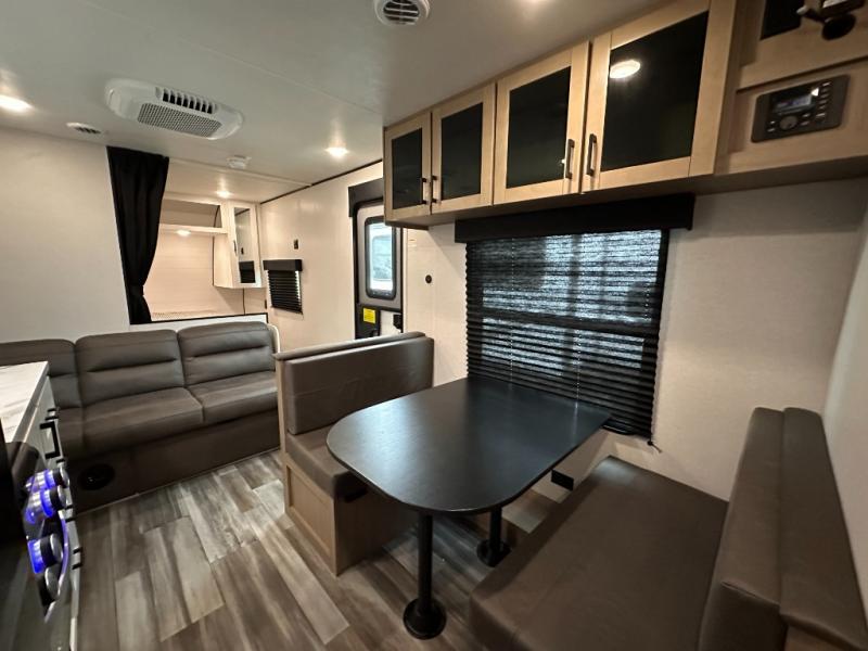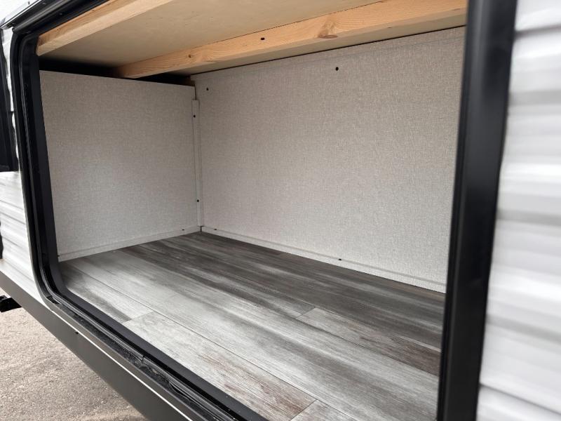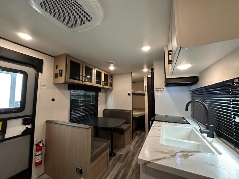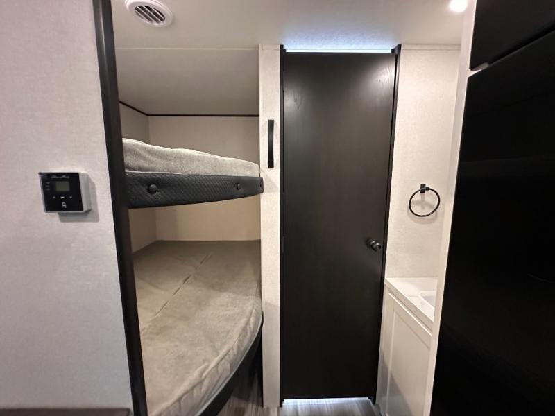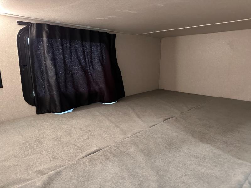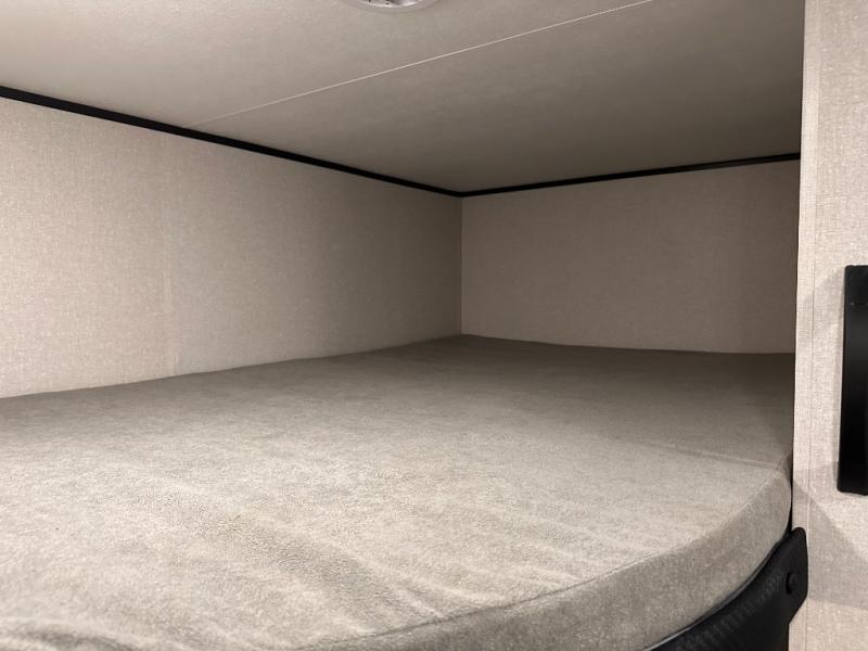 You can comfortably sleep eight to ten people in this trailer thanks to the double-size bunks, the RV queen bed in the front bedroom, plus the booth dinette and jack-knife sofa in the main living area! The chef of your crew will have a three burner cooktop and microwave oven to prepare meals, and everyone can store their favorite drinks in the 8 cu. ft. 12V refrigerator. The bathroom includes a tub/shower and a toilet, with the sink just outside of this room so others can brush their teeth if one is taking a shower before bed. The outside storage will let you bring along fishing poles and the 16' power awning with LED lights will create a nice place to gather in the evenings!