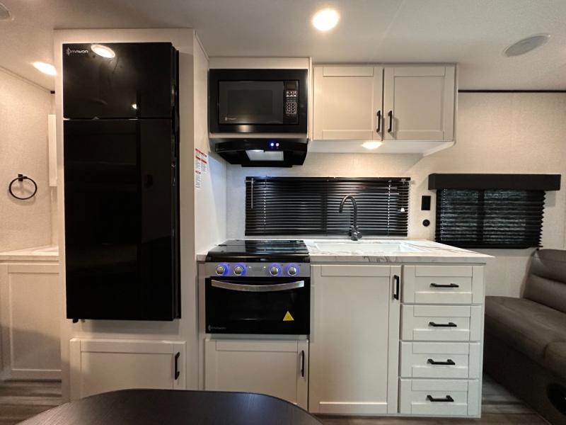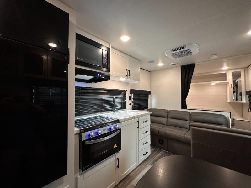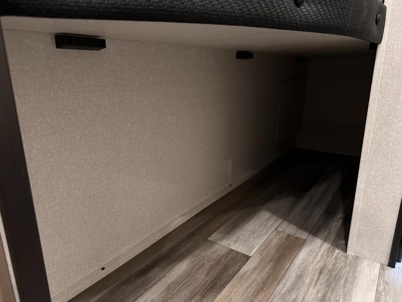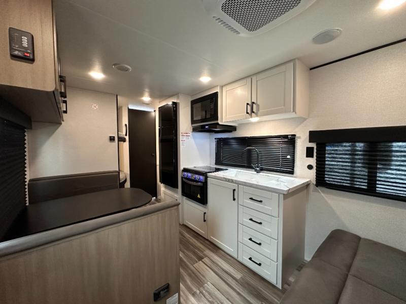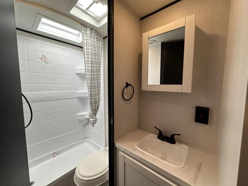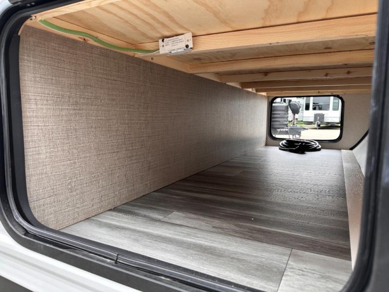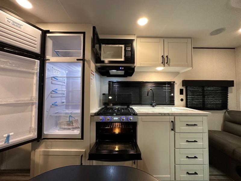 You can comfortably sleep eight to ten people in this trailer thanks to the double-size bunks, the RV queen bed in the front bedroom, plus the booth dinette and jack-knife sofa in the main living area! The chef of your crew will have a three burner cooktop and microwave oven to prepare meals, and everyone can store their favorite drinks in the 8 cu. ft. 12V refrigerator. The bathroom includes a tub/shower and a toilet, with the sink just outside of this room so others can brush their teeth if one is taking a shower before bed. The outside storage will let you bring along fishing poles and the 16' power awning with LED lights will create a nice place to gather in the evenings!