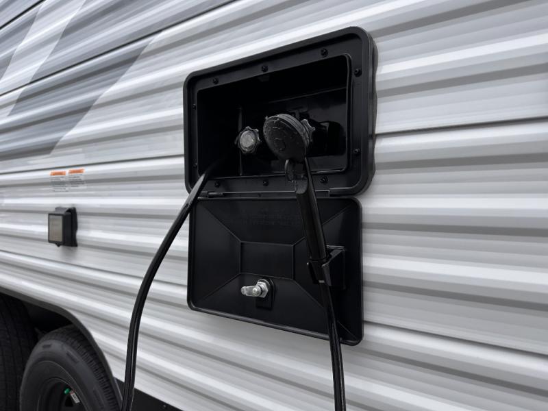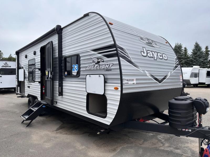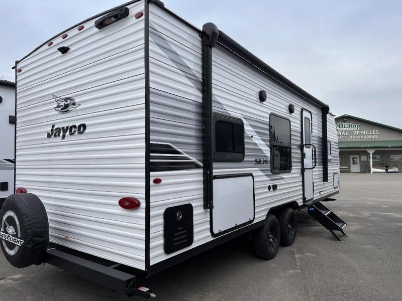 The Jayco Jay Flight SLX travel trailer is quite easy to own because it is lightweight for an easier towing experience. Built on a fully integrated A-frame with galvanized-steel, impact-resistant wheel wells, the Jay Flight SLX has quality at its very foundation. That quality continues on to the electric self-adjusting brakes, easy-lube hubs, Magnum Truss roof system, and LP quick connect. Some of what the mandatory Customer Value Package includes is backup camera prep, Keyed-Alike entry and baggage doors, marine grade exterior speakers, and an on-demand tankless water heater.