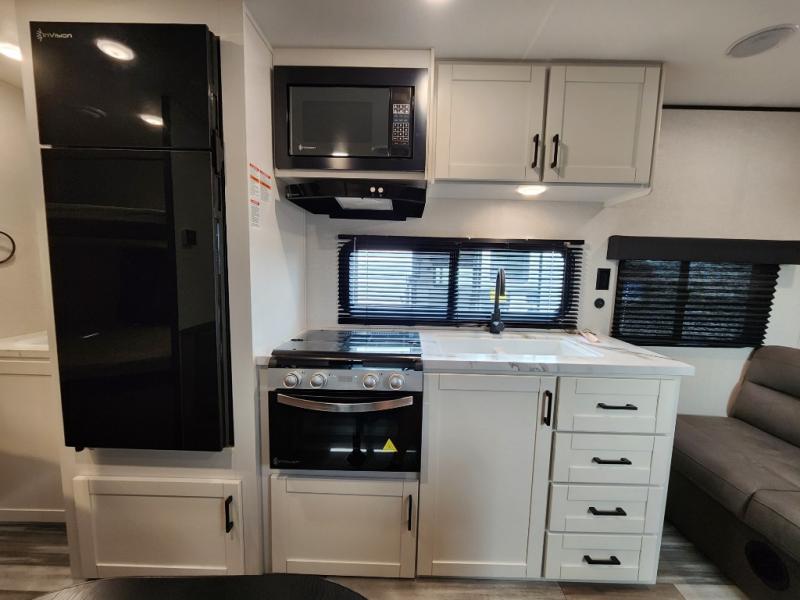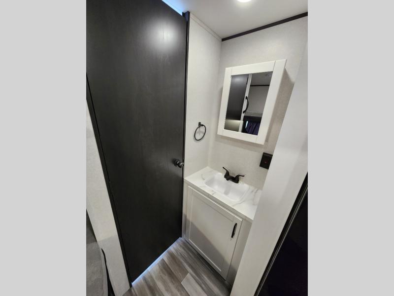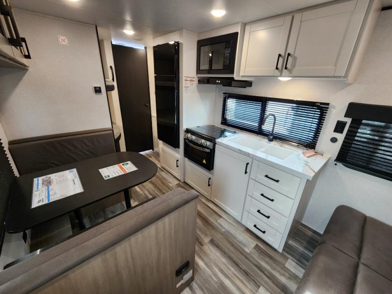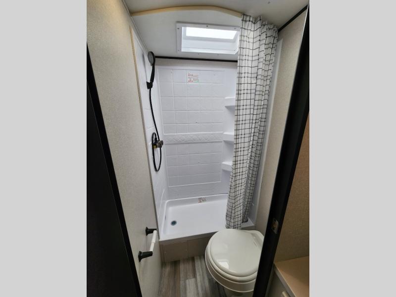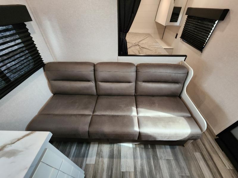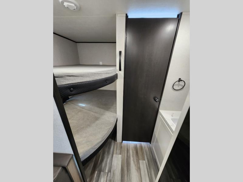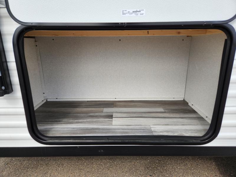 You can comfortably sleep eight to ten people in this trailer thanks to the double-size bunks, the RV queen bed in the front bedroom, plus the booth dinette and jack-knife sofa in the main living area! The chef of your crew will have a three burner cooktop and microwave oven to prepare meals, and everyone can store their favorite drinks in the 8 cu. ft. 12V refrigerator. The bathroom includes a tub/shower and a toilet, with the sink just outside of this room so others can brush their teeth if one is taking a shower before bed. The outside storage will let you bring along fishing poles and the 16' power awning with LED lights will create a nice place to gather in the evenings!
