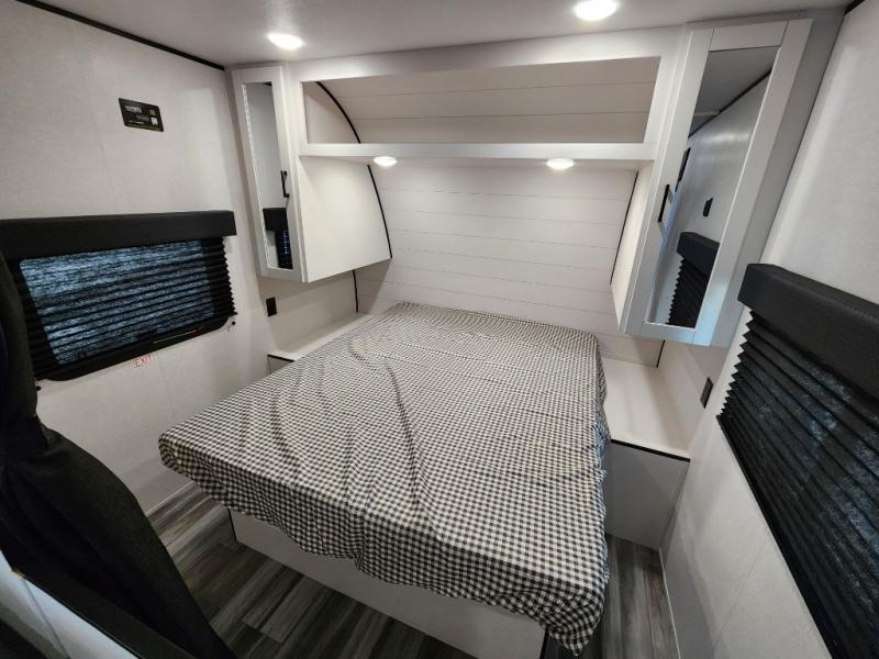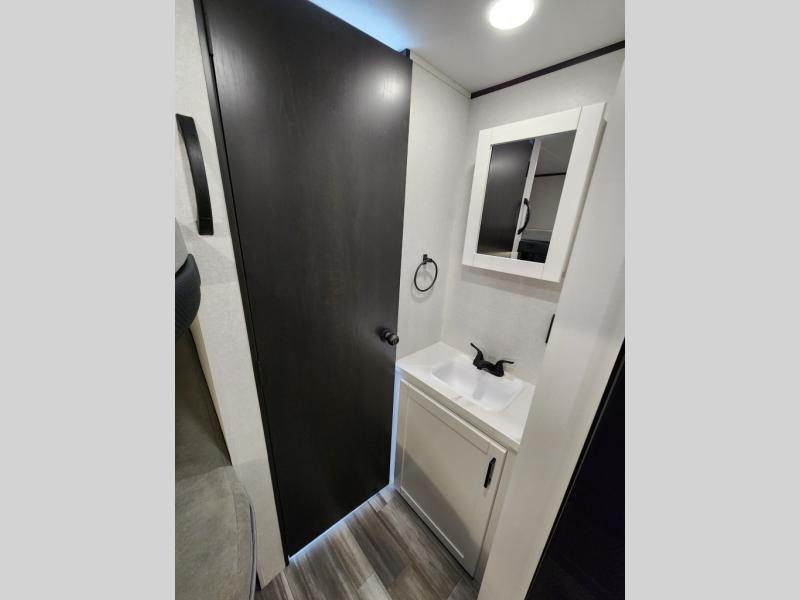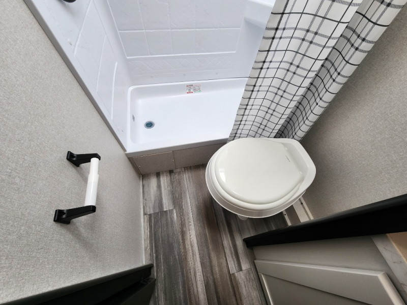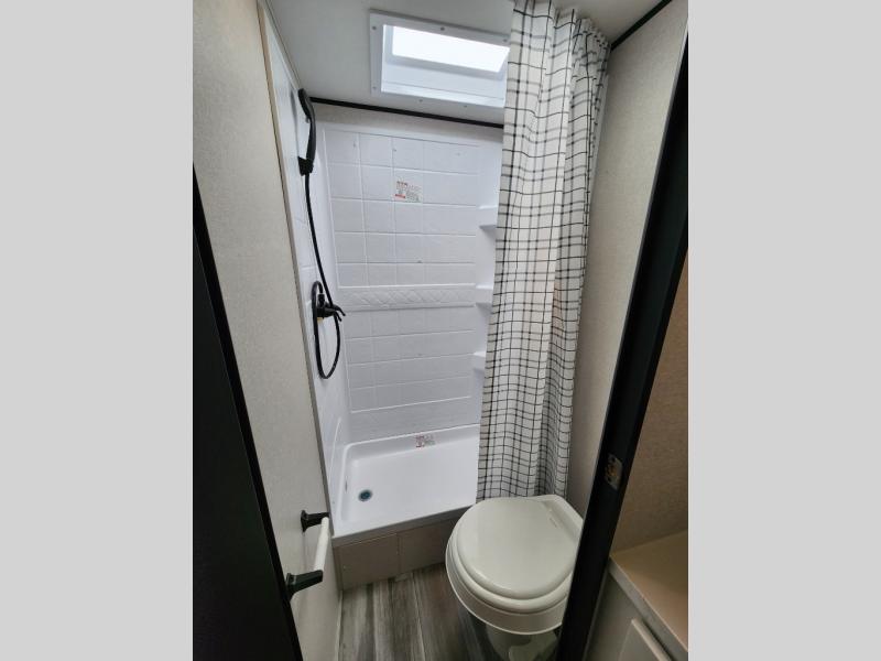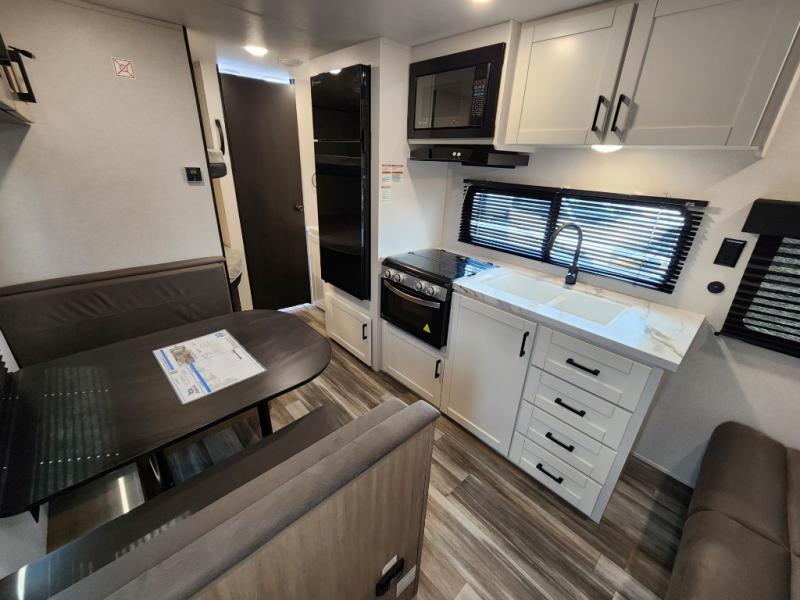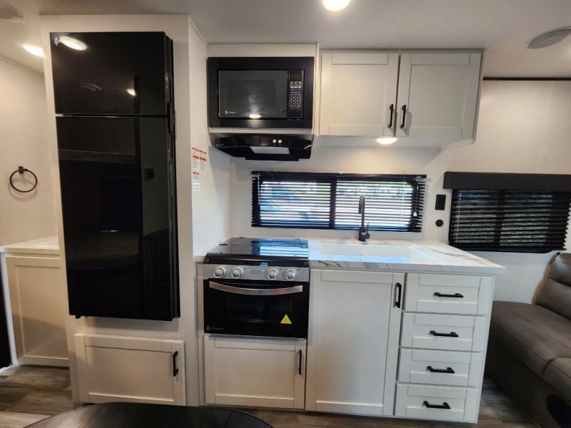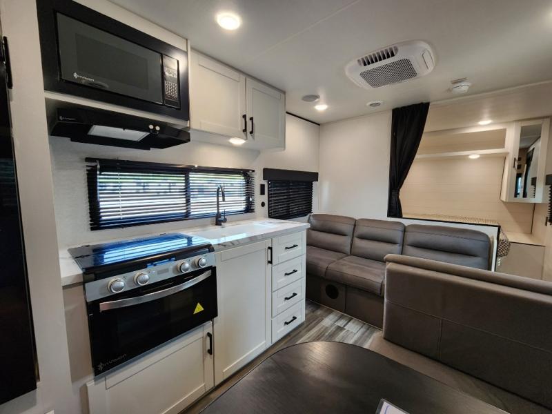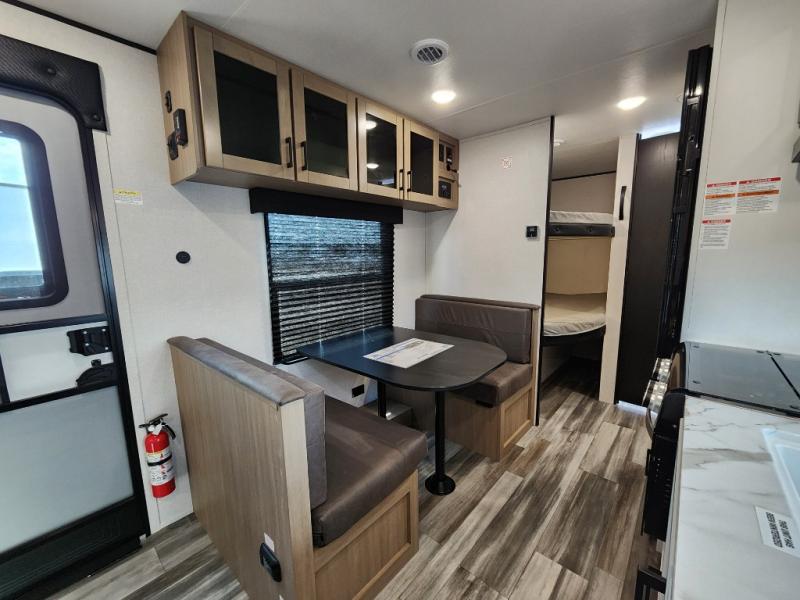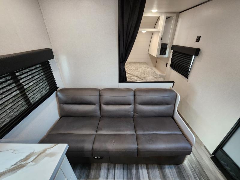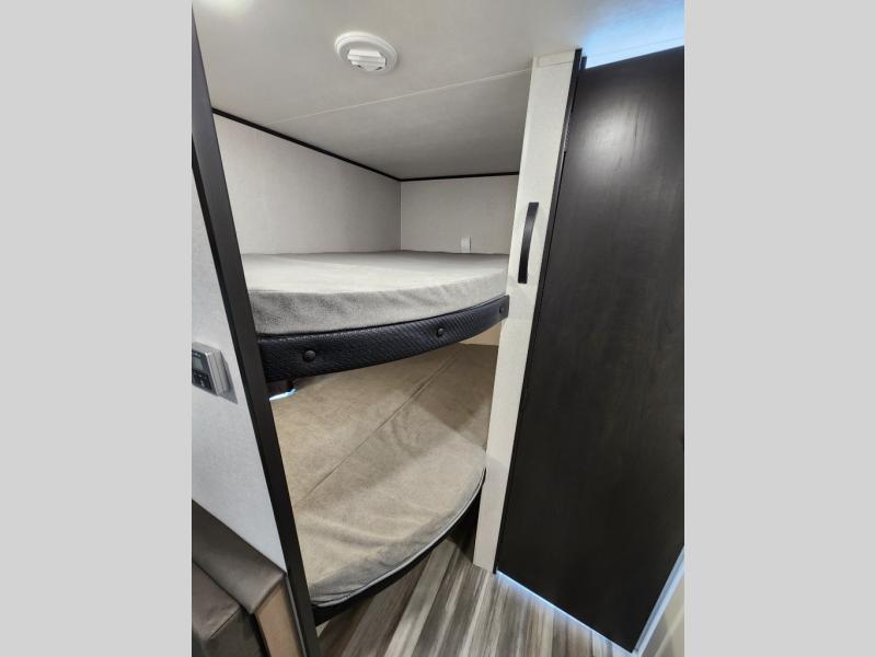 You can comfortably sleep eight to ten people in this trailer thanks to the double-size bunks, the RV queen bed in the front bedroom, plus the booth dinette and jack-knife sofa in the main living area! The chef of your crew will have a three burner cooktop and microwave oven to prepare meals, and everyone can store their favorite drinks in the 8 cu. ft. 12V refrigerator. The bathroom includes a tub/shower and a toilet, with the sink just outside of this room so others can brush their teeth if one is taking a shower before bed. The outside storage will let you bring along fishing poles and the 16' power awning with LED lights will create a nice place to gather in the evenings!