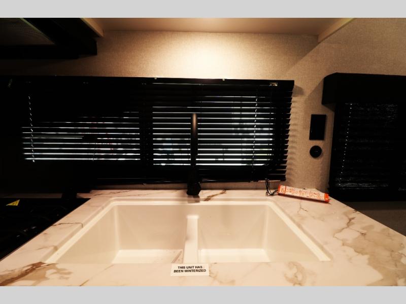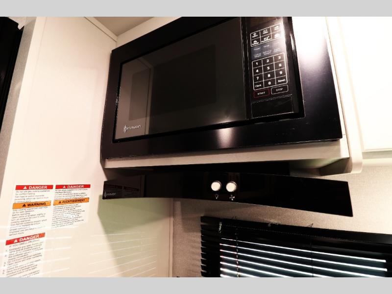 An 8 cu ft 12V refrigerator chills quickly; a 3-burner range plus microwave and high-rise faucet make meal prep effortless—and yes, there's even a convenient outside LP quick-connect for grilling.