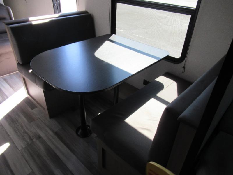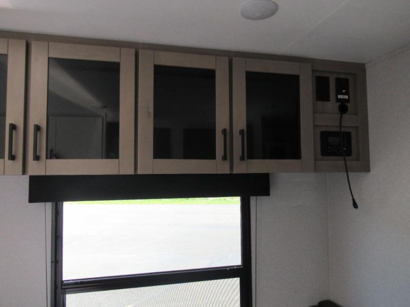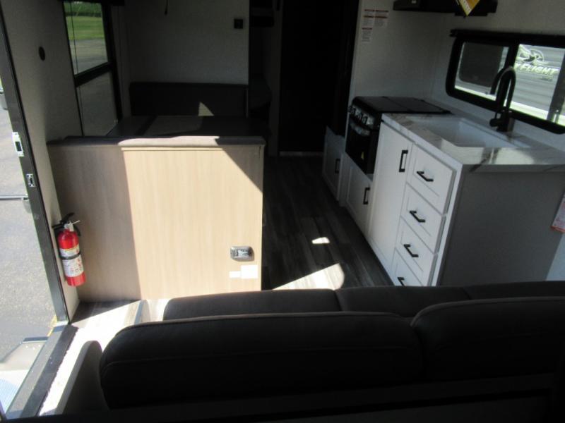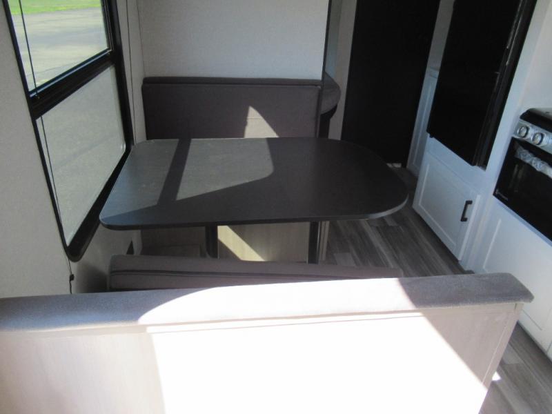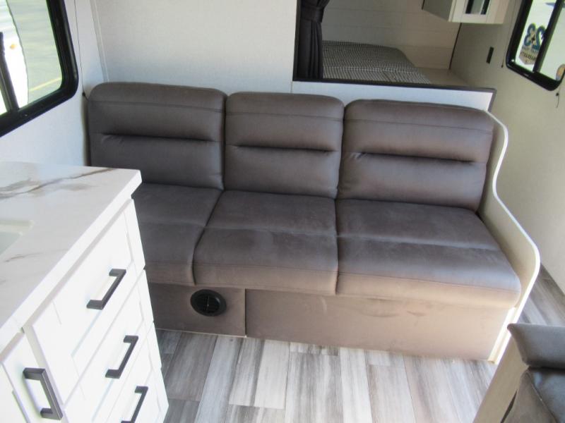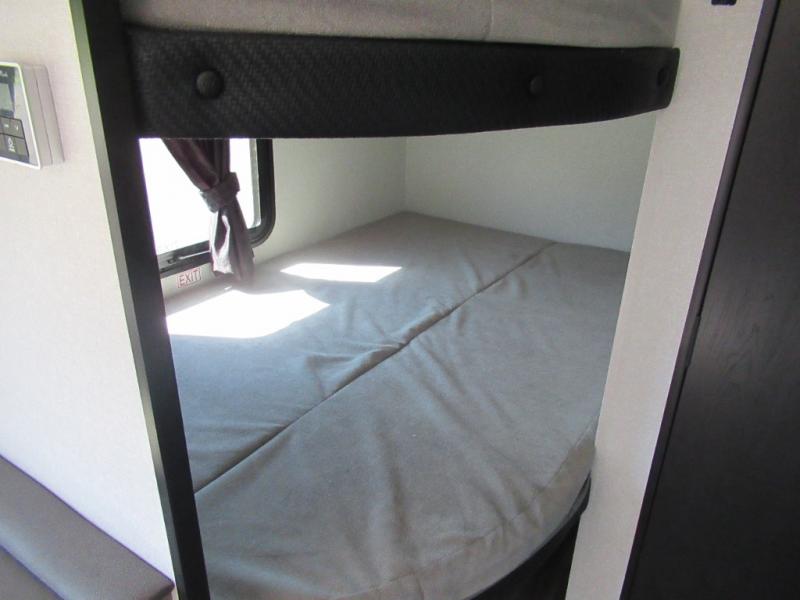 You can comfortably sleep eight to ten people in this trailer thanks to the double-size bunks, the RV queen bed in the front bedroom, plus the booth dinette and jack-knife sofa in the main living area! The chef of your crew will have a three burner cooktop and microwave oven to prepare meals, and everyone can store their favorite drinks in the 8 cu. ft. 12V refrigerator. The bathroom includes a shower and a toilet, with the sink just outside of this room so others can brush their teeth if one is taking a shower before bed. The outside storage will let you bring along fishing poles and the 16' power awning with LED lights will create a nice place to gather in the evenings!