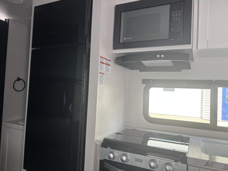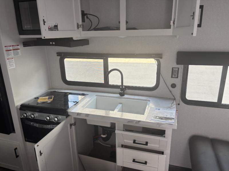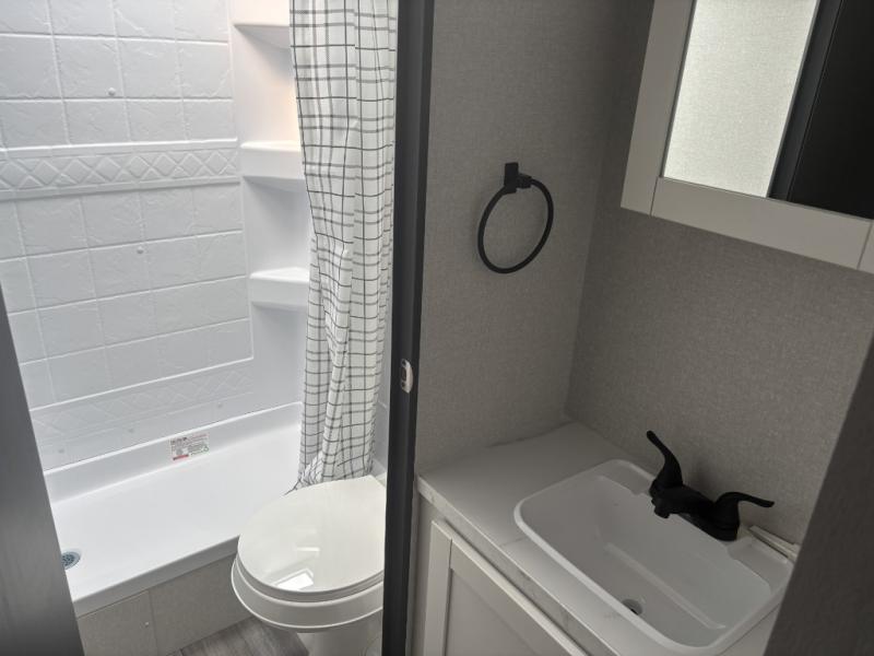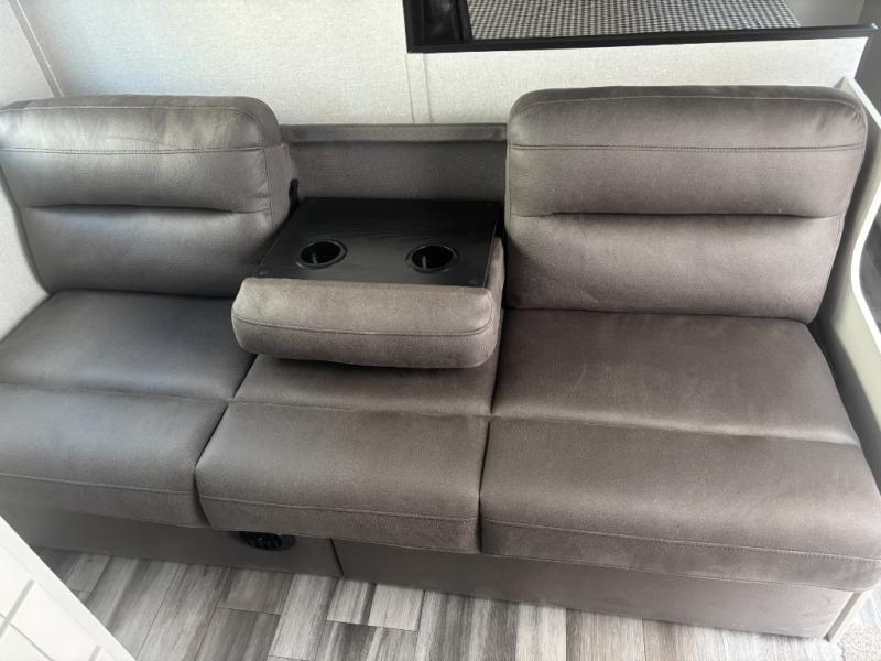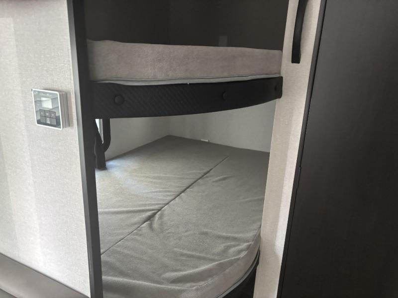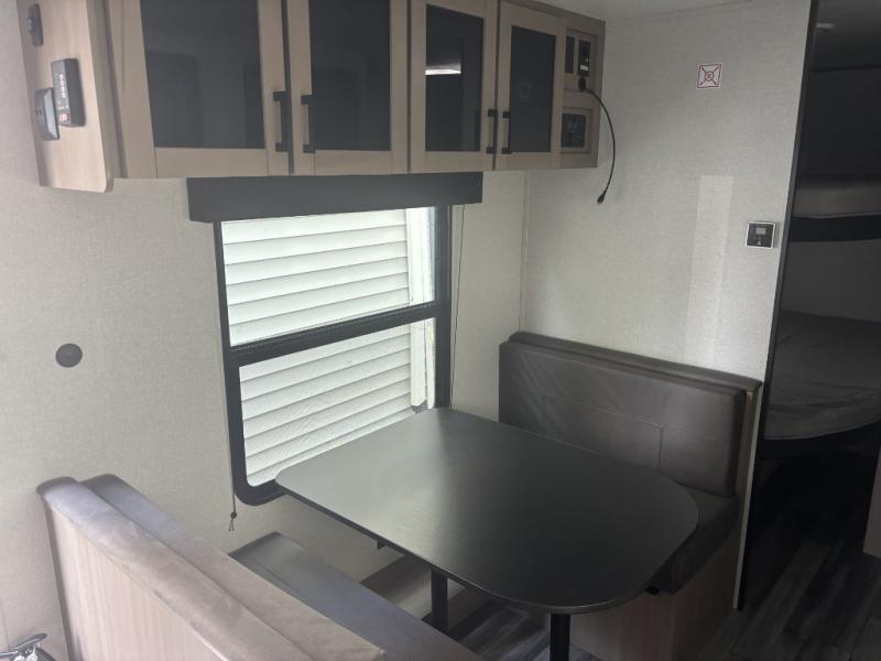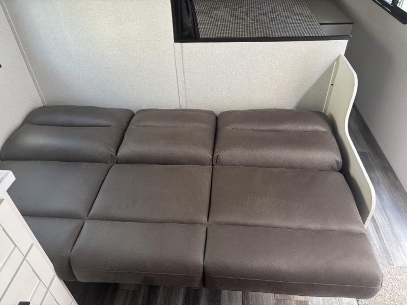 You can comfortably sleep eight to ten people in this trailer thanks to the double-size bunks, the RV queen bed in the front bedroom, plus the booth dinette and jack-knife sofa in the main living area! The chef of your crew will have a three burner cooktop and microwave oven to prepare meals, and everyone can store their favorite drinks in the 8 cu. ft. 12V refrigerator. The bathroom includes a tub/shower and a toilet, with the sink just outside of this room so others can brush their teeth if one is taking a shower before bed. The outside storage will let you bring along fishing poles and the 16' power awning with LED lights will create a nice place to gather in the evenings!