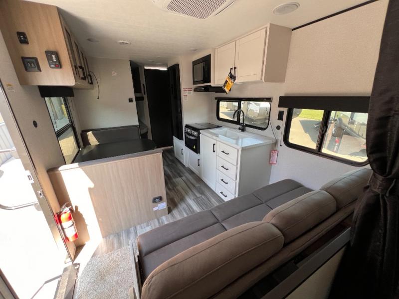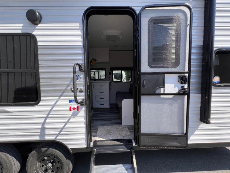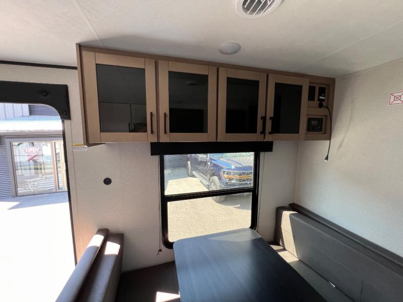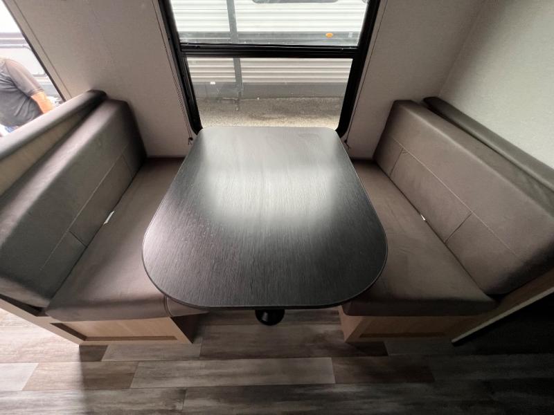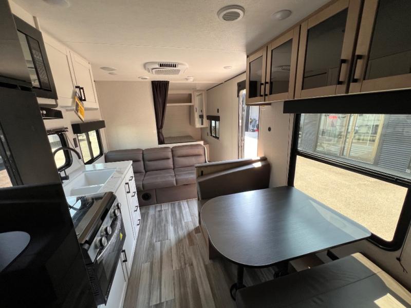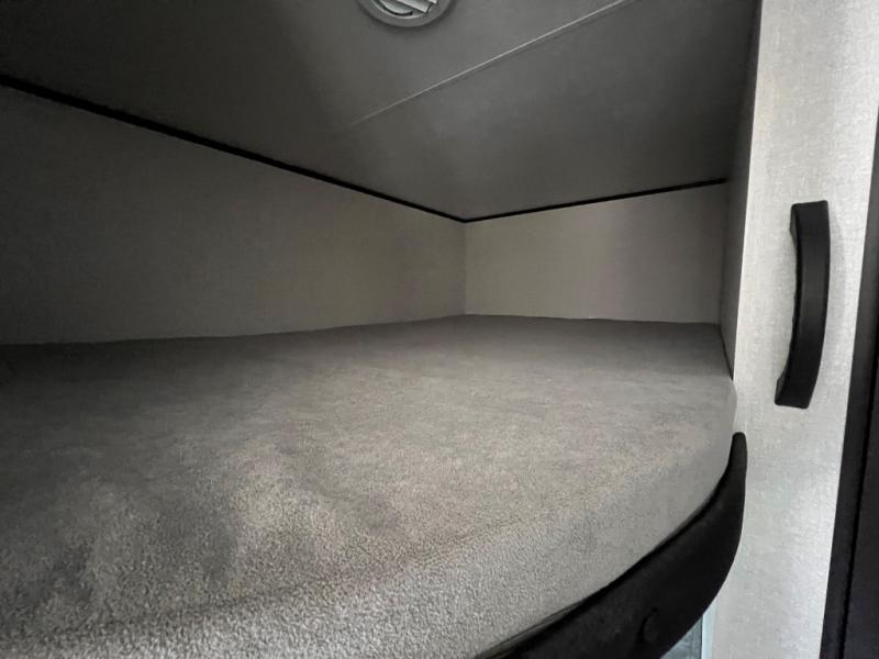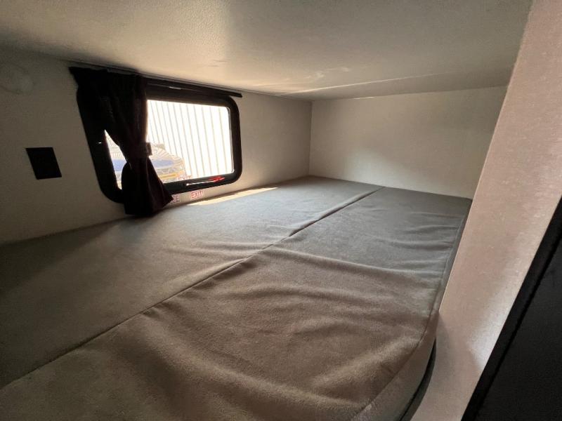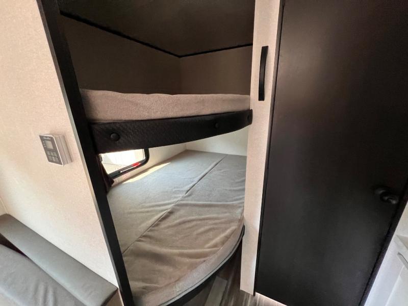 You can comfortably sleep eight to ten people in this trailer thanks to the double-size bunks, the RV queen bed in the front bedroom, plus the booth dinette and jack-knife sofa in the main living area! The chef of your crew will have a three burner cooktop and microwave oven to prepare meals, and everyone can store their favorite drinks in the 8 cu. ft. 12V refrigerator. The bathroom includes a tub/shower and a toilet, with the sink just outside of this room so others can brush their teeth if one is taking a shower before bed. The outside storage will let you bring along fishing poles and the 16' power awning with LED lights will create a nice place to gather in the evenings!