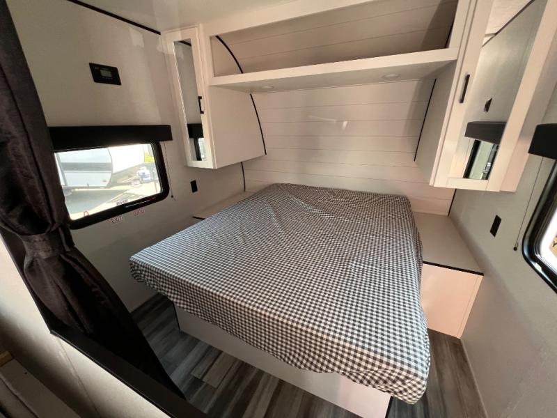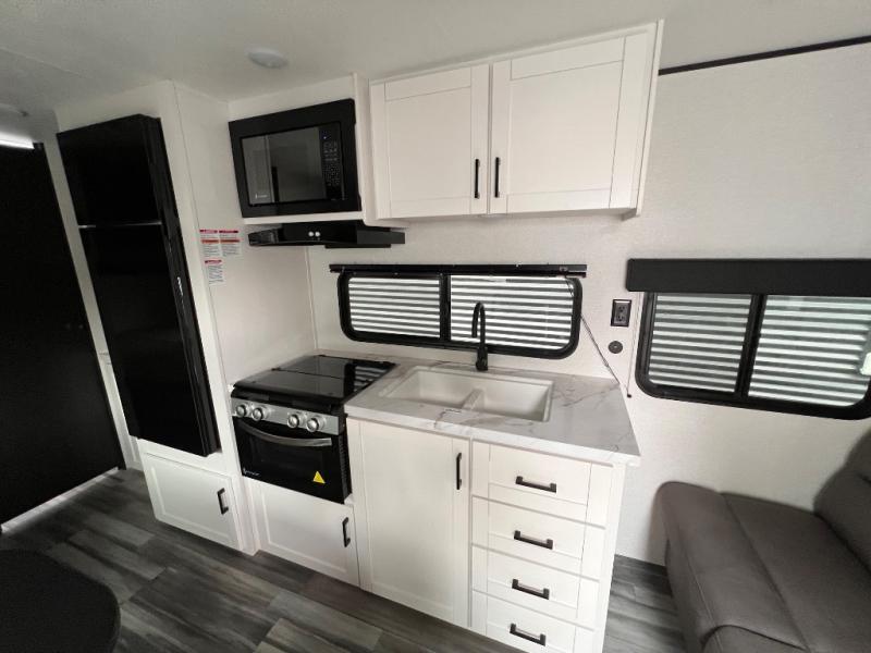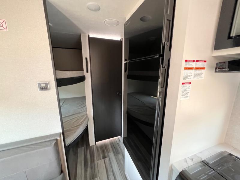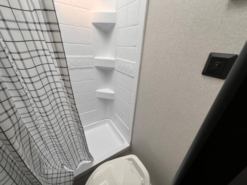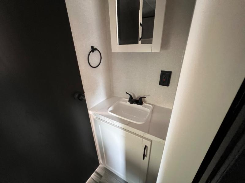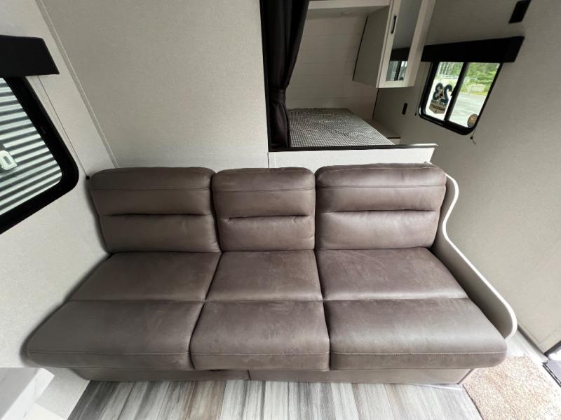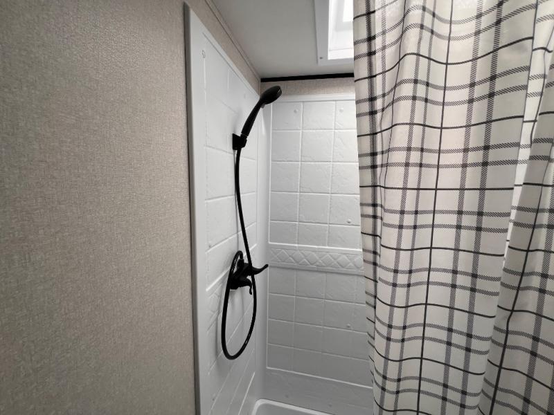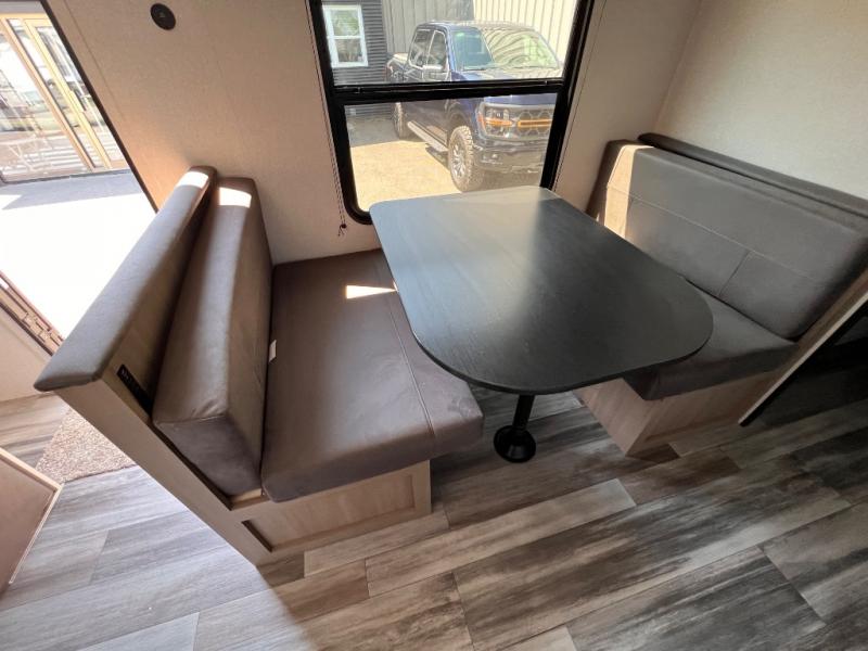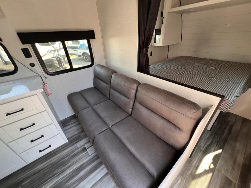 You can comfortably sleep eight to ten people in this trailer thanks to the double-size bunks, the RV queen bed in the front bedroom, plus the booth dinette and jack-knife sofa in the main living area! The chef of your crew will have a three burner cooktop and microwave oven to prepare meals, and everyone can store their favorite drinks in the 8 cu. ft. 12V refrigerator. The bathroom includes a tub/shower and a toilet, with the sink just outside of this room so others can brush their teeth if one is taking a shower before bed. The outside storage will let you bring along fishing poles and the 16' power awning with LED lights will create a nice place to gather in the evenings!