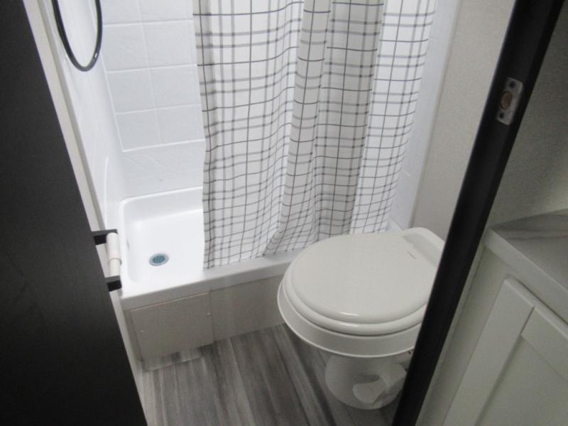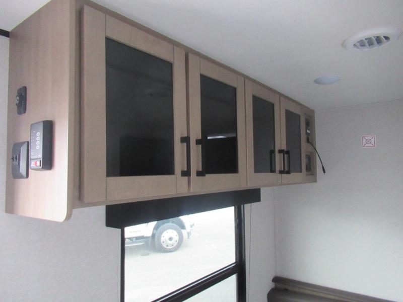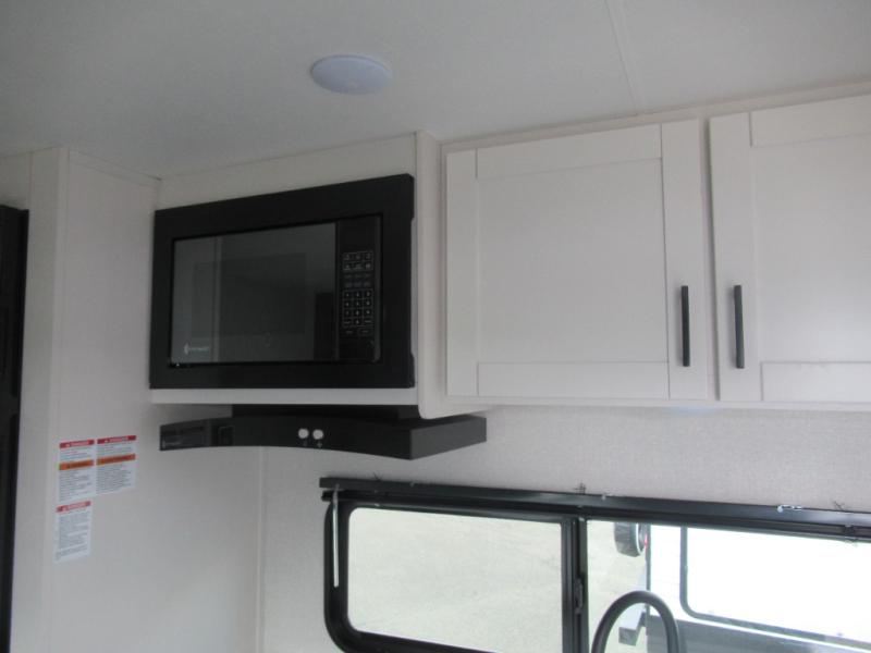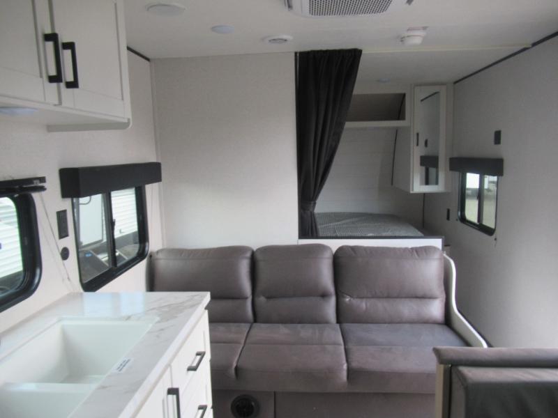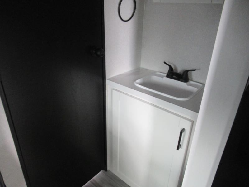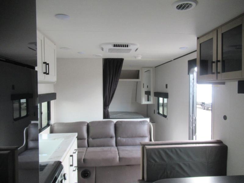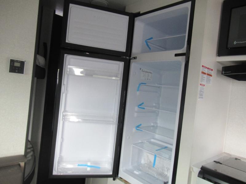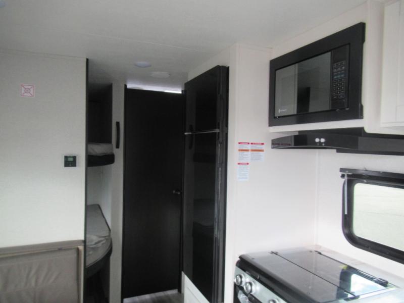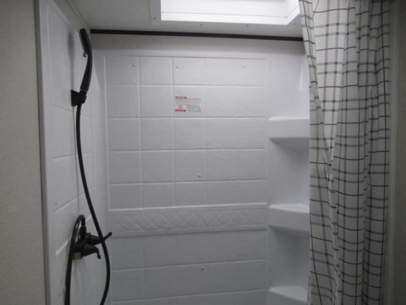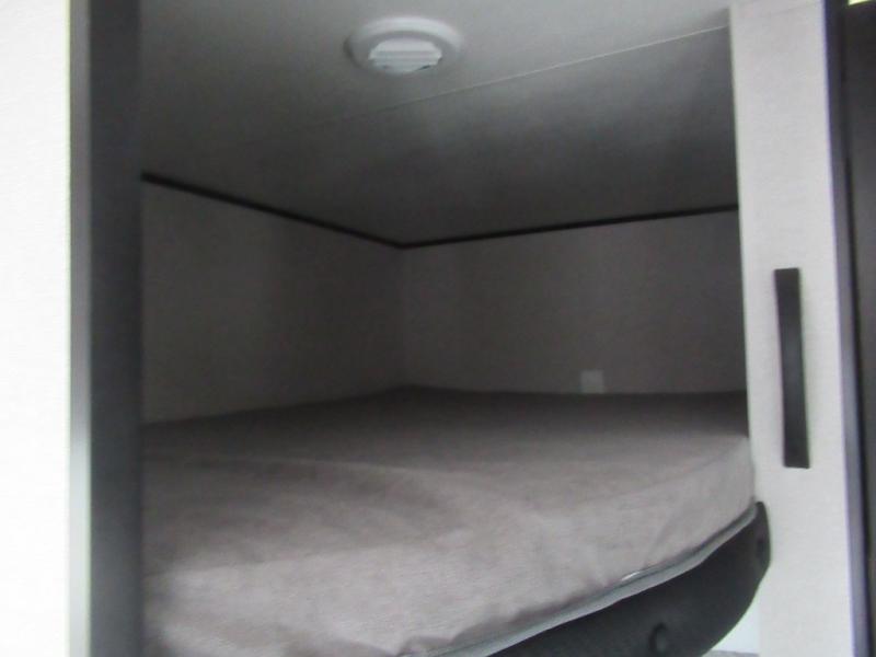 You can comfortably sleep eight to ten people in this trailer thanks to the double-size bunks, the RV queen bed in the front bedroom, plus the booth dinette and jack-knife sofa in the main living area! The chef of your crew will have a three burner cooktop and microwave oven to prepare meals, and everyone can store their favorite drinks in the 8 cu. ft. 12V refrigerator. The bathroom includes a shower and a toilet, with the sink just outside of this room so others can brush their teeth if one is taking a shower before bed. The outside storage will let you bring along fishing poles and the 16' power awning with LED lights will create a nice place to gather in the evenings!