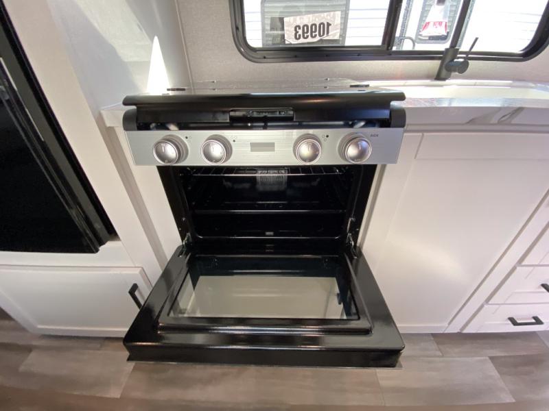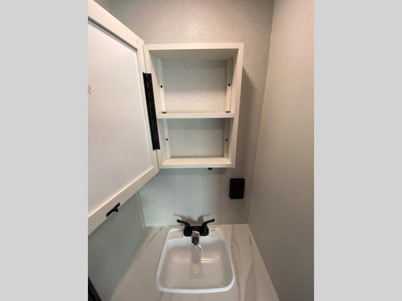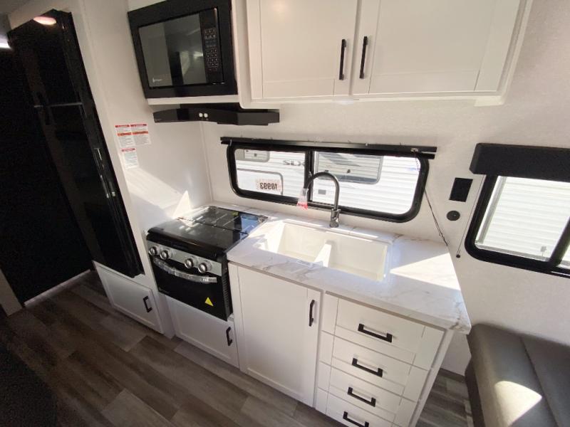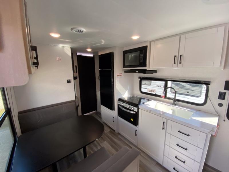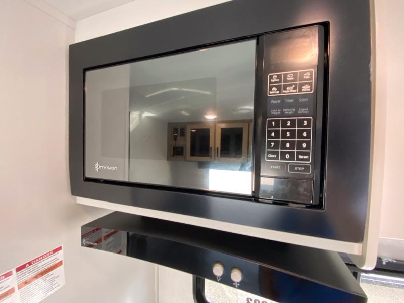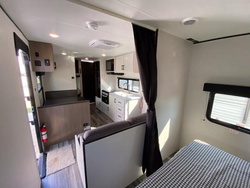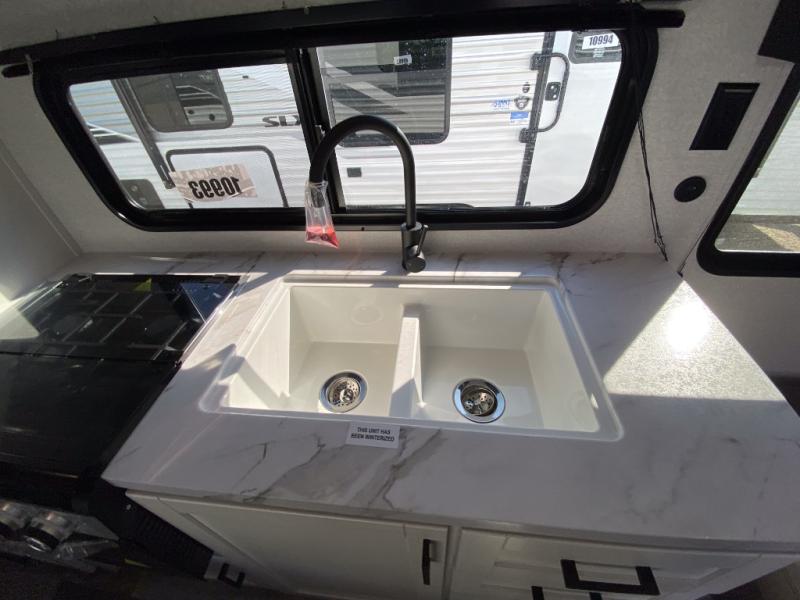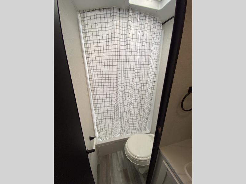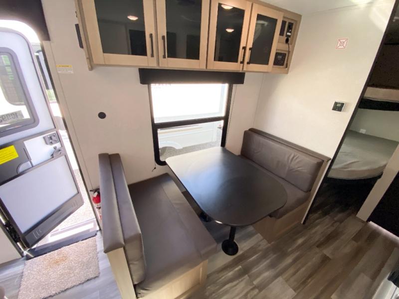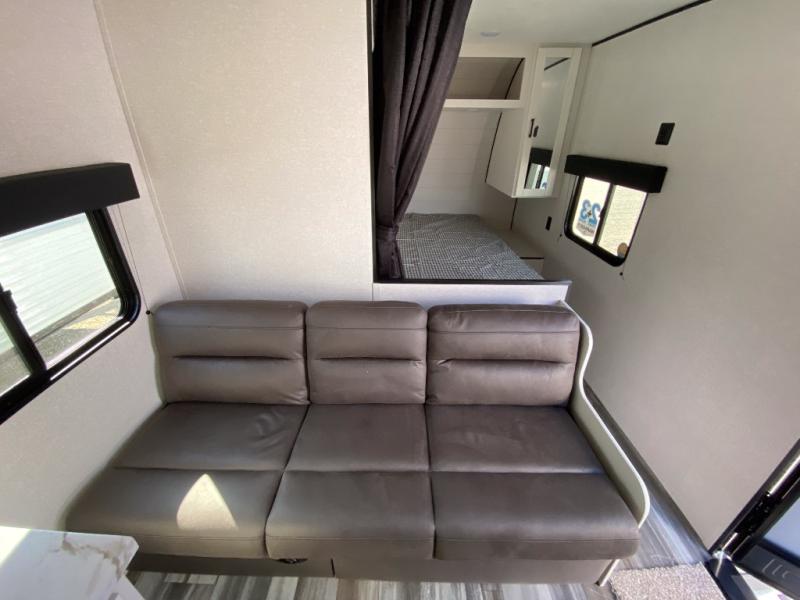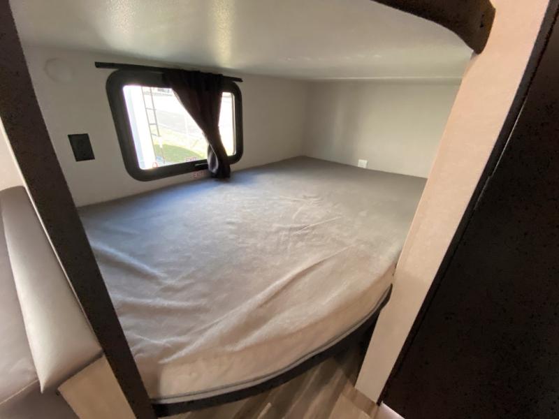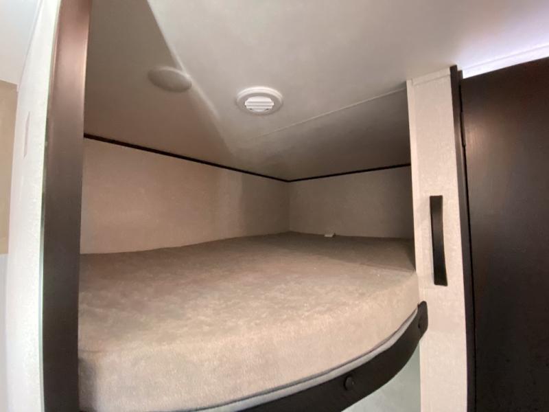 You can comfortably sleep eight to ten people in this trailer thanks to the double-size bunks, the RV queen bed in the front bedroom, plus the booth dinette and jack-knife sofa in the main living area! The chef of your crew will have a three burner cooktop and microwave oven to prepare meals, and everyone can store their favorite drinks in the 8 cu. ft. 12V refrigerator. The bathroom includes a shower and a toilet, with the sink just outside of this room so others can brush their teeth if one is taking a shower before bed. The outside storage will let you bring along fishing poles and the 16' power awning with LED lights will create a nice place to gather in the evenings!