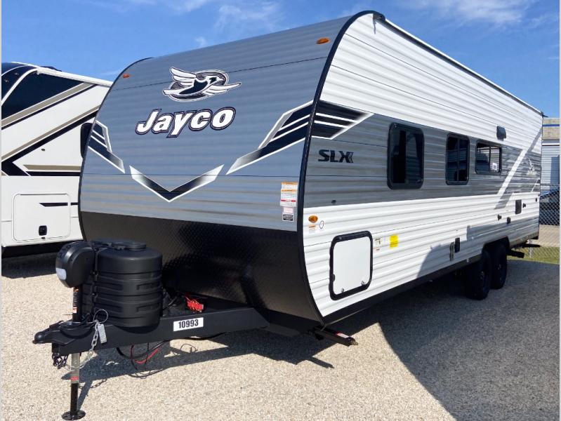 The Jayco Jay Flight SLX travel trailer is quite easy to own because it is lightweight for an easier towing experience. Built on a fully integrated A-frame with galvanized-steel, impact-resistant wheel wells, the Jay Flight SLX has quality at its very foundation. That quality continues on to the electric self-adjusting brakes, easy-lube hubs, Magnum Truss roof system, and LP quick connect. Some of what the mandatory Customer Value Package includes is backup camera prep, Keyed-Alike entry and baggage doors, and an on-demand tankless water heater.