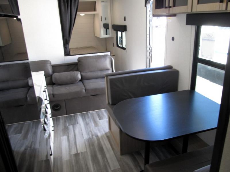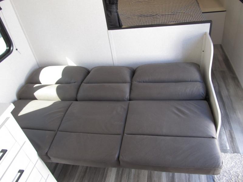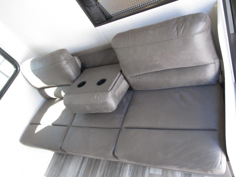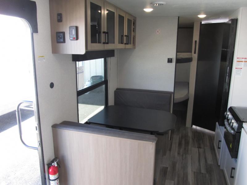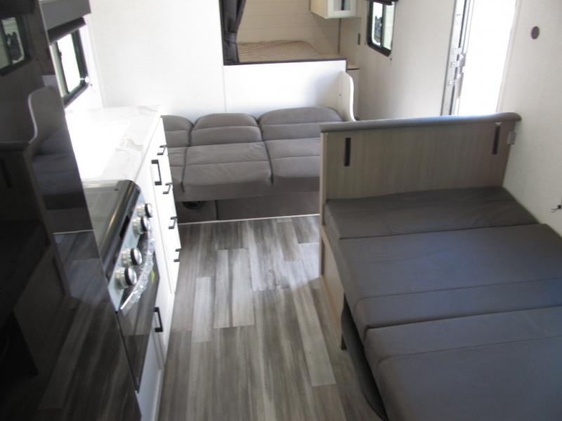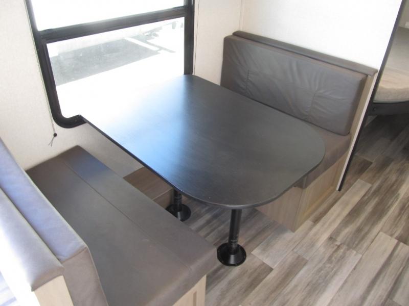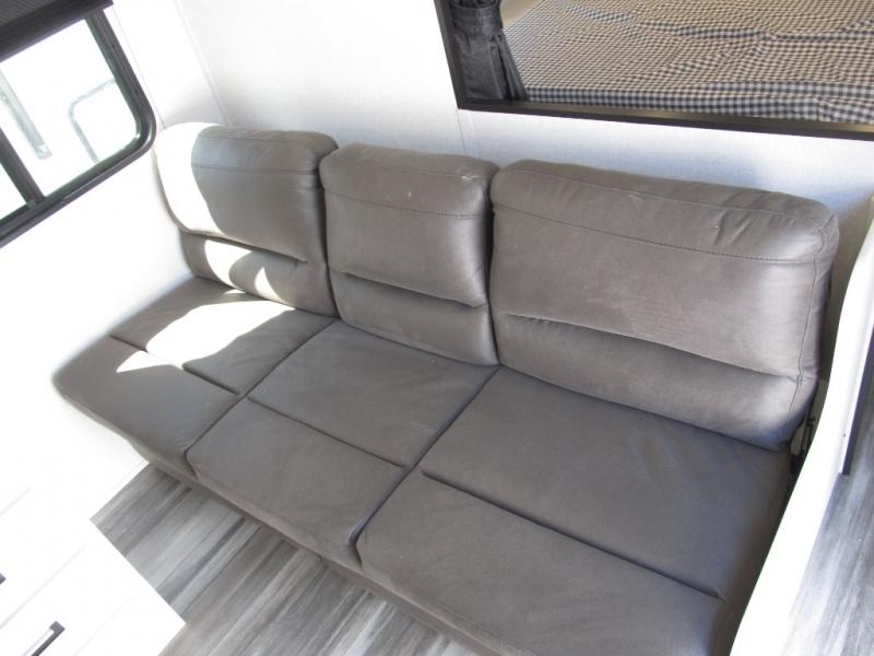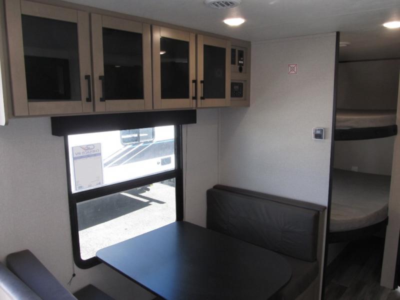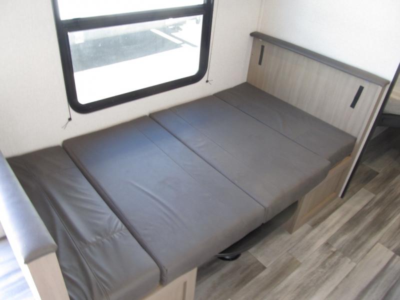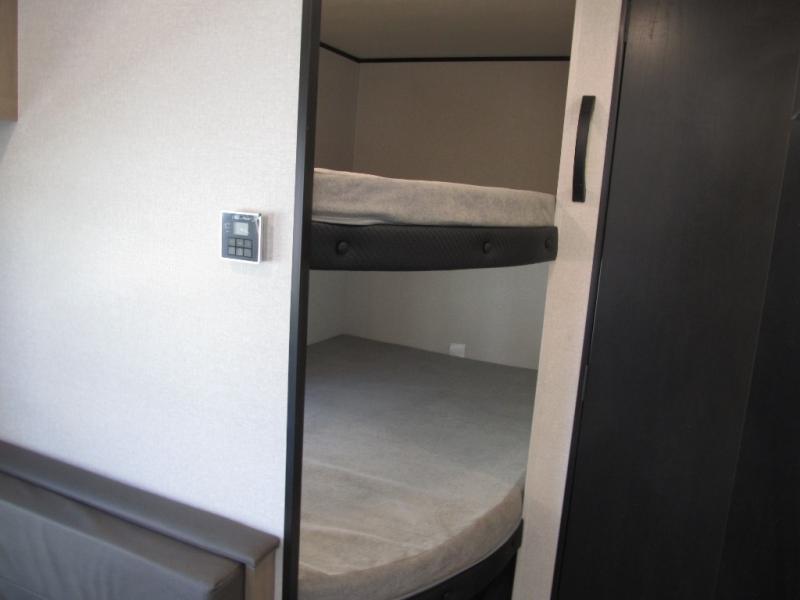 You can comfortably sleep eight to ten people in this trailer thanks to the double-size bunks, the RV queen bed in the front bedroom, plus the booth dinette and jack-knife sofa in the main living area! The chef of your crew will have a three burner cooktop and microwave oven to prepare meals, and everyone can store their favorite drinks in the 8 cu. ft. 12V refrigerator. The bathroom includes a shower and a toilet, with the sink just outside of this room so others can brush their teeth if one is taking a shower before bed. The outside storage will let you bring along fishing poles and the 16' power awning with LED lights will create a nice place to gather in the evenings!