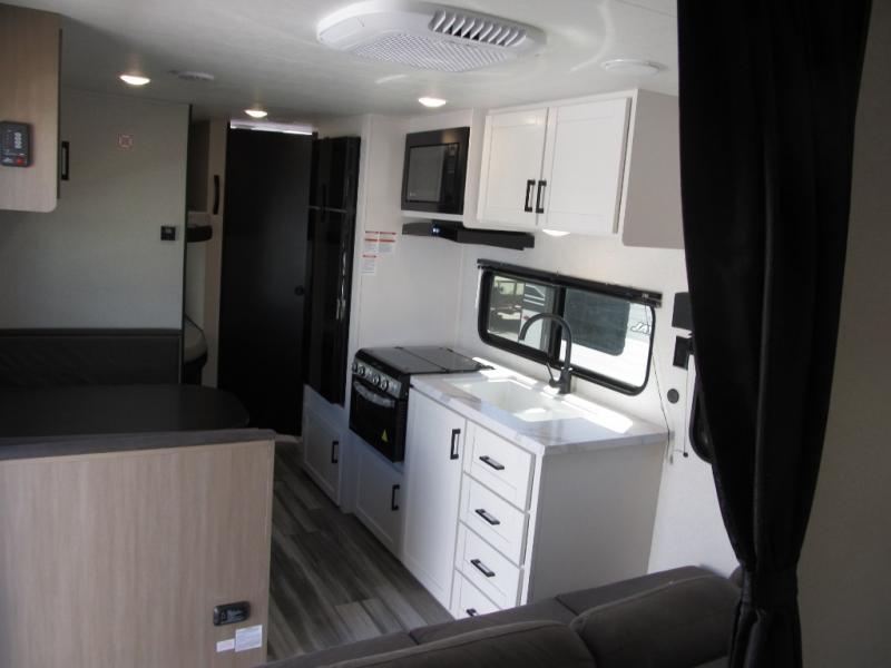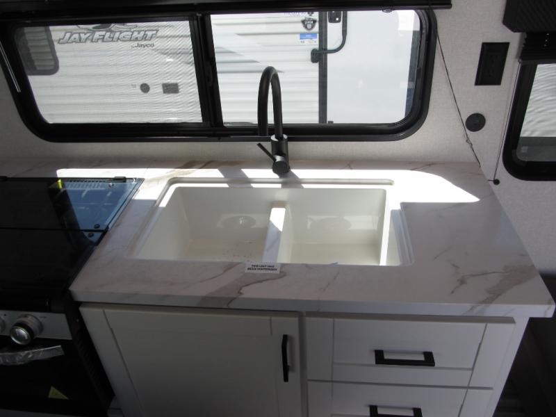 The Jayco Jay Flight SLX travel trailer is quite easy to own because it is lightweight for an easier towing experience. Built on a fully integrated A-frame with galvanized-steel, impact-resistant wheel wells, the Jay Flight SLX has quality at its very foundation. That quality continues on to the electric self-adjusting brakes, easy-lube hubs, Magnum Truss roof system, and LP quick connect. Some of what the mandatory Customer Value Package includes is backup camera prep, Keyed-Alike entry and baggage doors, and an on-demand tankless water heater.