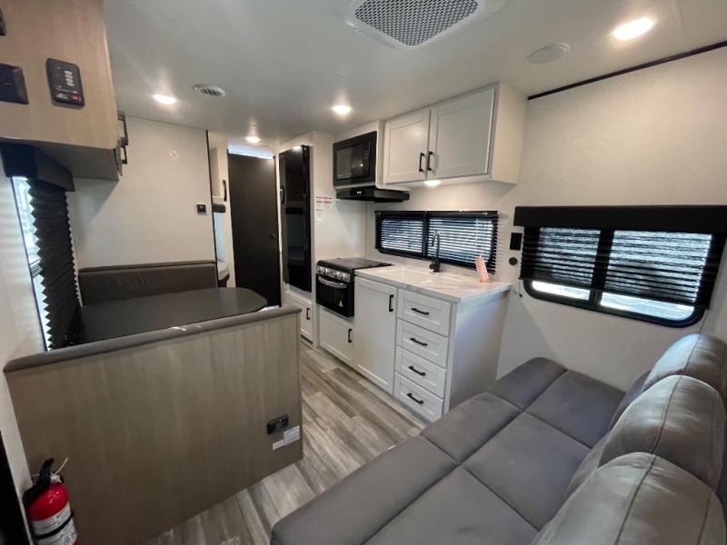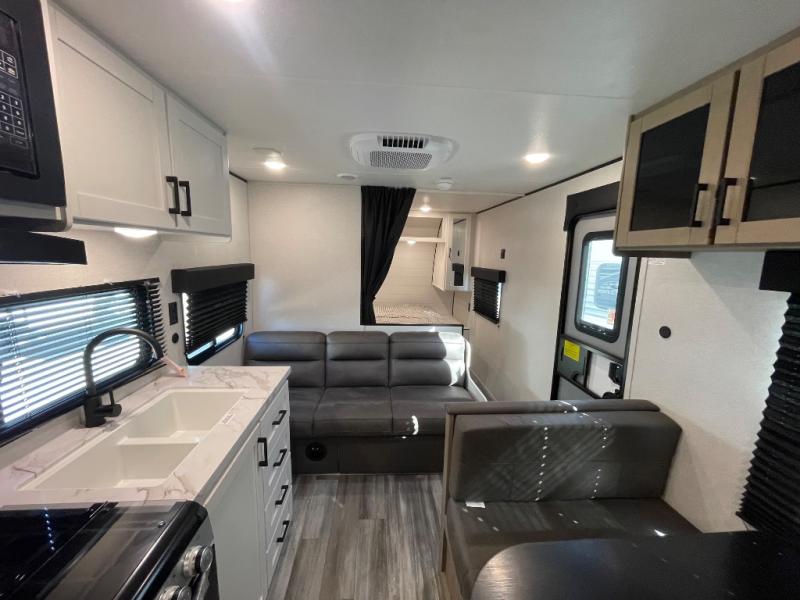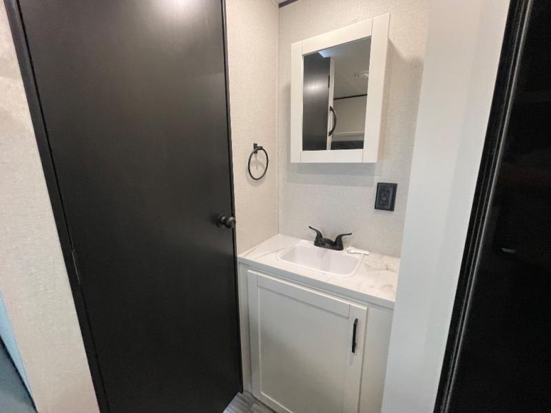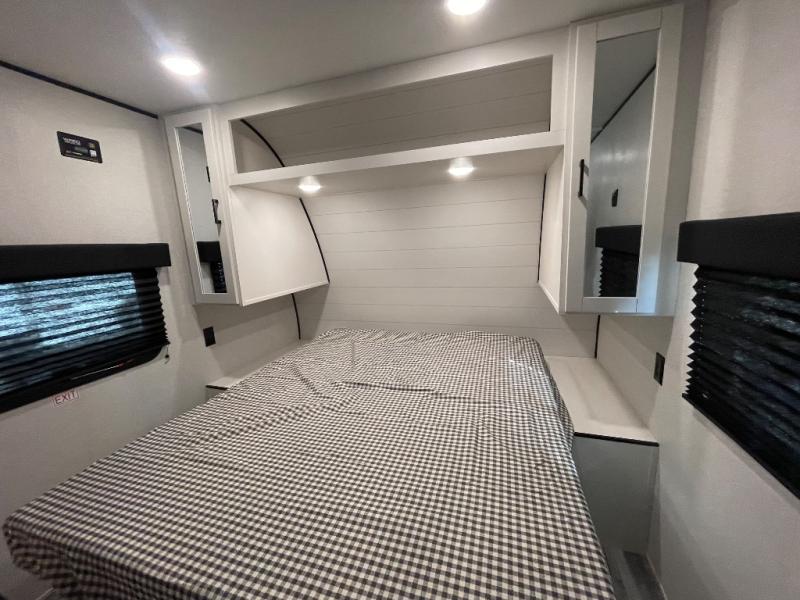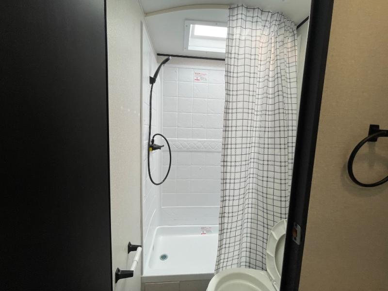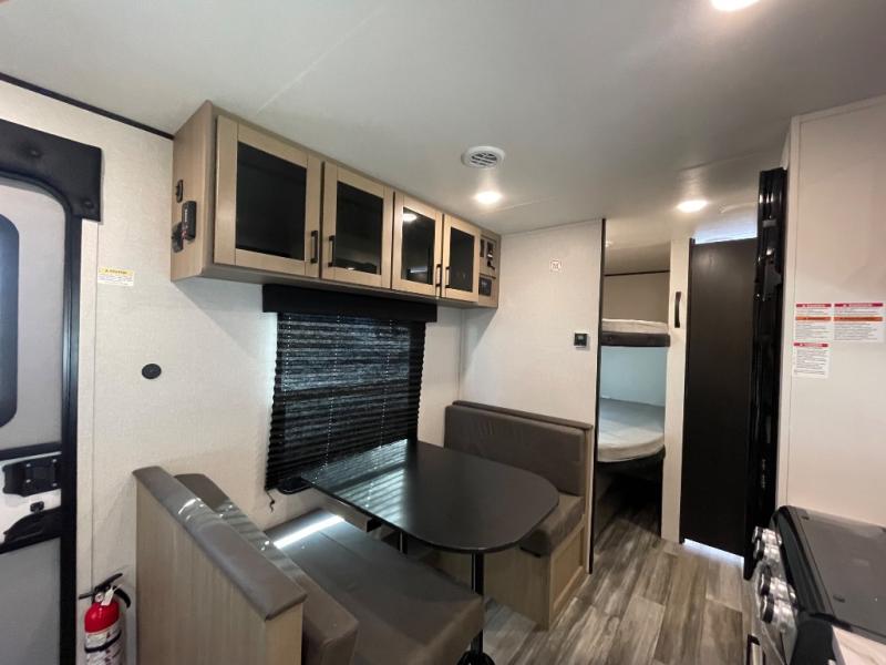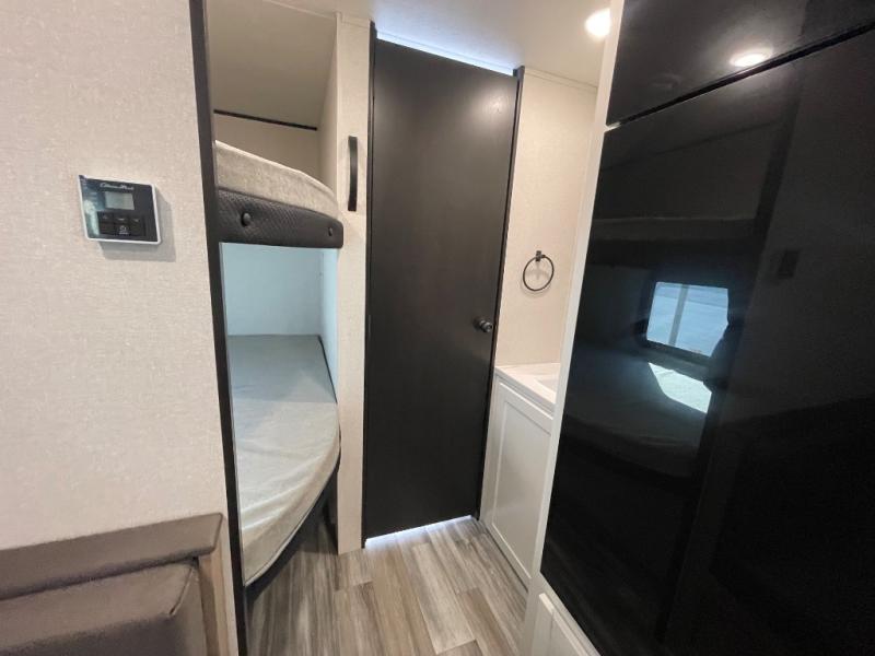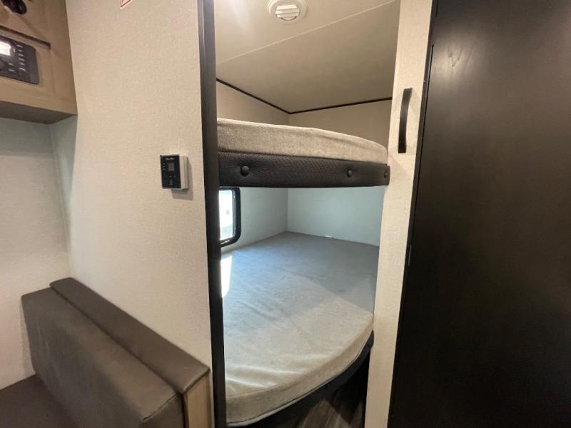 You can comfortably sleep eight to ten people in this trailer thanks to the double-size bunks, the RV queen bed in the front bedroom, plus the booth dinette and jack-knife sofa in the main living area! The chef of your crew will have a three burner cooktop and microwave oven to prepare meals, and everyone can store their favorite drinks in the 8 cu. ft. 12V refrigerator. The bathroom includes a shower and a toilet, with the sink just outside of this room so others can brush their teeth if one is taking a shower before bed. The outside storage will let you bring along fishing poles and the 16' power awning with LED lights will create a nice place to gather in the evenings!