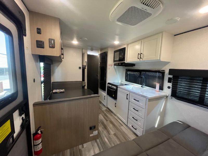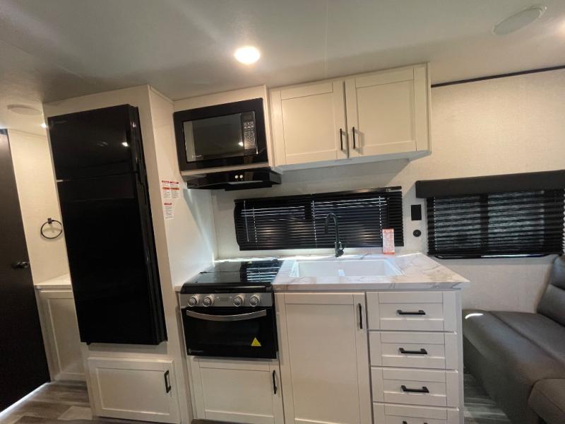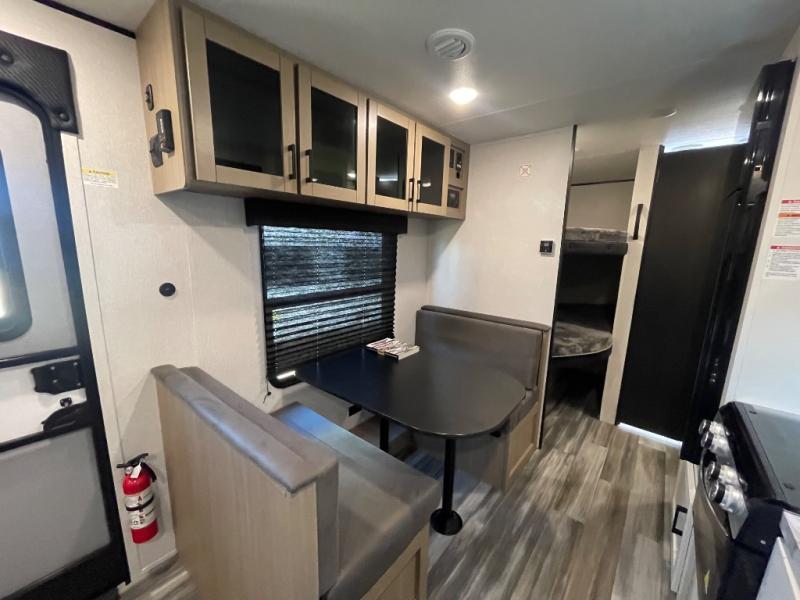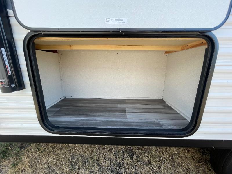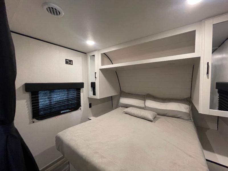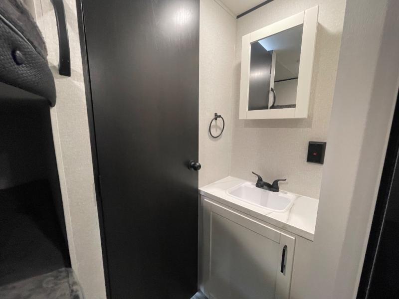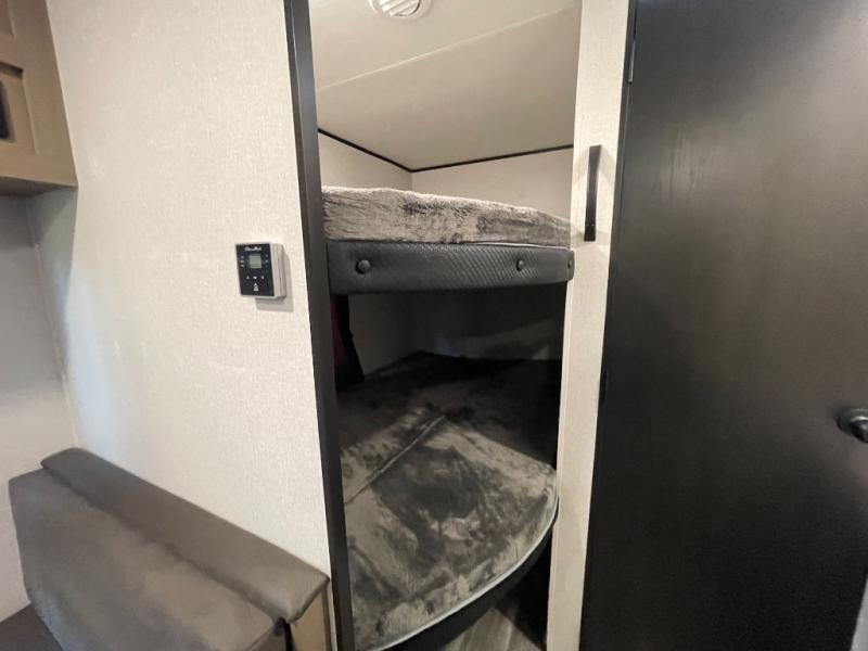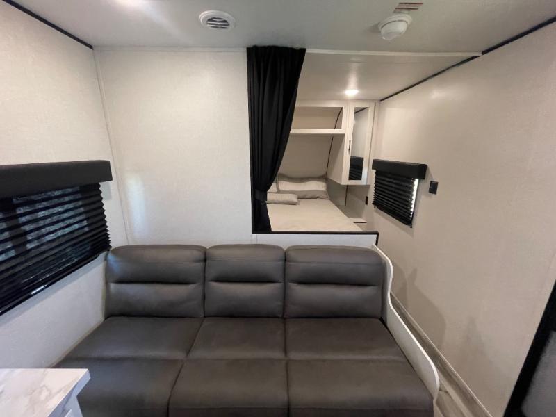 You can comfortably sleep eight to ten people in this trailer thanks to the double-size bunks, the RV queen bed in the front bedroom, plus the booth dinette and jack-knife sofa in the main living area! The chef of your crew will have a three burner cooktop and microwave oven to prepare meals, and everyone can store their favorite drinks in the 8 cu. ft. 12V refrigerator. The bathroom includes a shower and a toilet, with the sink just outside of this room so others can brush their teeth if one is taking a shower before bed. The outside storage will let you bring along fishing poles and the 16' power awning with LED lights will create a nice place to gather in the evenings!