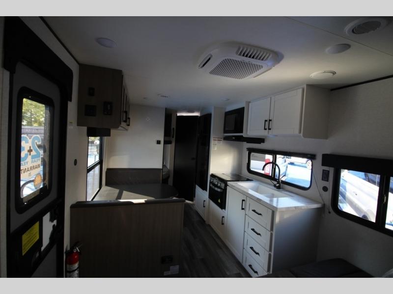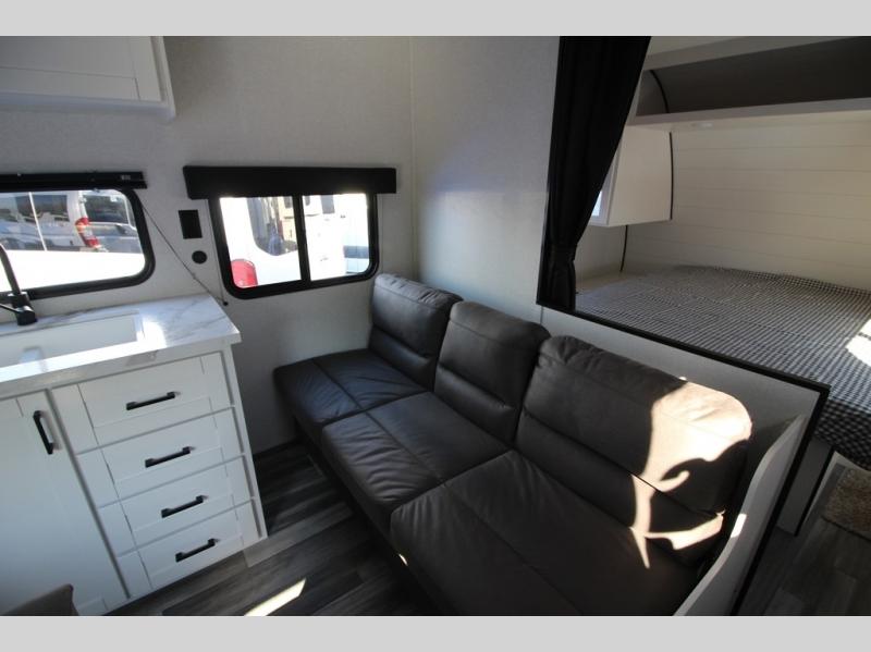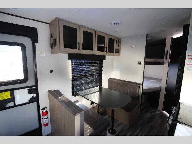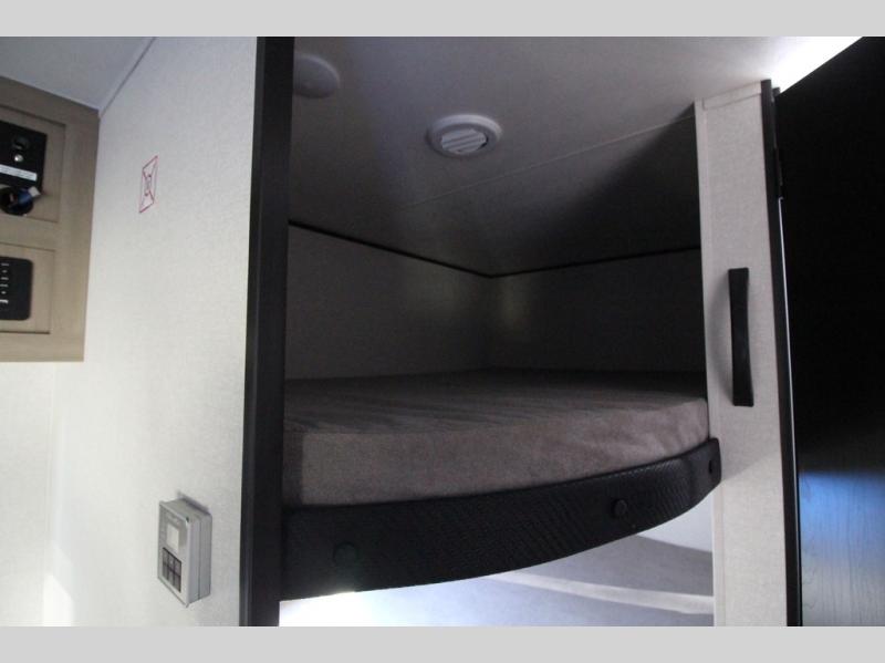 You can comfortably sleep eight to ten people in this trailer thanks to the double-size bunks, the RV queen bed in the front bedroom, plus the booth dinette and jack-knife sofa in the main living area! The chef of your crew will have a three burner cooktop and microwave oven to prepare meals, and everyone can store their favorite drinks in the 8 cu. ft. 12V refrigerator. The bathroom includes a shower and a toilet, with the sink just outside of this room so others can brush their teeth if one is taking a shower before bed. The outside storage will let you bring along fishing poles and the 16' power awning with LED lights will create a nice place to gather in the evenings!