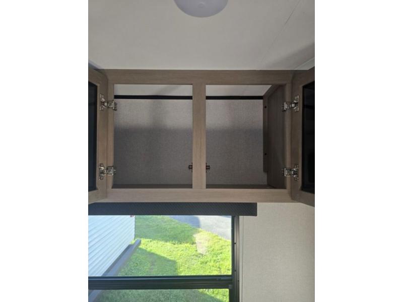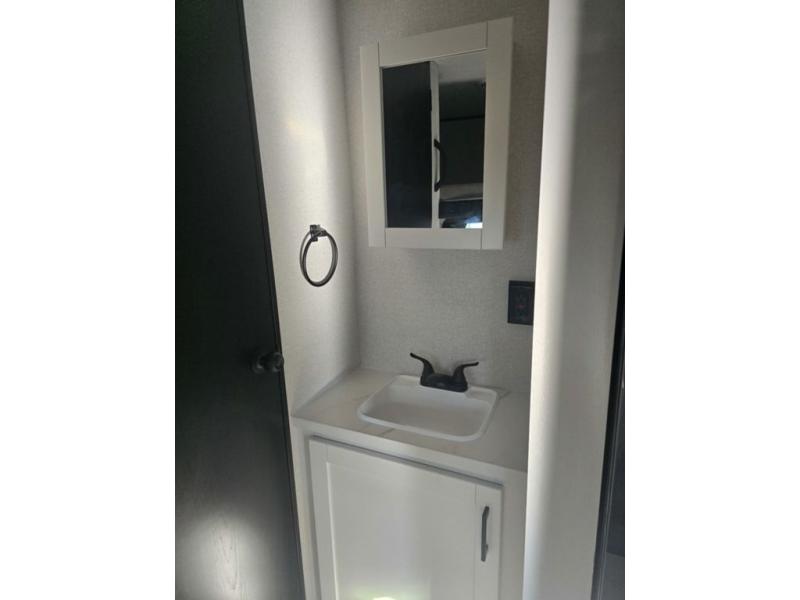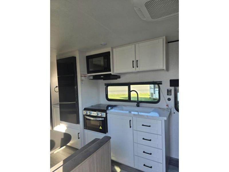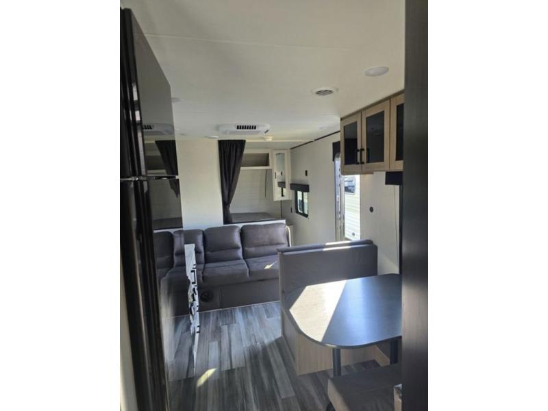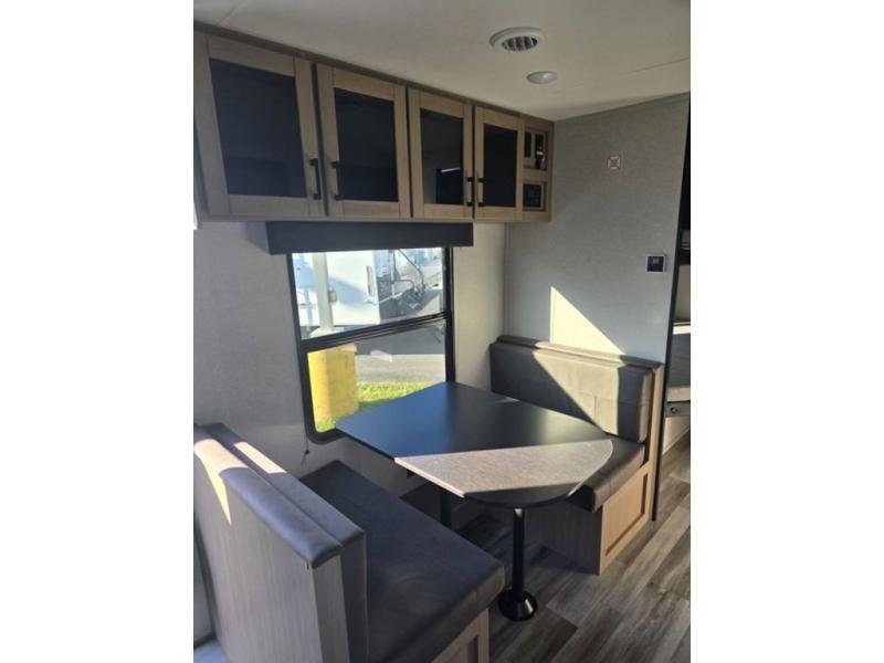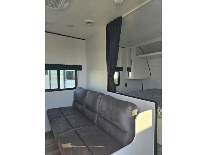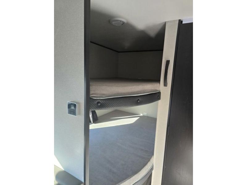 You can comfortably sleep eight to ten people in this trailer thanks to the double-size bunks, the RV queen bed in the front bedroom, plus the booth dinette and jack-knife sofa in the main living area! The chef of your crew will have a three burner cooktop and microwave oven to prepare meals, and everyone can store their favorite drinks in the 8 cu. ft. 12V refrigerator. The bathroom includes a shower and a toilet, with the sink just outside of this room so others can brush their teeth if one is taking a shower before bed. The outside storage will let you bring along fishing poles and the 16' power awning with LED lights will create a nice place to gather in the evenings!
