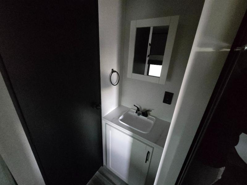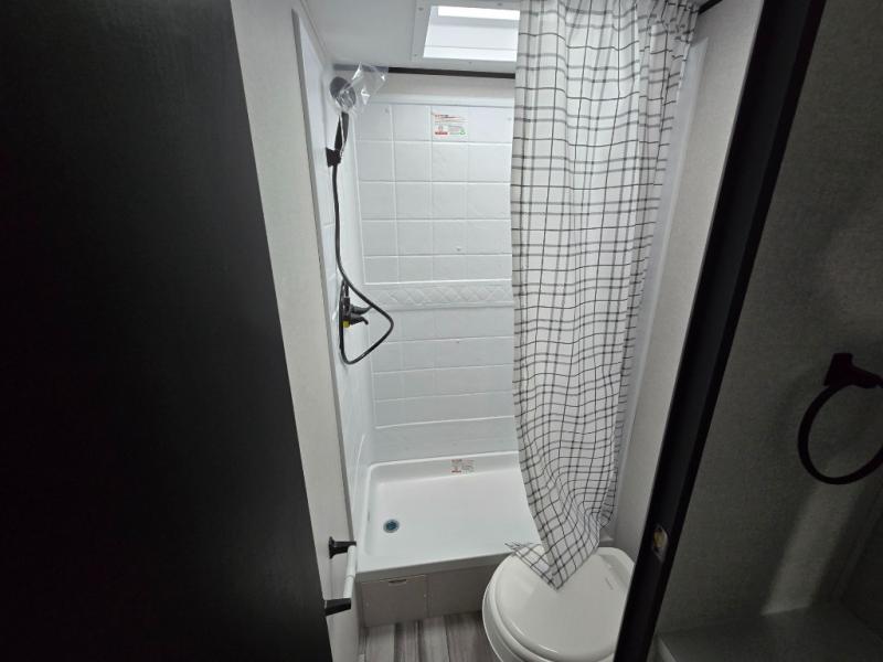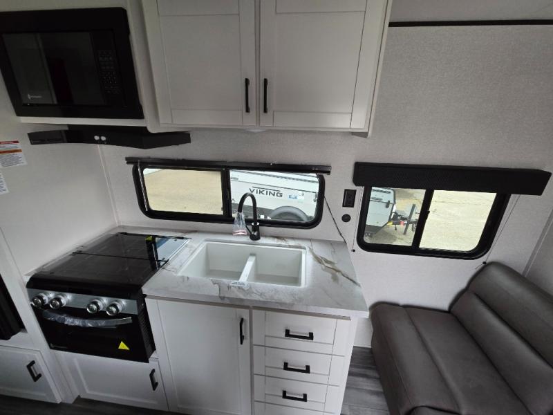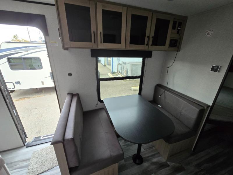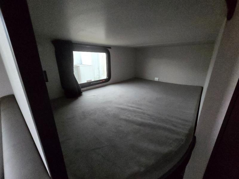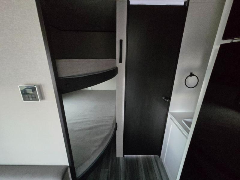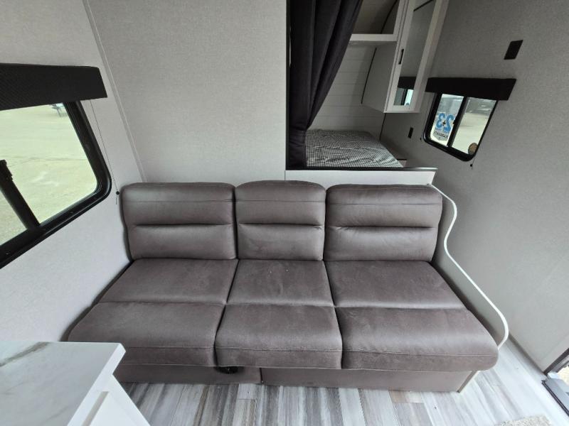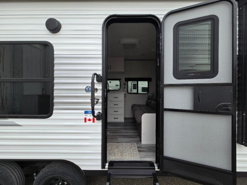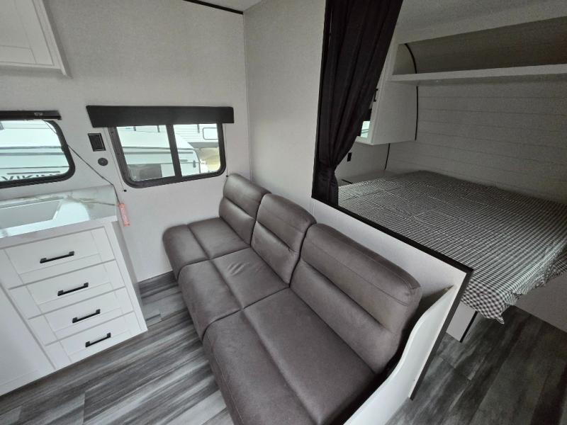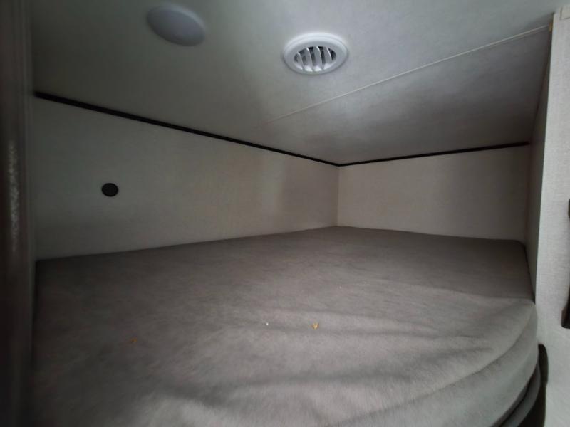 You can comfortably sleep eight to ten people in this trailer thanks to the double-size bunks, the RV queen bed in the front bedroom, plus the booth dinette and jack-knife sofa in the main living area! The chef of your crew will have a three burner cooktop and microwave oven to prepare meals, and everyone can store their favorite drinks in the 8 cu. ft. 12V refrigerator. The bathroom includes a shower and a toilet, with the sink just outside of this room so others can brush their teeth if one is taking a shower before bed. The outside storage will let you bring along fishing poles and the 16' power awning with LED lights will create a nice place to gather in the evenings!