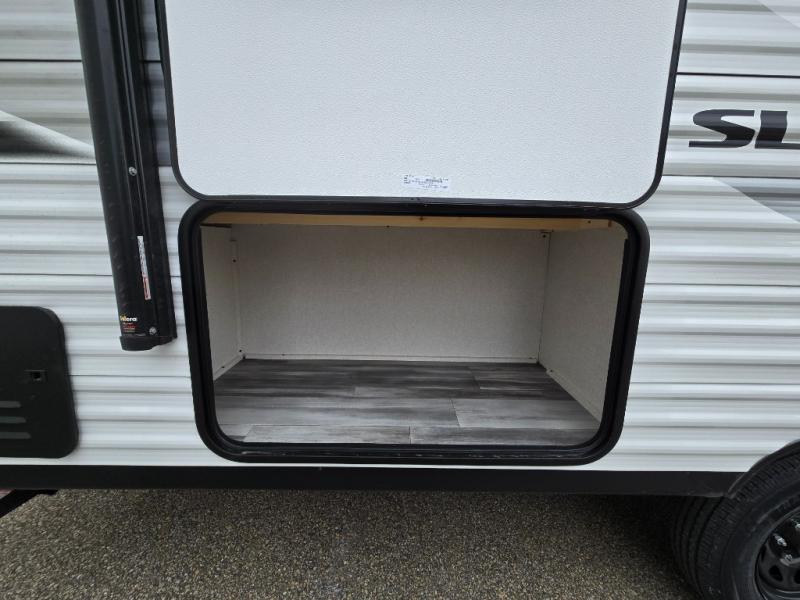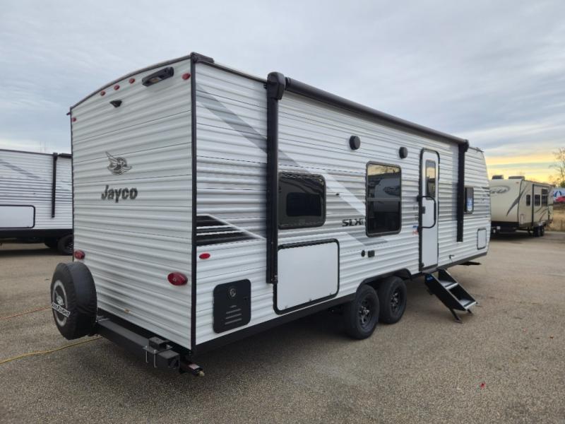 The Jayco Jay Flight SLX travel trailer is quite easy to own because it is lightweight for an easier towing experience. Built on a fully integrated A-frame with galvanized-steel, impact-resistant wheel wells, the Jay Flight SLX has quality at its very foundation. That quality continues on to the electric self-adjusting brakes, easy-lube hubs, Magnum Truss roof system, and LP quick connect. Some of what the mandatory Customer Value Package includes is backup camera prep, Keyed-Alike entry and baggage doors, and an on-demand tankless water heater.