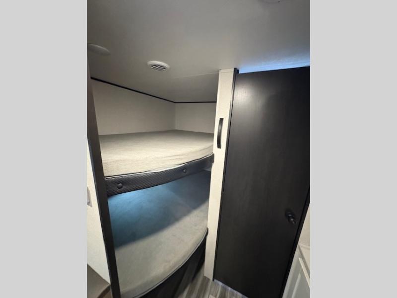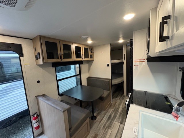 You can comfortably sleep eight to ten people in this trailer thanks to the double-size bunks, the RV queen bed in the front bedroom, plus the booth dinette and jack-knife sofa in the main living area! The chef of your crew will have a three burner cooktop and microwave oven to prepare meals, and everyone can store their favorite drinks in the 8 cu. ft. 12V refrigerator. The bathroom includes a shower and a toilet, with the sink just outside of this room so others can brush their teeth if one is taking a shower before bed. The outside storage will let you bring along fishing poles and the 16' power awning with LED lights will create a nice place to gather in the evenings!