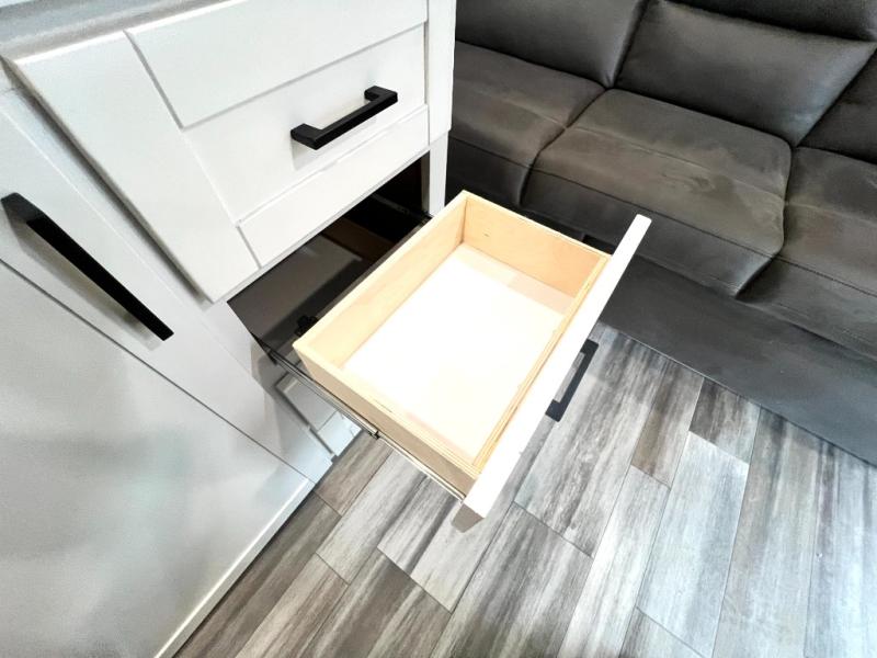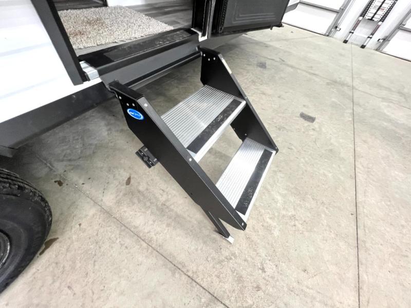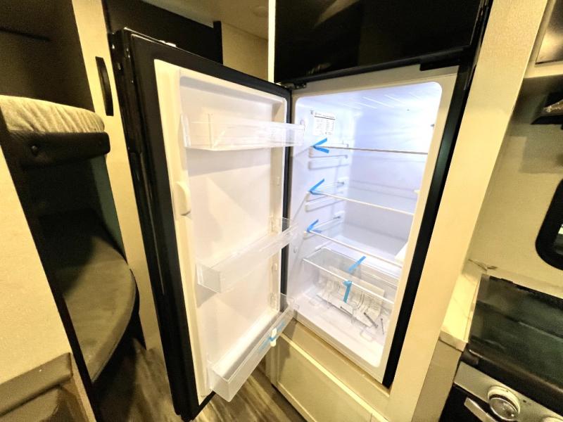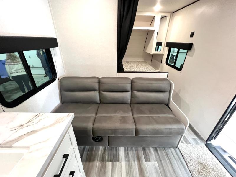 You can comfortably sleep eight to ten people in this trailer thanks to the double-size bunks, the RV queen bed in the front bedroom, plus the booth dinette and jack-knife sofa in the main living area! The chef of your crew will have a three burner cooktop and microwave oven to prepare meals, and everyone can store their favorite drinks in the 8 cu. ft. 12V refrigerator. The bathroom includes a shower and a toilet, with the sink just outside of this room so others can brush their teeth if one is taking a shower before bed. The outside storage will let you bring along fishing poles and the 16' power awning with LED lights will create a nice place to gather in the evenings!