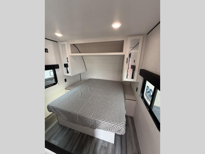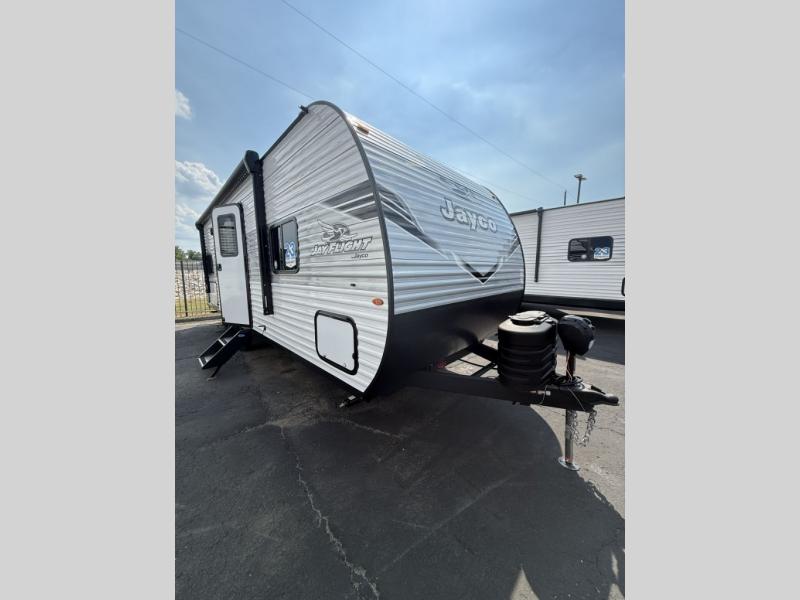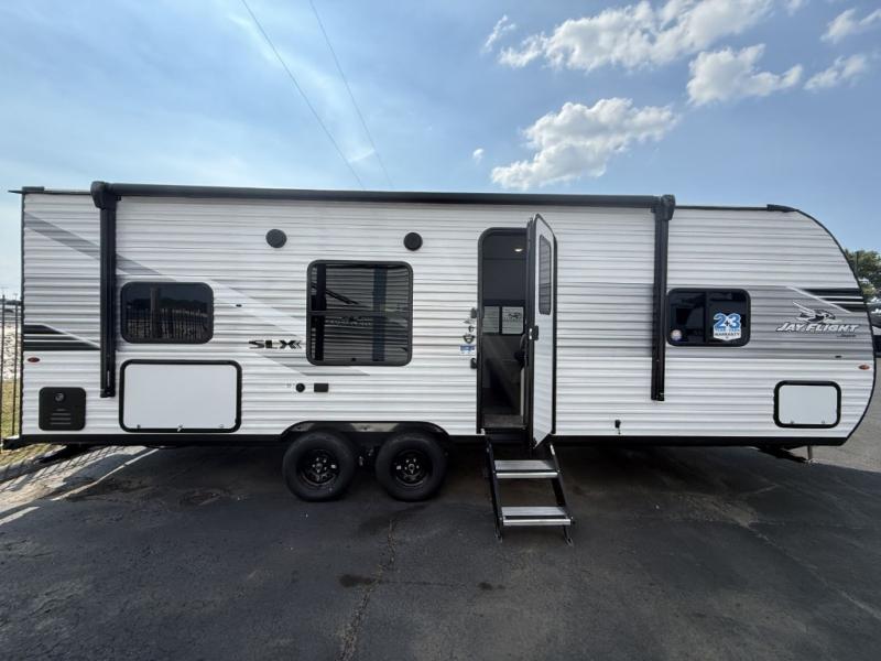 The Jayco Jay Flight SLX travel trailer is quite easy to own because it is lightweight for an easier towing experience. Built on a fully integrated A-frame with galvanized-steel, impact-resistant wheel wells, the Jay Flight SLX has quality at its very foundation. That quality continues on to the electric self-adjusting brakes, easy-lube hubs, Magnum Truss roof system, and LP quick connect. Some of what the mandatory Customer Value Package includes is backup camera prep, Keyed-Alike entry and baggage doors, and an on-demand tankless water heater.