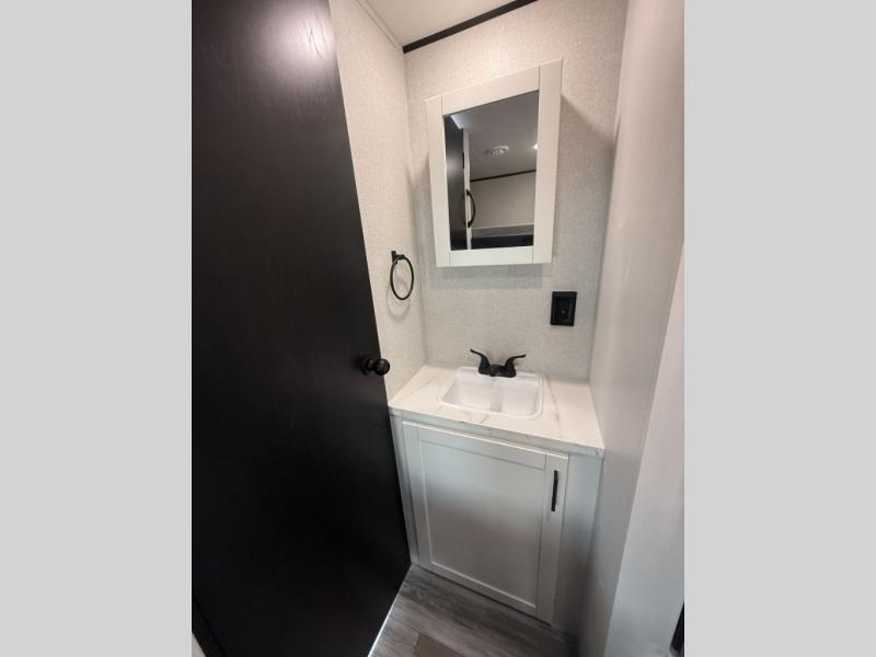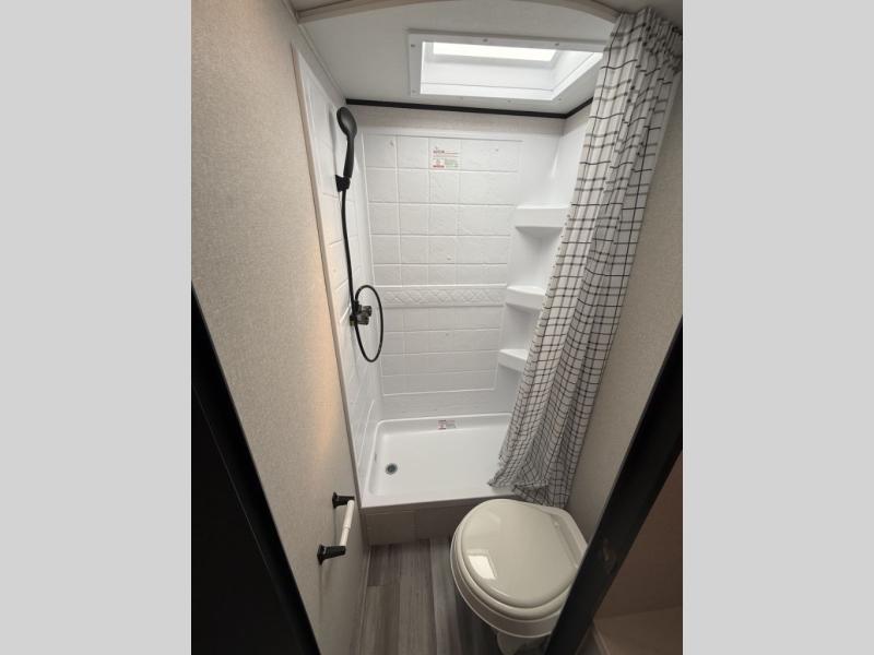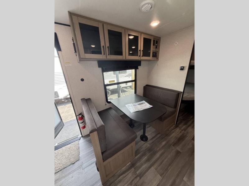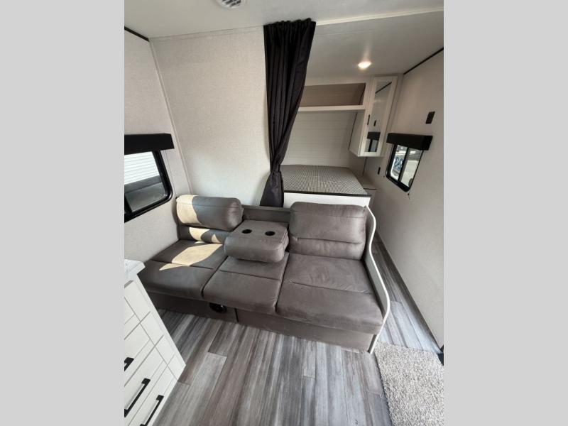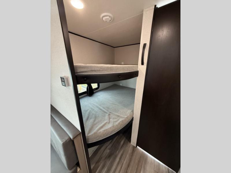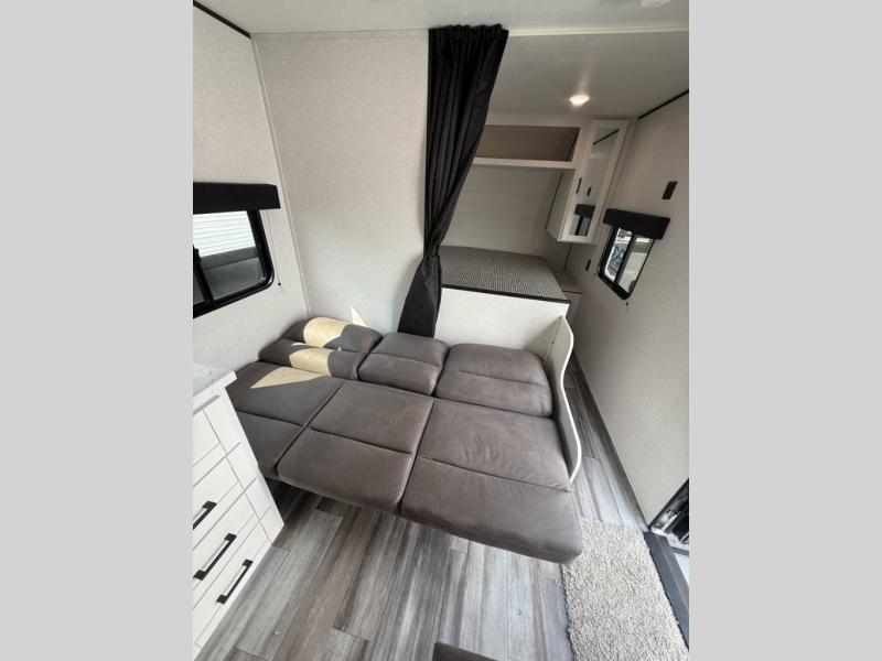 You can comfortably sleep eight to ten people in this trailer thanks to the double-size bunks, the RV queen bed in the front bedroom, plus the booth dinette and jack-knife sofa in the main living area! The chef of your crew will have a three burner cooktop and microwave oven to prepare meals, and everyone can store their favorite drinks in the 8 cu. ft. 12V refrigerator. The bathroom includes a shower and a toilet, with the sink just outside of this room so others can brush their teeth if one is taking a shower before bed. The outside storage will let you bring along fishing poles and the 16' power awning with LED lights will create a nice place to gather in the evenings!