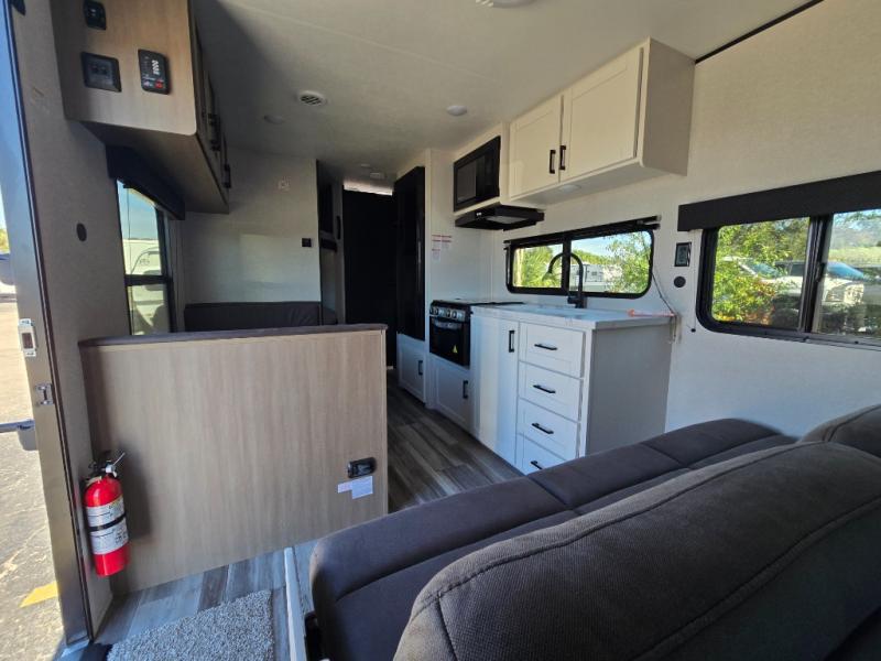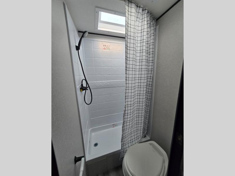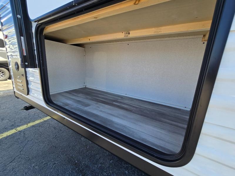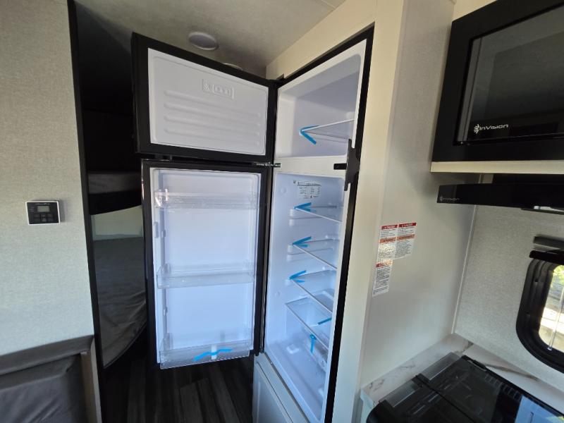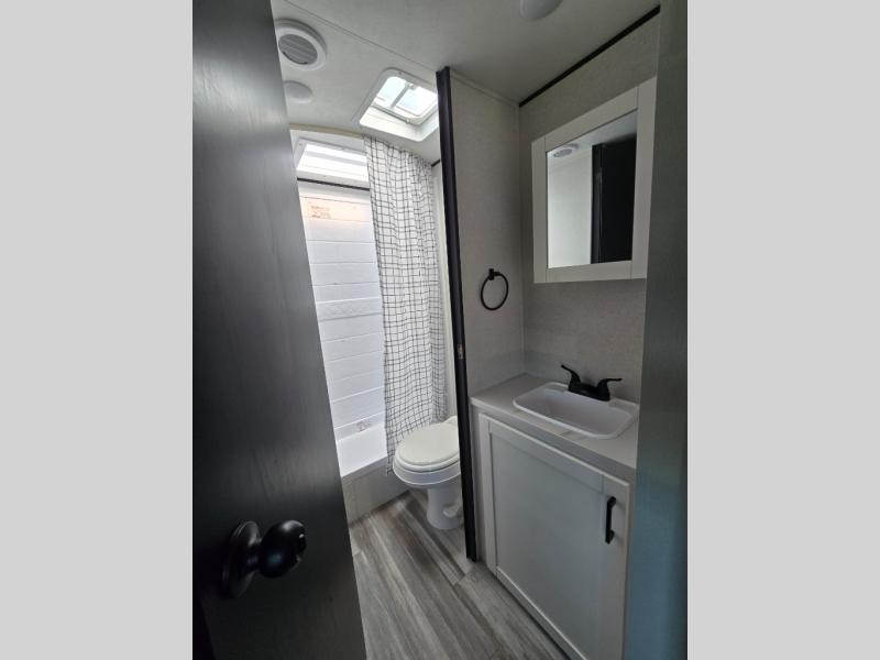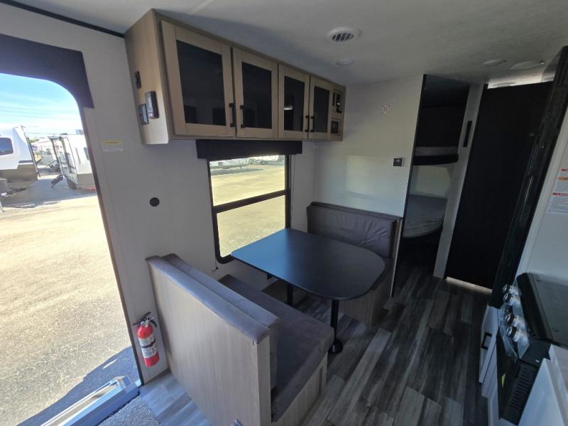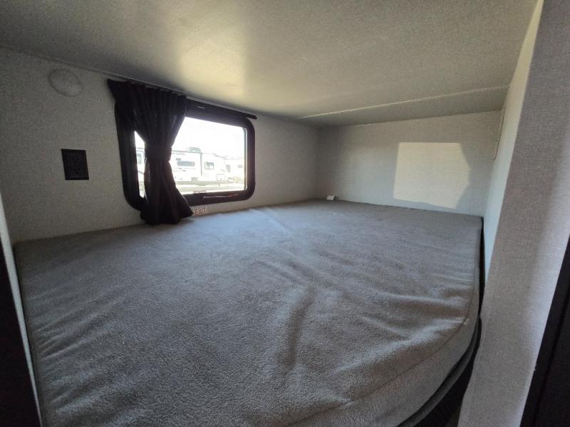 You can comfortably sleep eight to ten people in this trailer thanks to the double-size bunks, the RV queen bed in the front bedroom, plus the booth dinette and jack-knife sofa in the main living area! The chef of your crew will have a three burner cooktop and microwave oven to prepare meals, and everyone can store their favorite drinks in the 8 cu. ft. 12V refrigerator. The bathroom includes a shower and a toilet, with the sink just outside of this room so others can brush their teeth if one is taking a shower before bed. The outside storage will let you bring along fishing poles and the 16' power awning with LED lights will create a nice place to gather in the evenings!