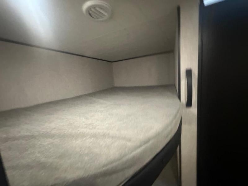 You can comfortably sleep eight to ten people in this trailer thanks to the double-size bunks, the RV queen bed in the front bedroom, plus the booth dinette and jack-knife sofa in the main living area! The chef of your crew will have a three burner cooktop and microwave oven to prepare meals, and everyone can store their favorite drinks in the 8 cu. ft. 12V refrigerator. The bathroom includes a shower and a toilet, with the sink just outside of this room so others can brush their teeth if one is taking a shower before bed. The outside storage will let you bring along fishing poles and the 16' power awning with LED lights will create a nice place to gather in the evenings!