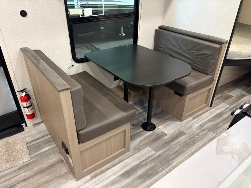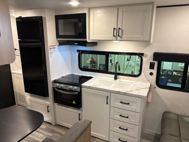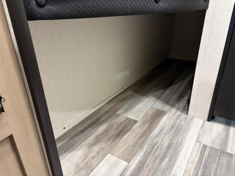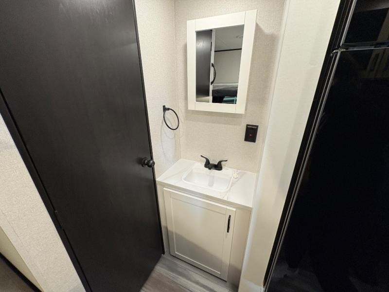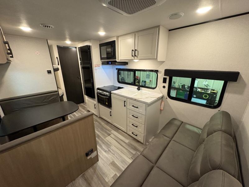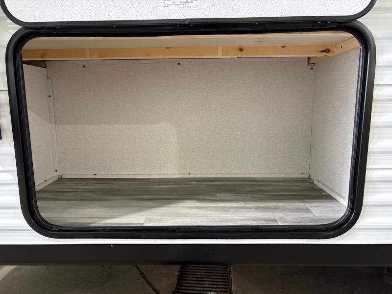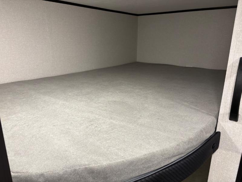 You can comfortably sleep eight to ten people in this trailer thanks to the double-size bunks, the RV queen bed in the front bedroom, plus the booth dinette and jack-knife sofa in the main living area! The chef of your crew will have a three burner cooktop and microwave oven to prepare meals, and everyone can store their favorite drinks in the 8 cu. ft. 12V refrigerator. The bathroom includes a shower and a toilet, with the sink just outside of this room so others can brush their teeth if one is taking a shower before bed. The outside storage will let you bring along fishing poles and the 16' power awning with LED lights will create a nice place to gather in the evenings!