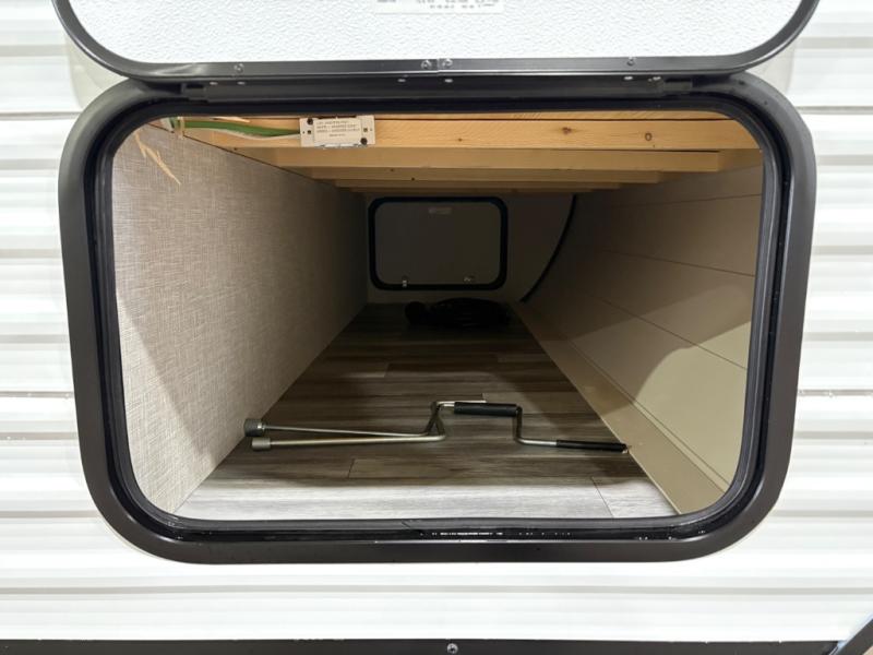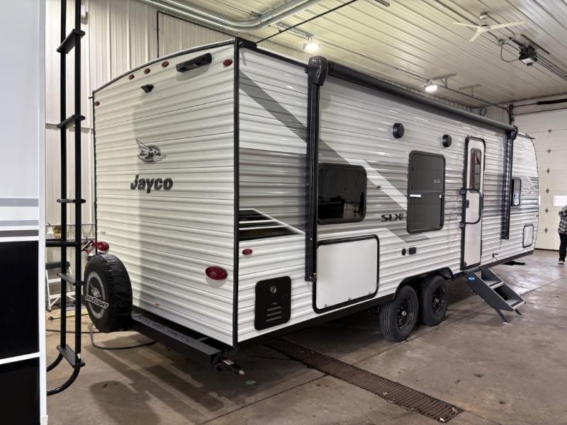 The Jayco Jay Flight SLX travel trailer is quite easy to own because it is lightweight for an easier towing experience. Built on a fully integrated A-frame with galvanized-steel, impact-resistant wheel wells, the Jay Flight SLX has quality at its very foundation. That quality continues on to the electric self-adjusting brakes, easy-lube hubs, Magnum Truss roof system, and LP quick connect. Some of what the mandatory Customer Value Package includes is backup camera prep, Keyed-Alike entry and baggage doors, and an on-demand tankless water heater.