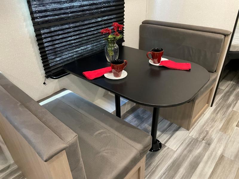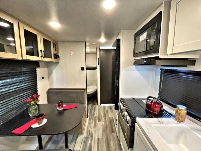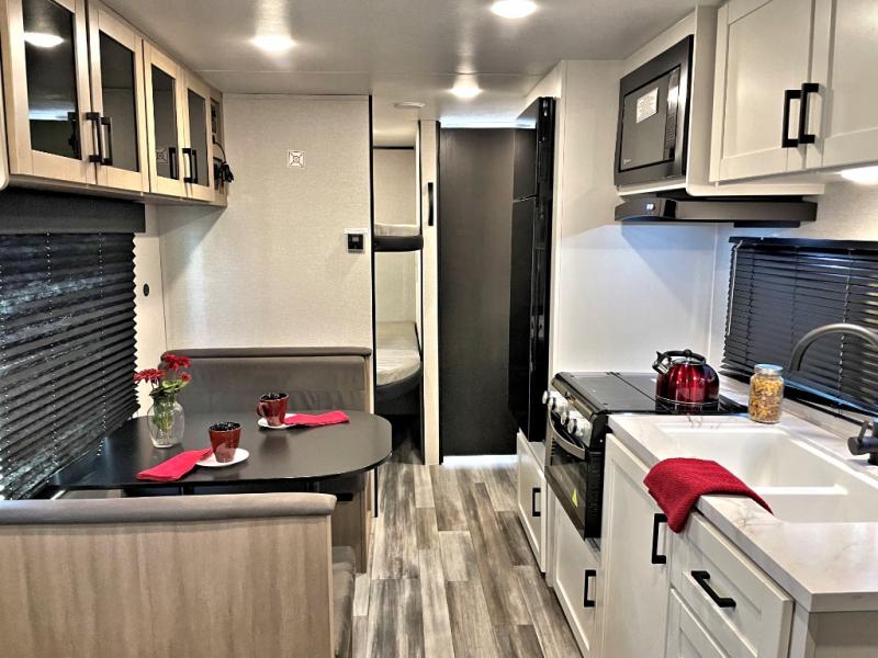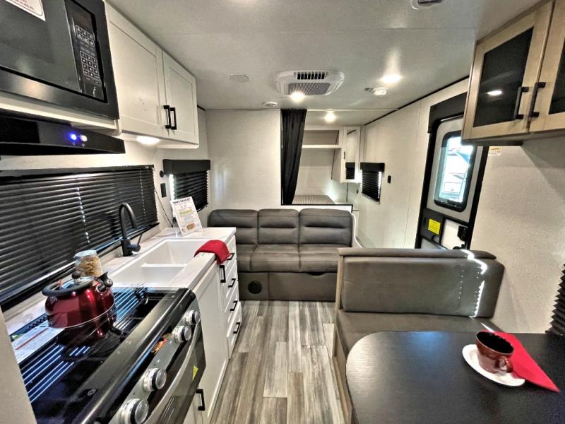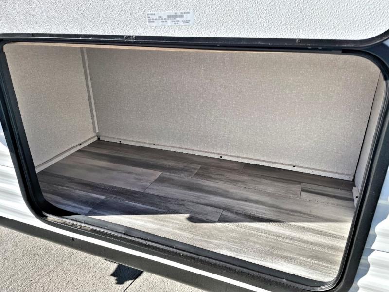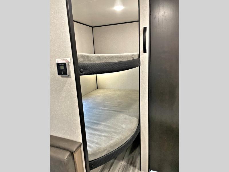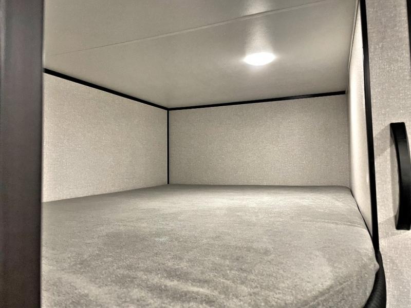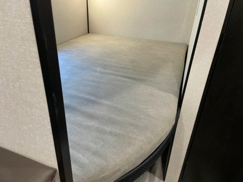 You can comfortably sleep up to eight people in this trailer thanks to the double-size bunks, the RV queen bed in the front bedroom, plus the booth dinette and jack-knife sofa in the main living area! The chef of your crew will have a three burner cooktop and microwave oven to prepare meals, and everyone can store their favorite drinks in the 8 cu. ft. 12V refrigerator. The bathroom includes a shower and a toilet, with the sink just outside of this room so others can brush their teeth if one is taking a shower before bed. The outside storage will let you bring along fishing poles and the 16' power awning with LED lights will create a nice place to gather in the evenings!