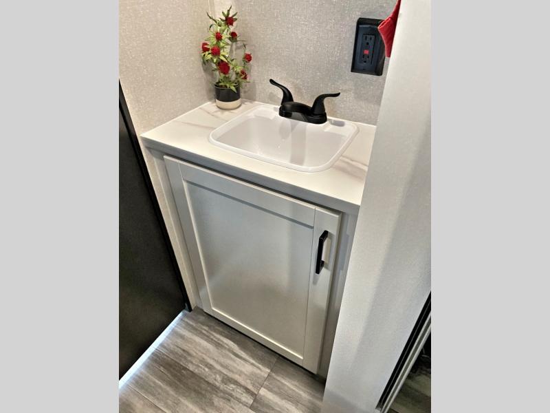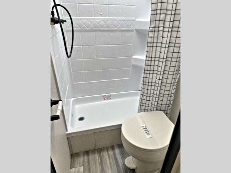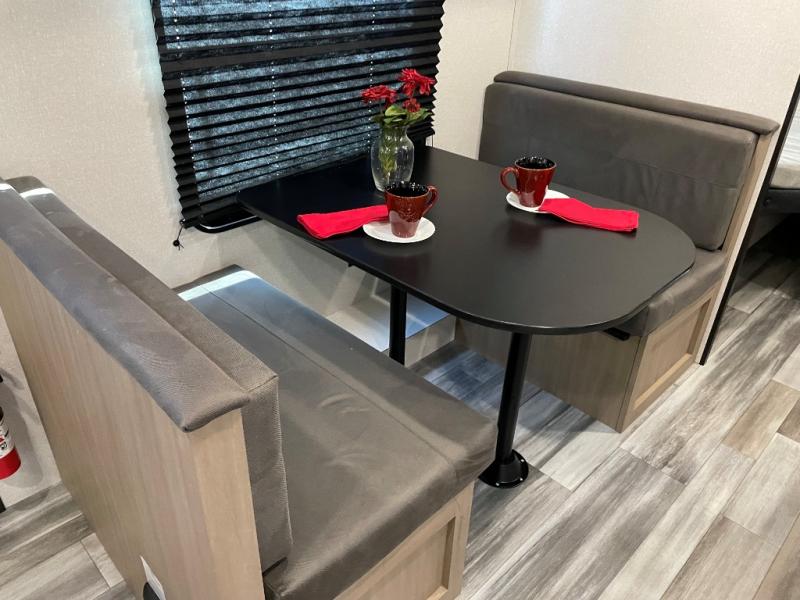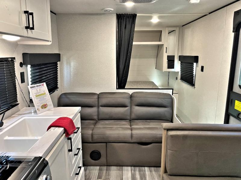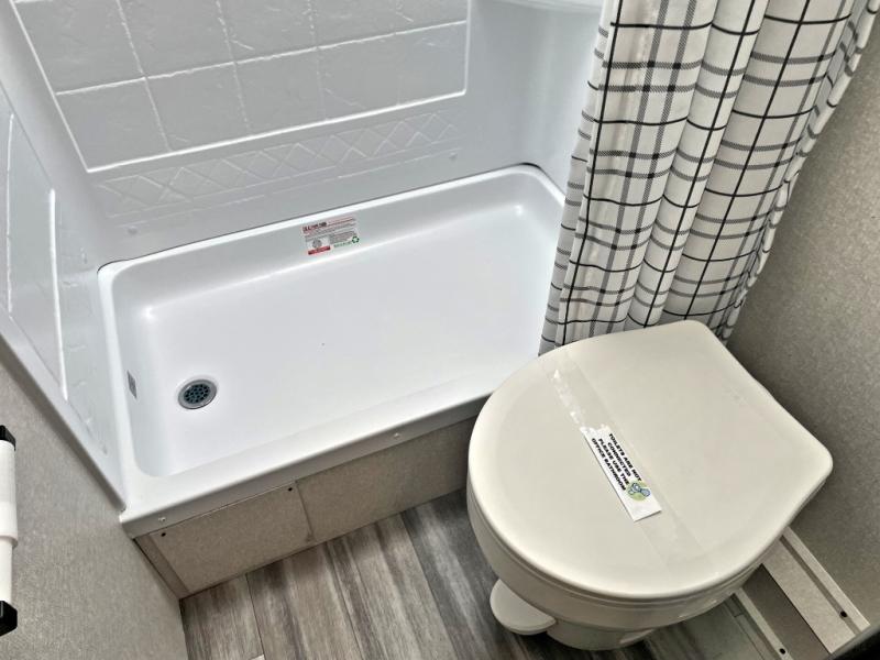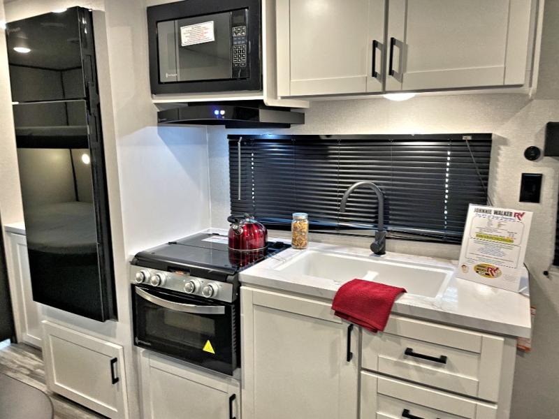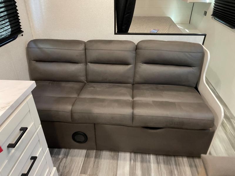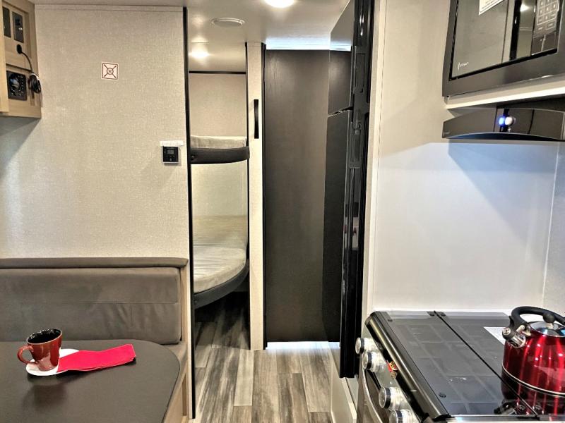 You can comfortably sleep up to eight people in this trailer thanks to the double-size bunks, the RV queen bed in the front bedroom, plus the booth dinette and jack-knife sofa in the main living area! The chef of your crew will have a three burner cooktop and microwave oven to prepare meals, and everyone can store their favorite drinks in the 8 cu. ft. 12V refrigerator. The bathroom includes a shower and a toilet, with the sink just outside of this room so others can brush their teeth if one is taking a shower before bed. The outside storage will let you bring along fishing poles and the 16' power awning with LED lights will create a nice place to gather in the evenings!