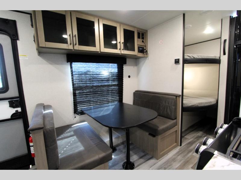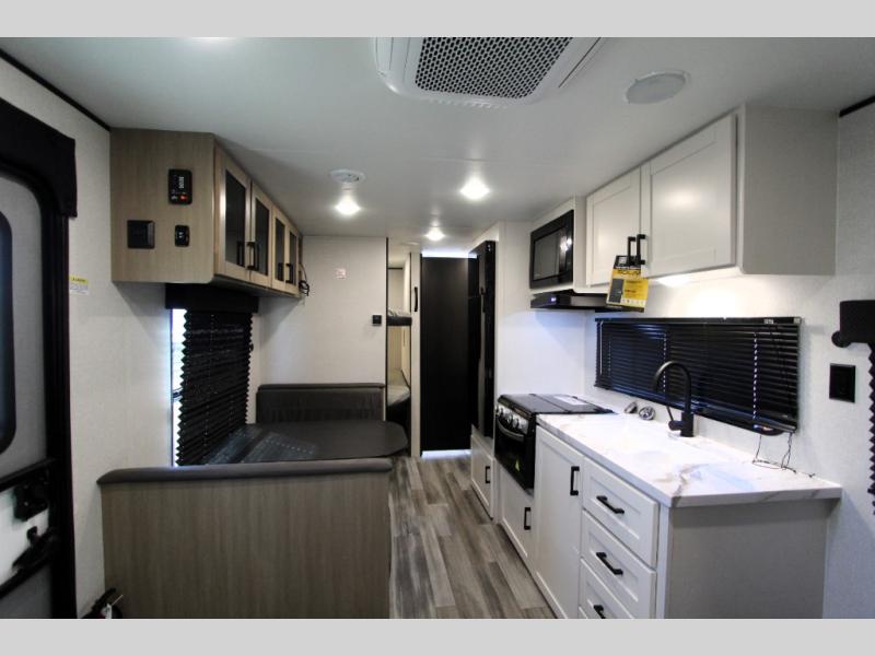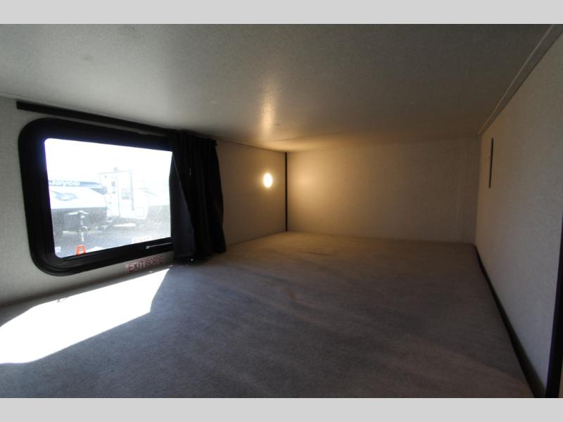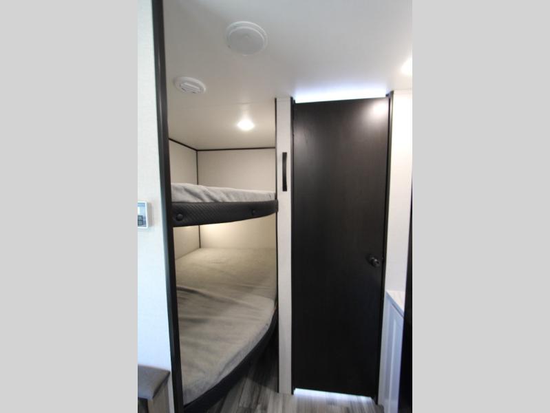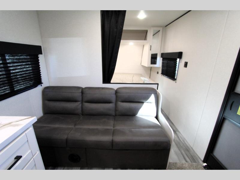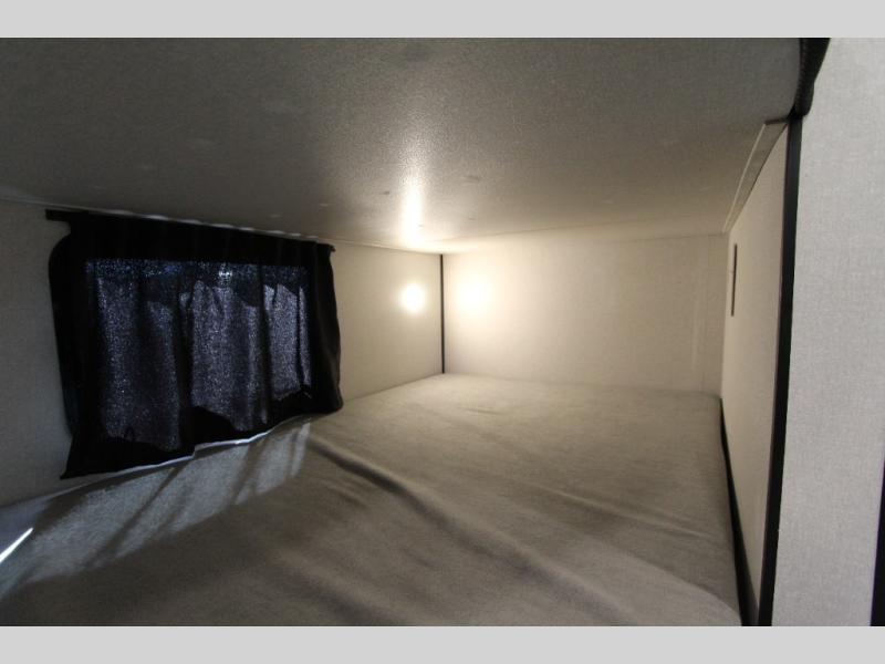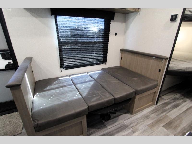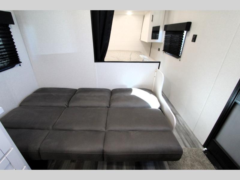 You can comfortably sleep up to eight people in this trailer thanks to the double-size bunks, the RV queen bed in the front bedroom, plus the booth dinette and jack-knife sofa in the main living area! The chef of your crew will have a three burner cooktop and microwave oven to prepare meals, and everyone can store their favorite drinks in the 8 cu. ft. 12V refrigerator. The bathroom includes a shower and a toilet, with the sink just outside of this room so others can brush their teeth if one is taking a shower before bed. The outside storage will let you bring along fishing poles and the 16' power awning with LED lights will create a nice place to gather in the evenings!