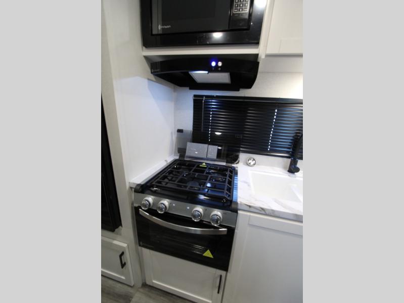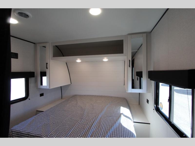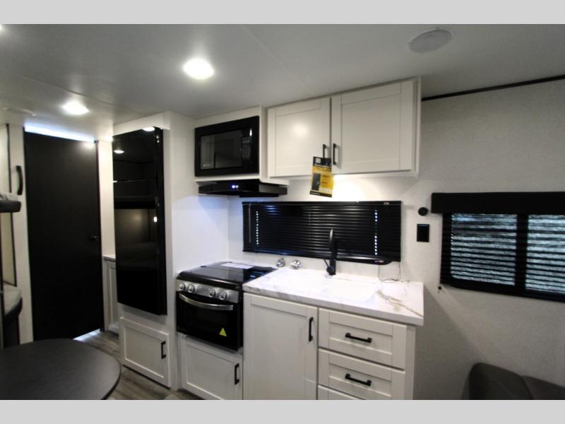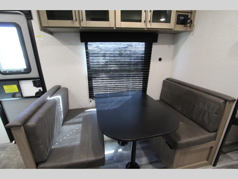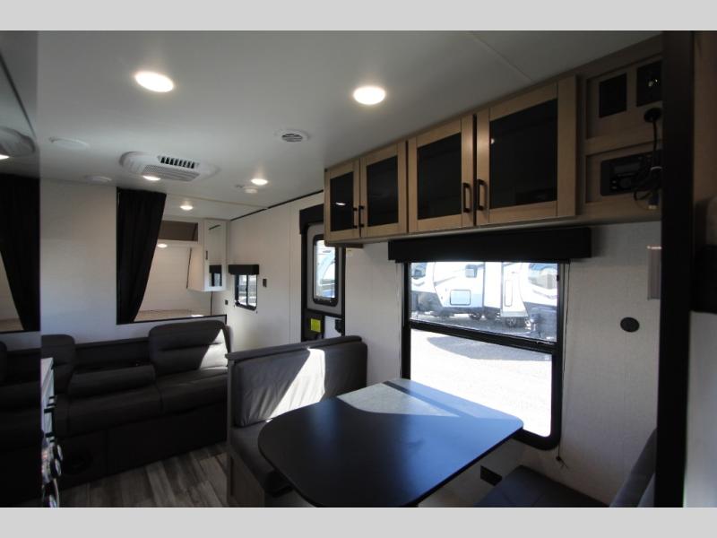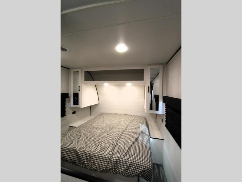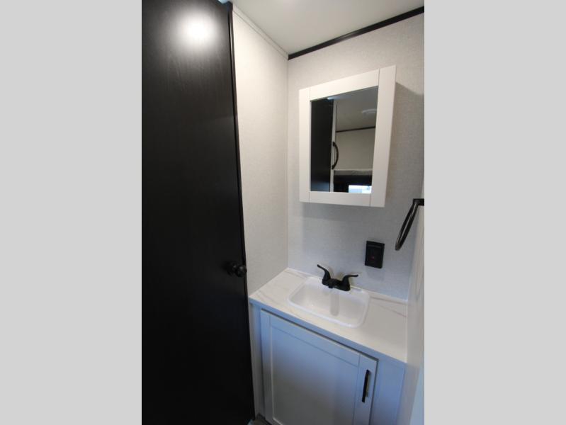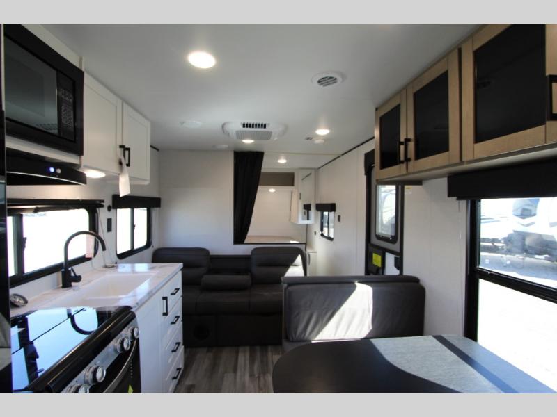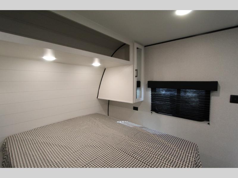 You can comfortably sleep up to eight people in this trailer thanks to the double-size bunks, the RV queen bed in the front bedroom, plus the booth dinette and jack-knife sofa in the main living area! The chef of your crew will have a three burner cooktop and microwave oven to prepare meals, and everyone can store their favorite drinks in the 8 cu. ft. 12V refrigerator. The bathroom includes a shower and a toilet, with the sink just outside of this room so others can brush their teeth if one is taking a shower before bed. The outside storage will let you bring along fishing poles and the 16' power awning with LED lights will create a nice place to gather in the evenings!