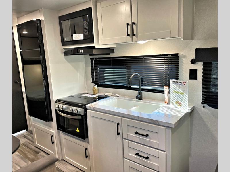 You can comfortably sleep up to eight people in this trailer thanks to the double-size bunks, the RV queen bed in the front bedroom, plus the booth dinette and jack-knife sofa in the main living area! The chef of your crew will have a three burner cooktop and microwave oven to prepare meals, and everyone can store their favorite drinks in the 8 cu. ft. 12V refrigerator. The bathroom includes a shower and a toilet, with the sink just outside of this room so others can brush their teeth if one is taking a shower before bed. The outside storage will let you bring along fishing poles and the 16' power awning with LED lights will create a nice place to gather in the evenings!