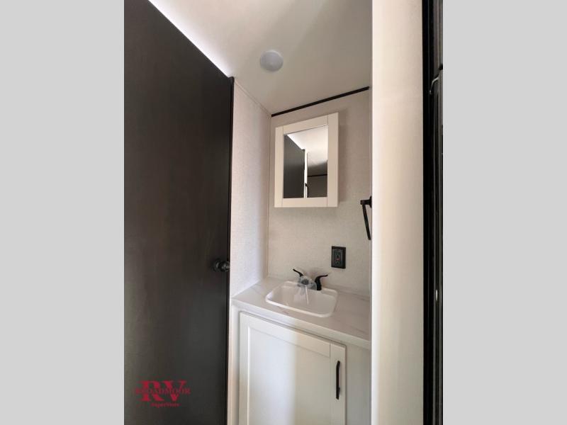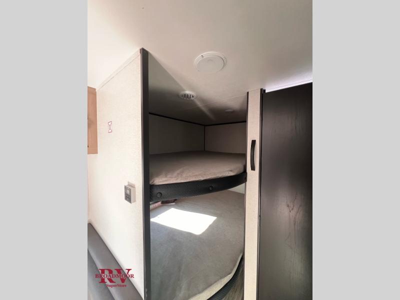 You can comfortably sleep up to eight people in this trailer thanks to the double-size bunks, the RV queen bed in the front bedroom, plus the booth dinette and jack-knife sofa in the main living area! The chef of your crew will have a three burner cooktop and microwave oven to prepare meals, and everyone can store their favorite drinks in the 8 cu. ft. 12V refrigerator. The bathroom includes a shower and a toilet, with the sink just outside of this room so others can brush their teeth if one is taking a shower before bed. The outside storage will let you bring along fishing poles and the 16' power awning with LED lights will create a nice place to gather in the evenings!