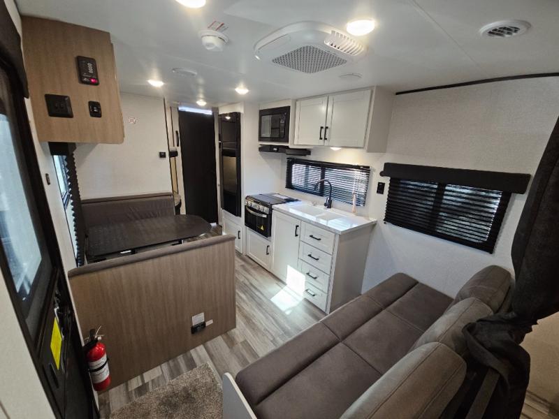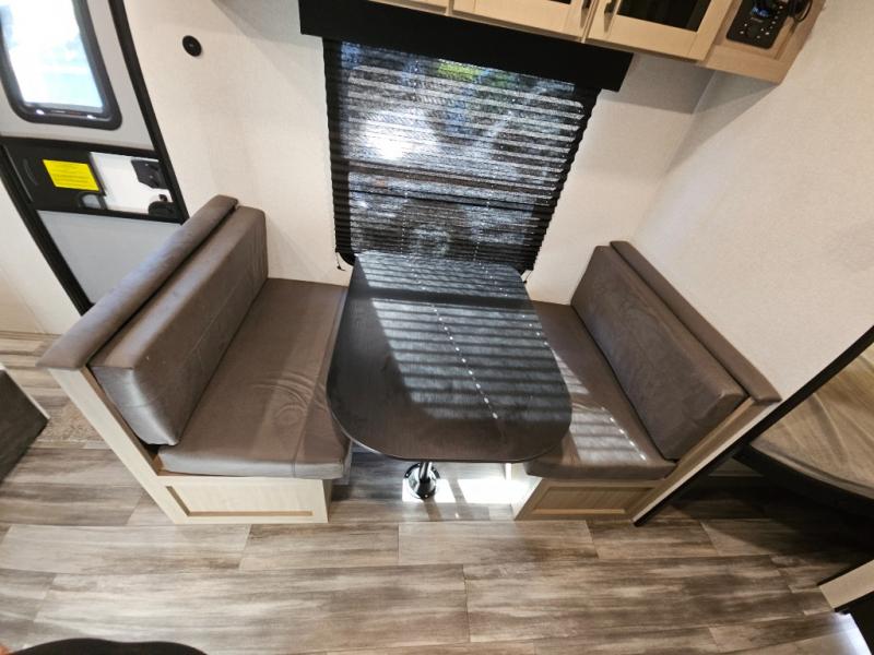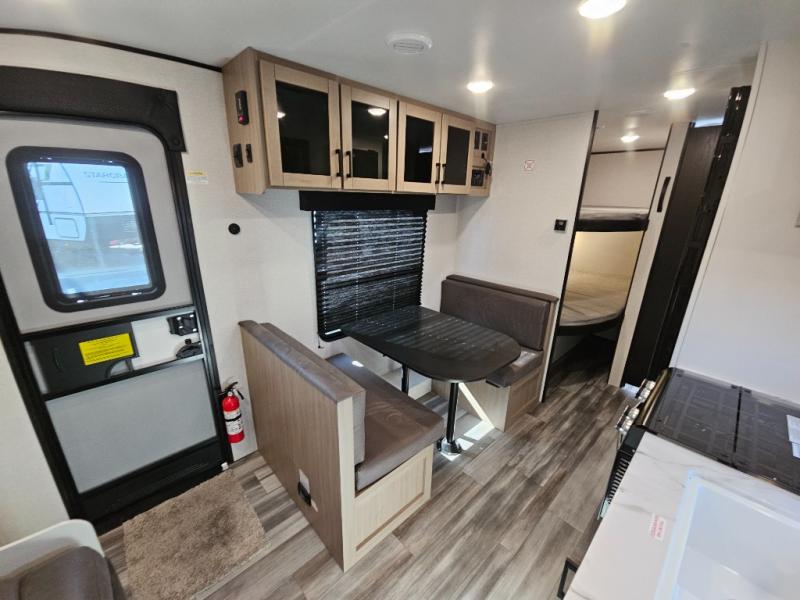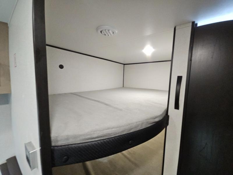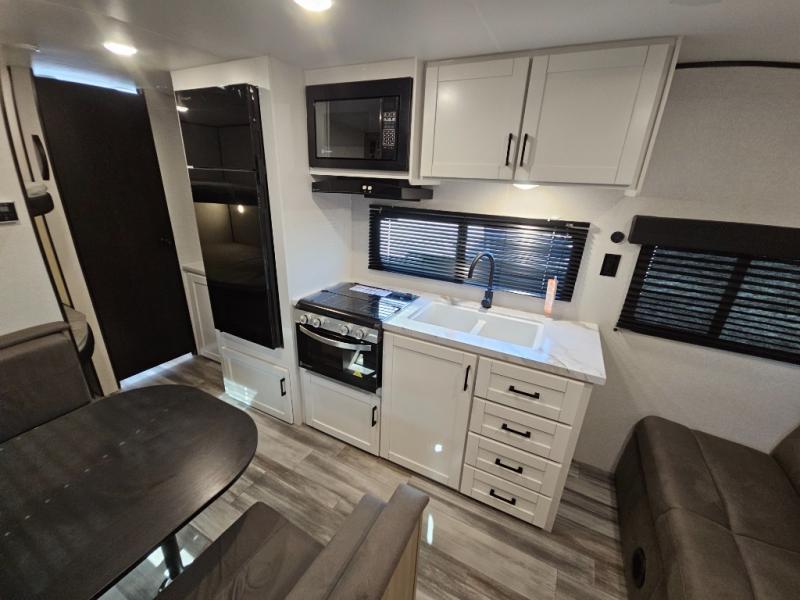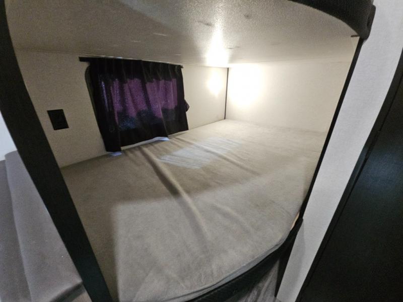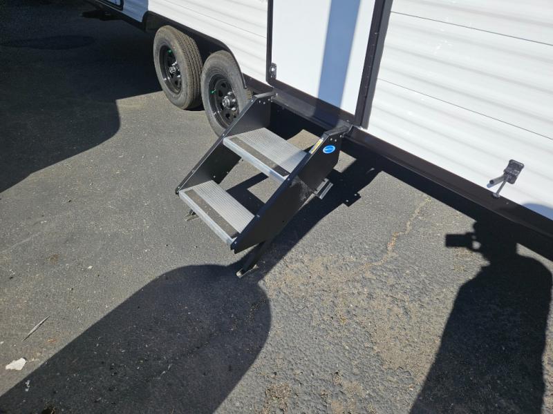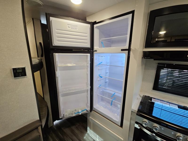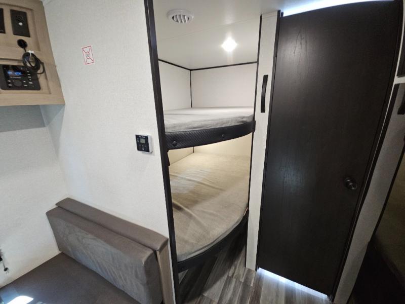 You can comfortably sleep up to eight people in this trailer thanks to the double-size bunks, the RV queen bed in the front bedroom, plus the booth dinette and jack-knife sofa in the main living area! The chef of your crew will have a three burner cooktop and microwave oven to prepare meals, and everyone can store their favorite drinks in the 8 cu. ft. 12V refrigerator. The bathroom includes a shower and a toilet, with the sink just outside of this room so others can brush their teeth if one is taking a shower before bed. The outside storage will let you bring along fishing poles and the 16' power awning with LED lights will create a nice place to gather in the evenings!