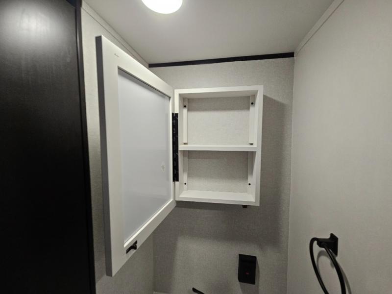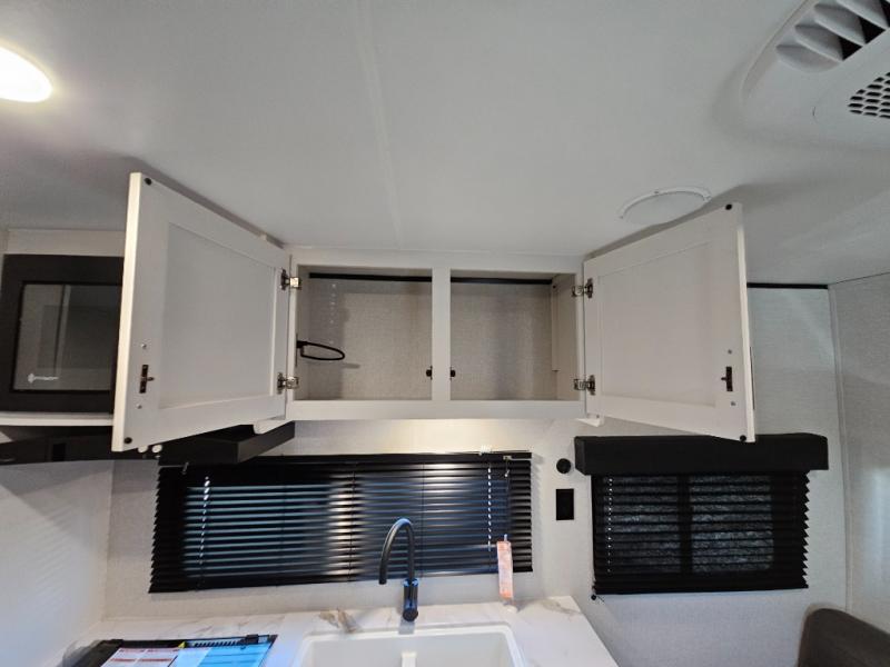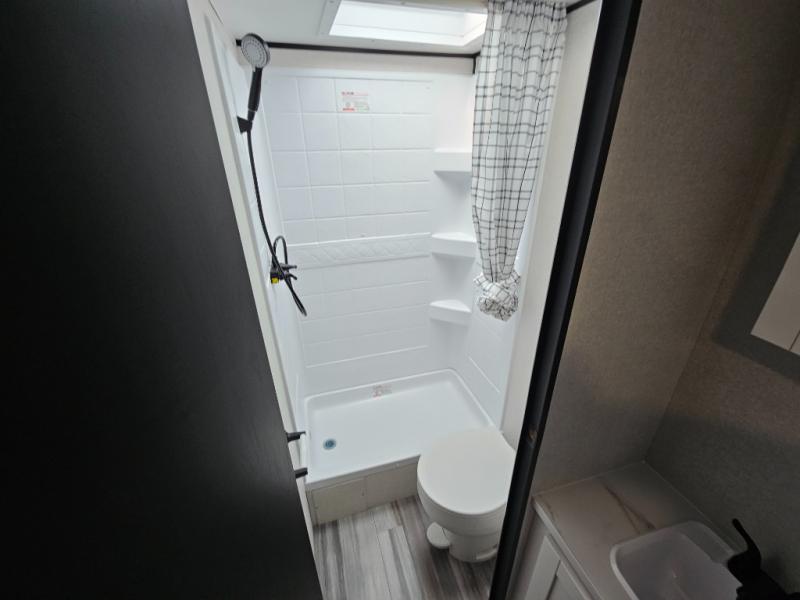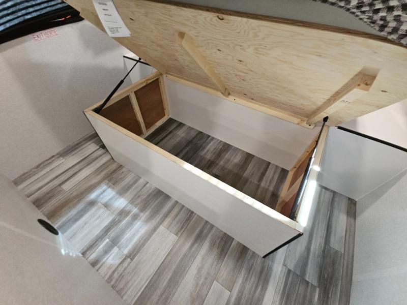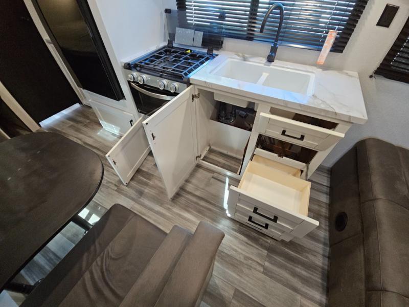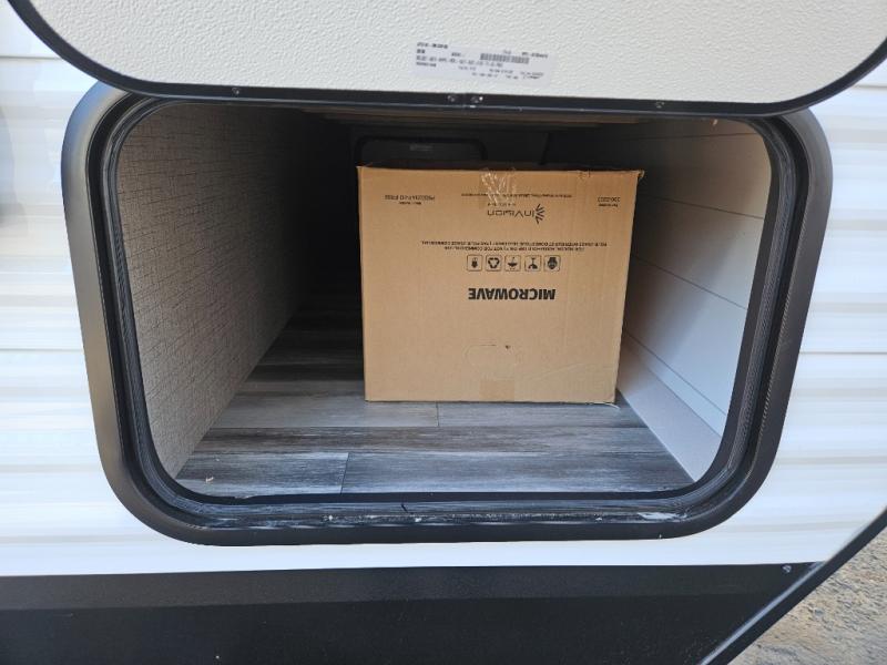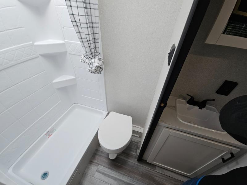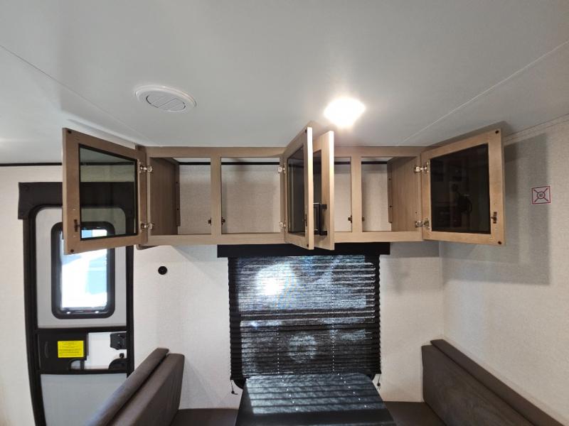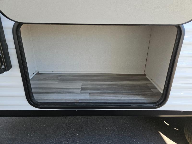 You can comfortably sleep up to eight people in this trailer thanks to the double-size bunks, the RV queen bed in the front bedroom, plus the booth dinette and jack-knife sofa in the main living area! The chef of your crew will have a three burner cooktop and microwave oven to prepare meals, and everyone can store their favorite drinks in the 8 cu. ft. 12V refrigerator. The bathroom includes a shower and a toilet, with the sink just outside of this room so others can brush their teeth if one is taking a shower before bed. The outside storage will let you bring along fishing poles and the 16' power awning with LED lights will create a nice place to gather in the evenings!