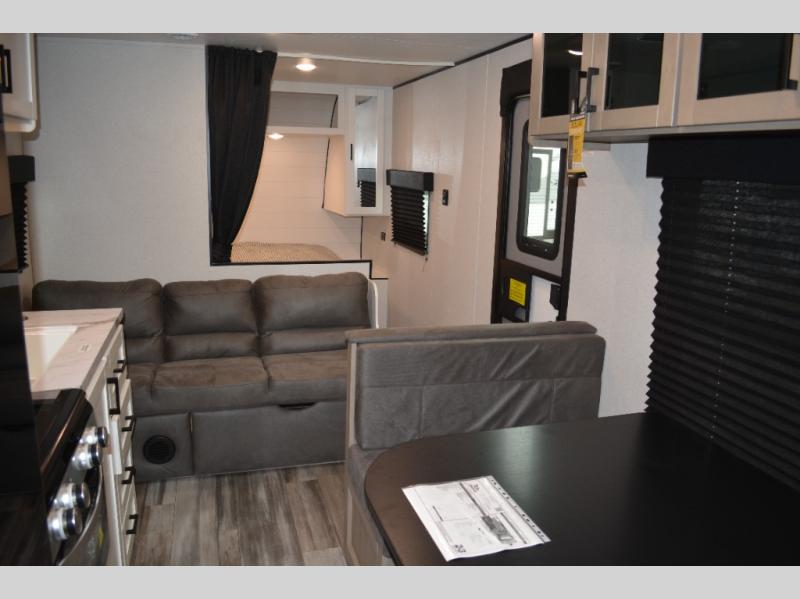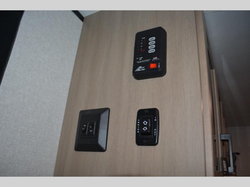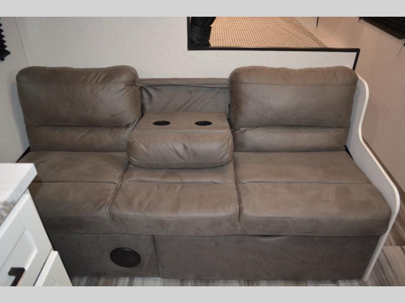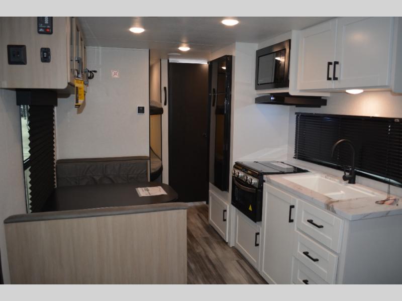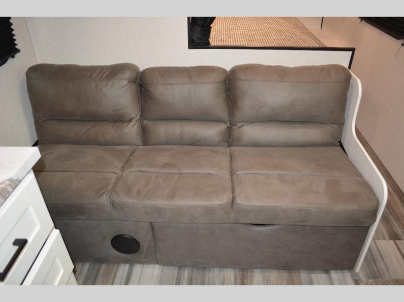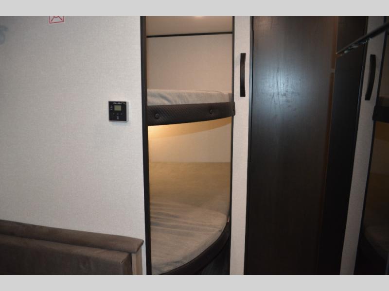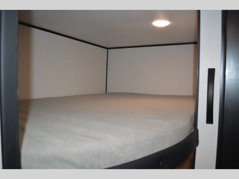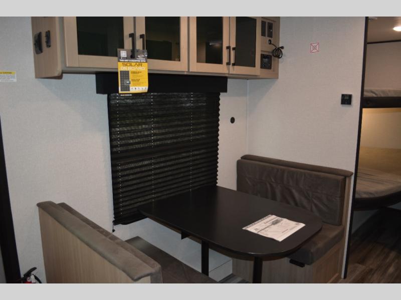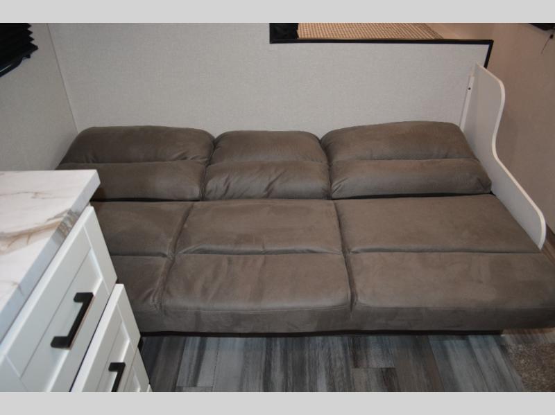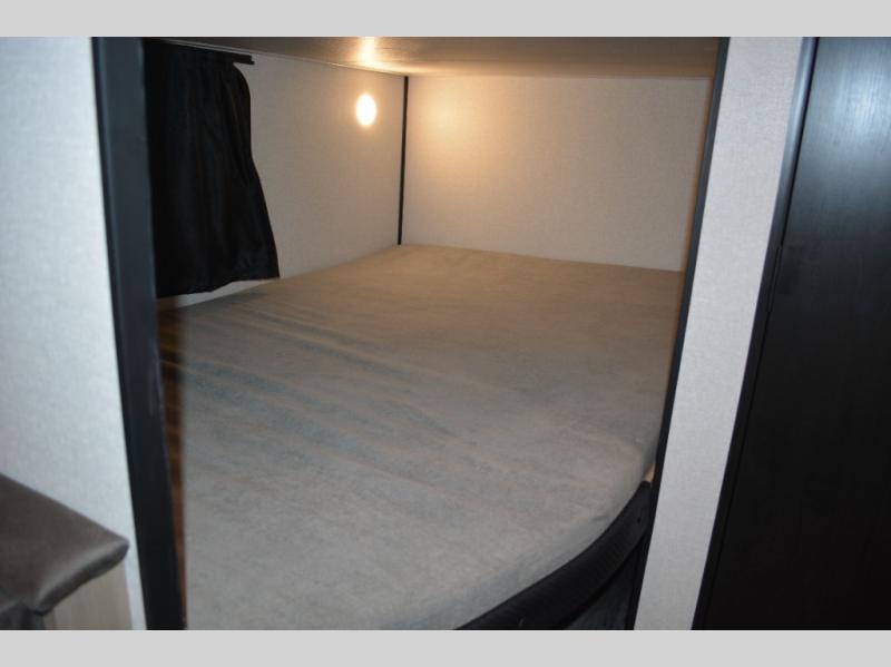 You can comfortably sleep up to eight people in this trailer thanks to the double-size bunks, the RV queen bed in the front bedroom, plus the booth dinette and jack-knife sofa in the main living area! The chef of your crew will have a three burner cooktop and microwave oven to prepare meals, and everyone can store their favorite drinks in the 8 cu. ft. 12V refrigerator. The bathroom includes a shower and a toilet, with the sink just outside of this room so others can brush their teeth if one is taking a shower before bed. The outside storage will let you bring along fishing poles and the 16' power awning with LED lights will create a nice place to gather in the evenings!