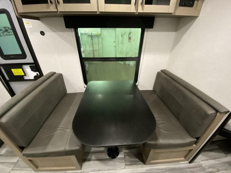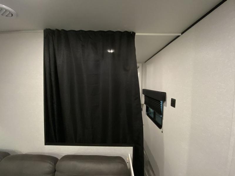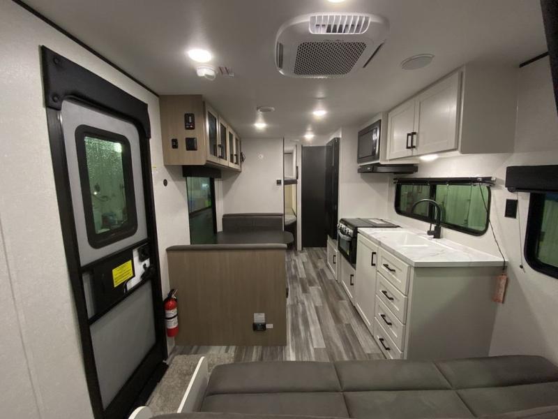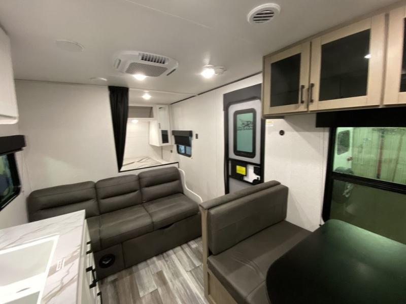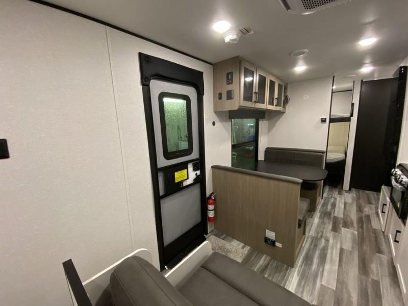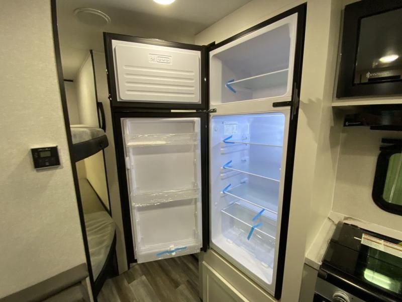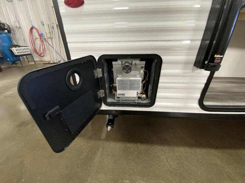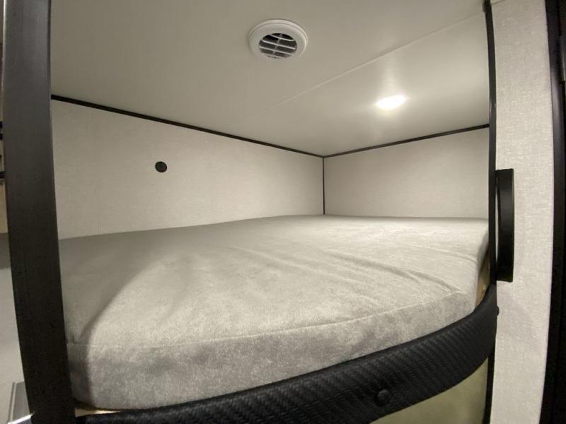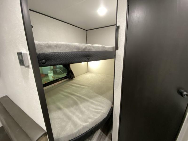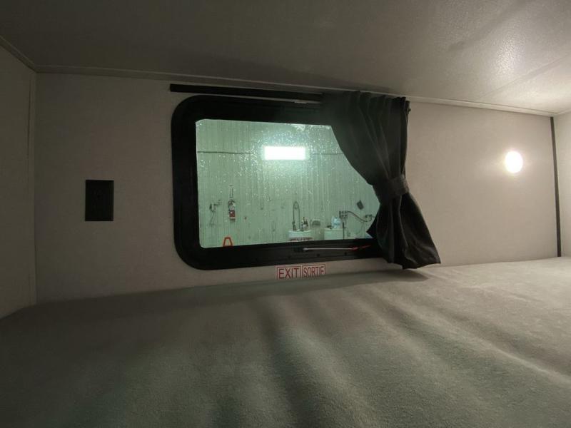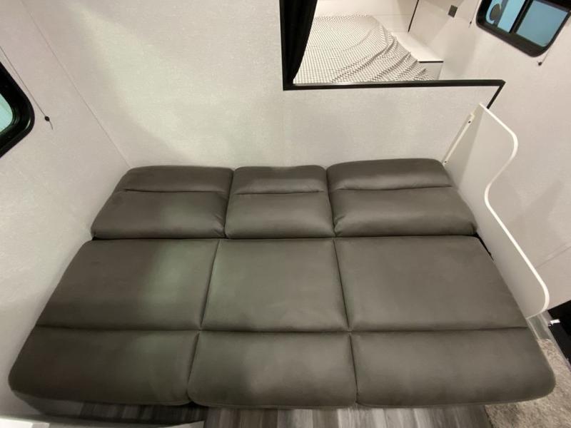 You can comfortably sleep up to eight people in this trailer thanks to the double-size bunks, the RV queen bed in the front bedroom, plus the booth dinette and jack-knife sofa in the main living area! The chef of your crew will have a three burner cooktop and microwave oven to prepare meals, and everyone can store their favorite drinks in the 8 cu. ft. 12V refrigerator. The bathroom includes a shower and a toilet, with the sink just outside of this room so others can brush their teeth if one is taking a shower before bed. The outside storage will let you bring along fishing poles and the 16' power awning with LED lights will create a nice place to gather in the evenings!