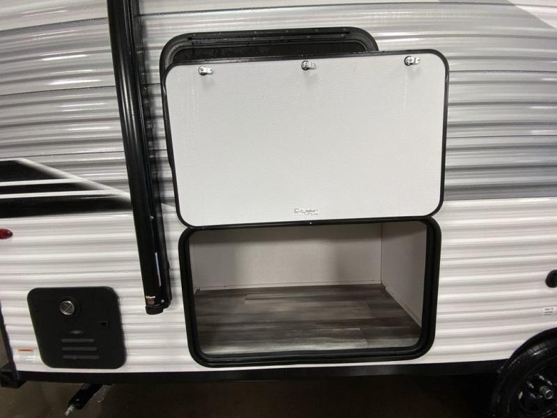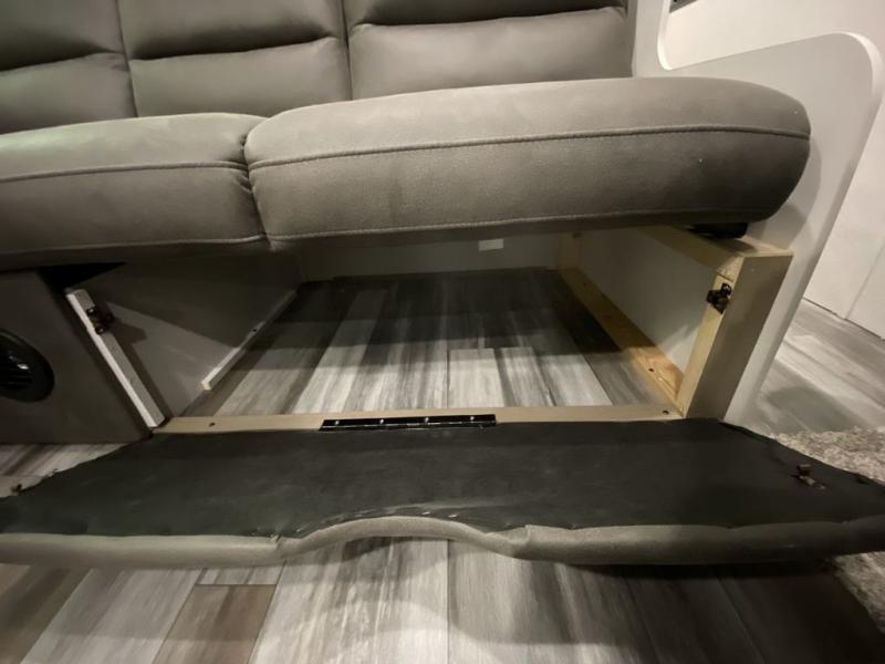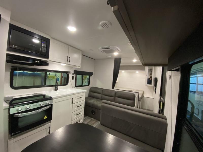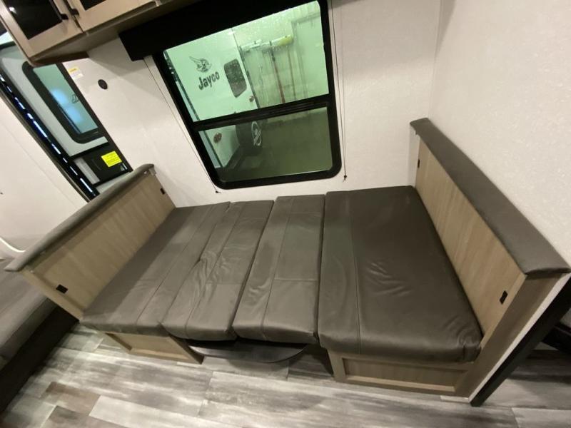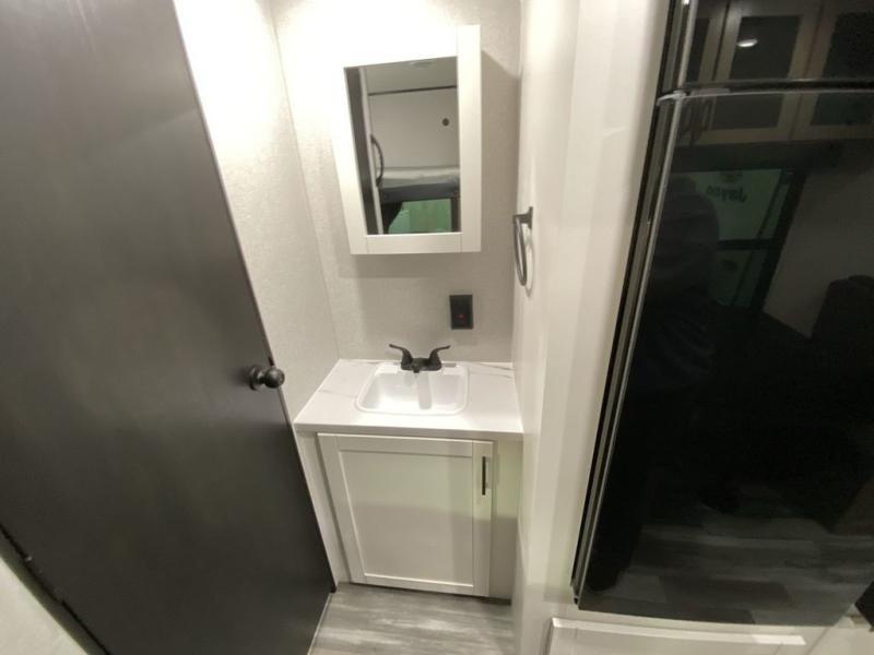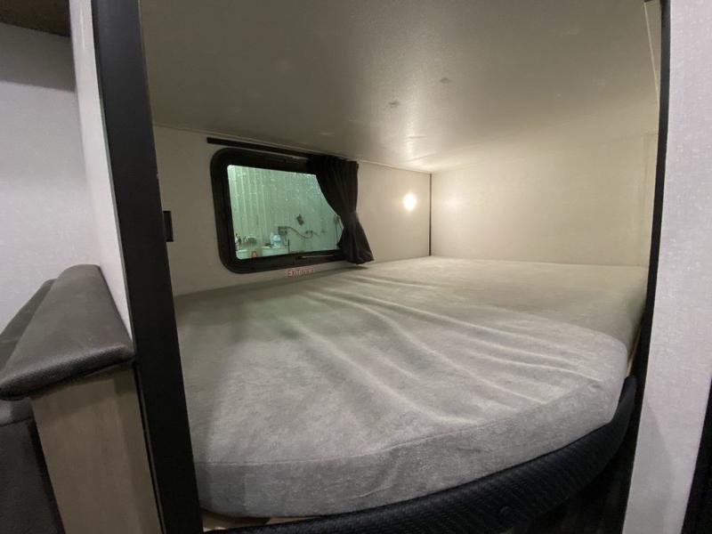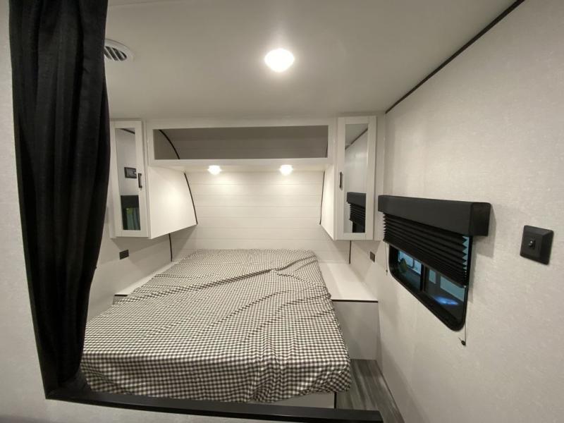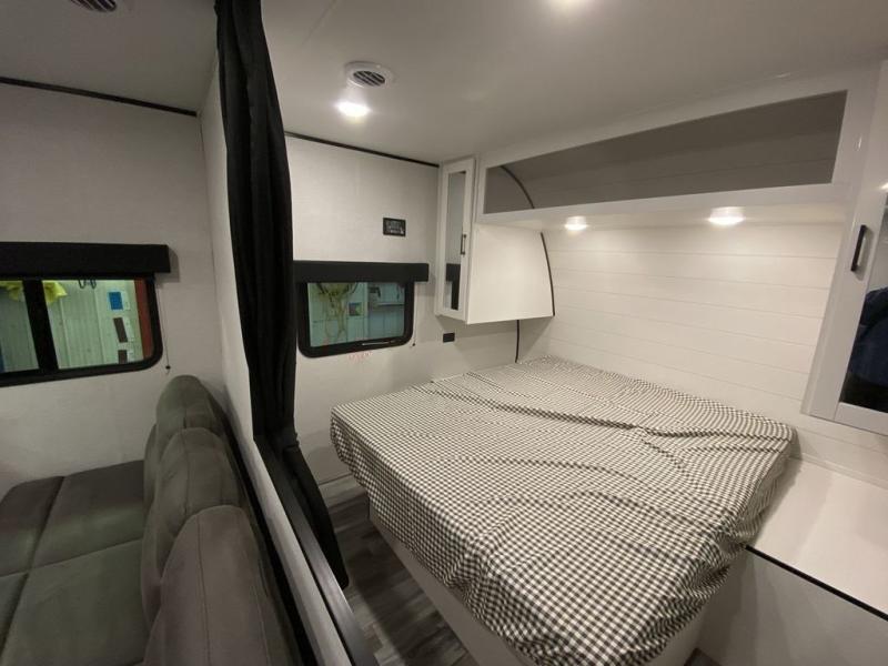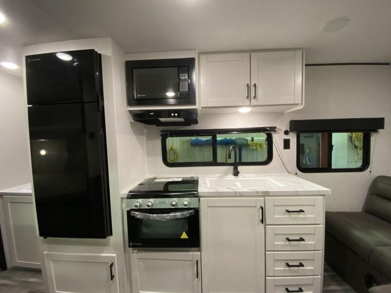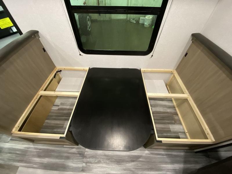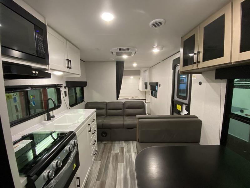 You can comfortably sleep up to eight people in this trailer thanks to the double-size bunks, the RV queen bed in the front bedroom, plus the booth dinette and jack-knife sofa in the main living area! The chef of your crew will have a three burner cooktop and microwave oven to prepare meals, and everyone can store their favorite drinks in the 8 cu. ft. 12V refrigerator. The bathroom includes a shower and a toilet, with the sink just outside of this room so others can brush their teeth if one is taking a shower before bed. The outside storage will let you bring along fishing poles and the 16' power awning with LED lights will create a nice place to gather in the evenings!