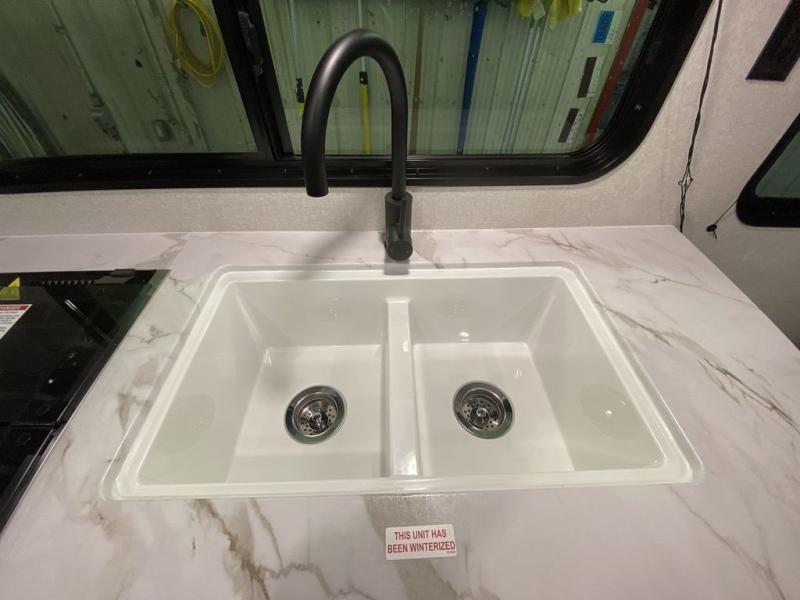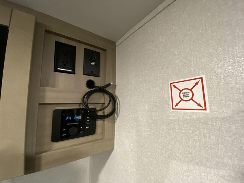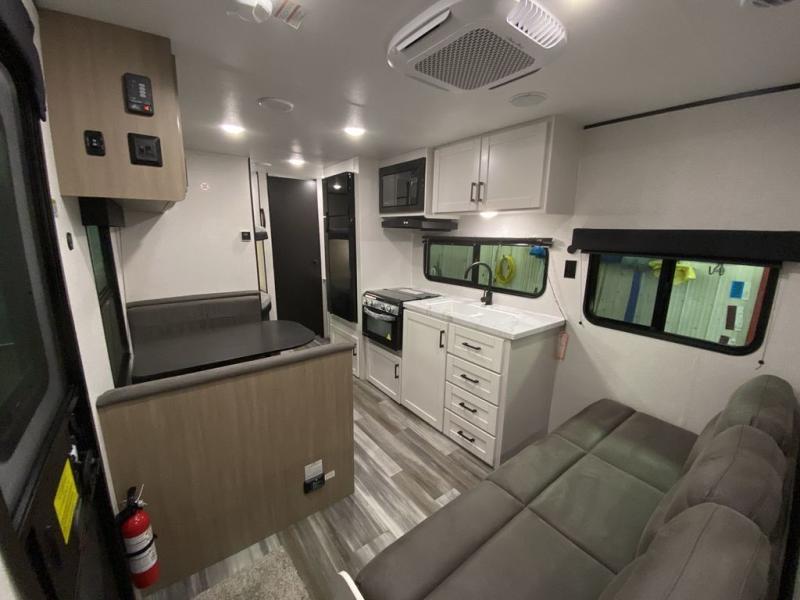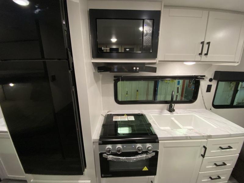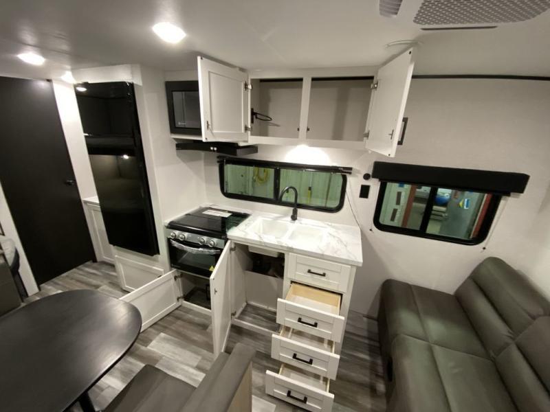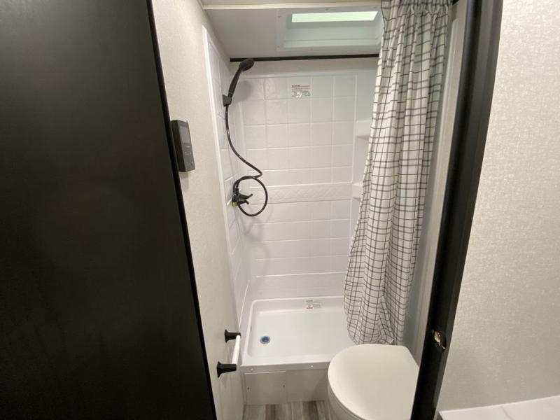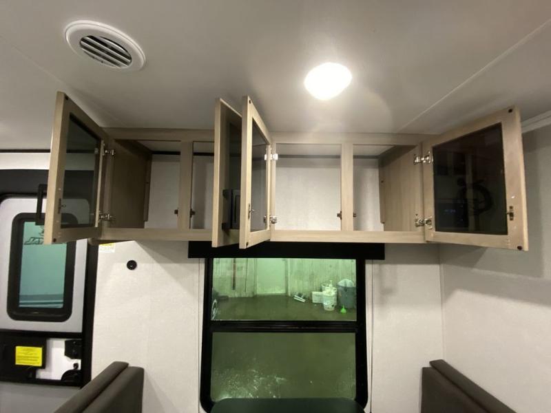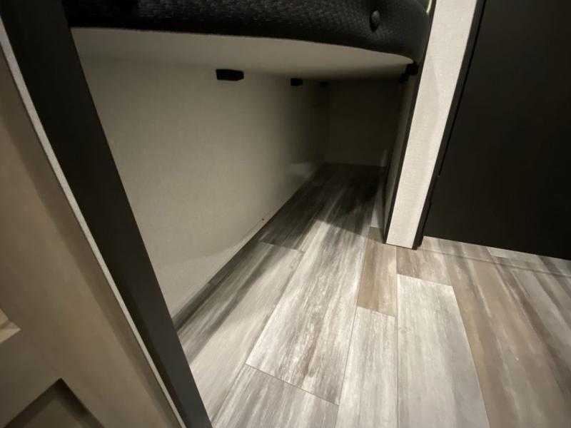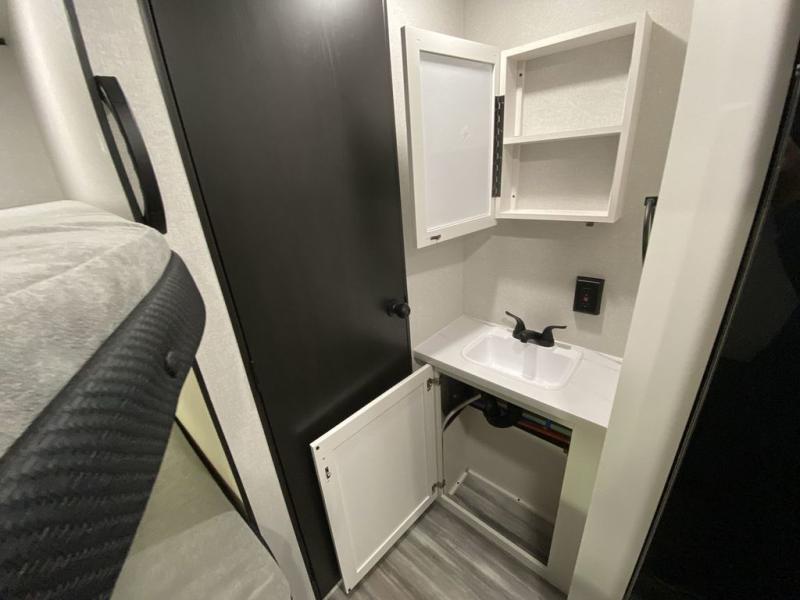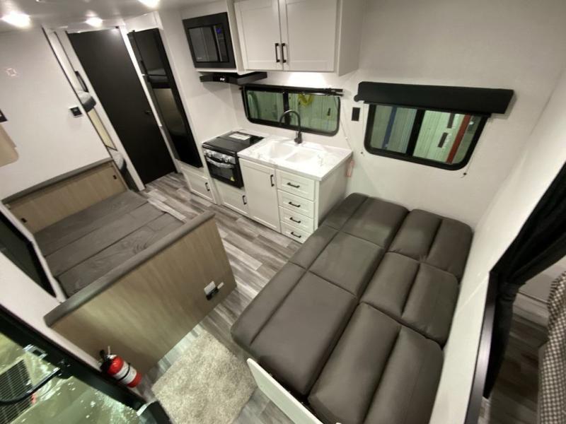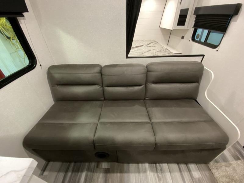 You can comfortably sleep up to eight people in this trailer thanks to the double-size bunks, the RV queen bed in the front bedroom, plus the booth dinette and jack-knife sofa in the main living area! The chef of your crew will have a three burner cooktop and microwave oven to prepare meals, and everyone can store their favorite drinks in the 8 cu. ft. 12V refrigerator. The bathroom includes a shower and a toilet, with the sink just outside of this room so others can brush their teeth if one is taking a shower before bed. The outside storage will let you bring along fishing poles and the 16' power awning with LED lights will create a nice place to gather in the evenings!